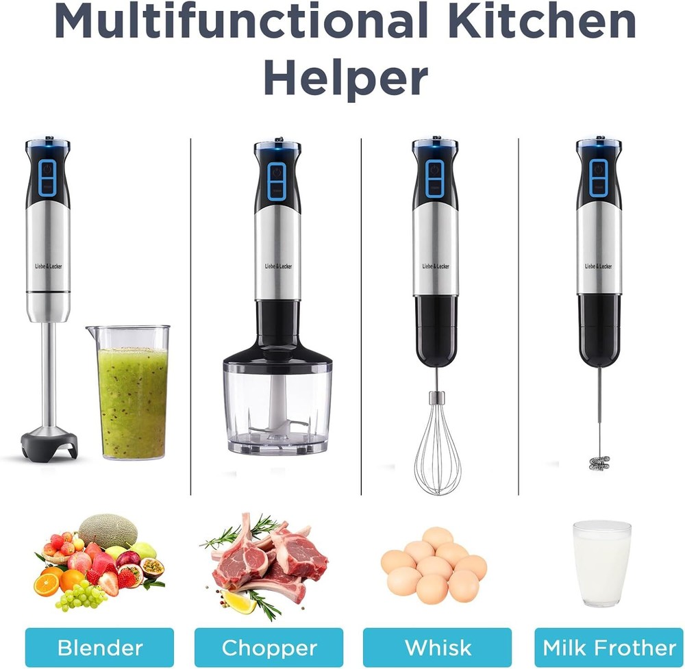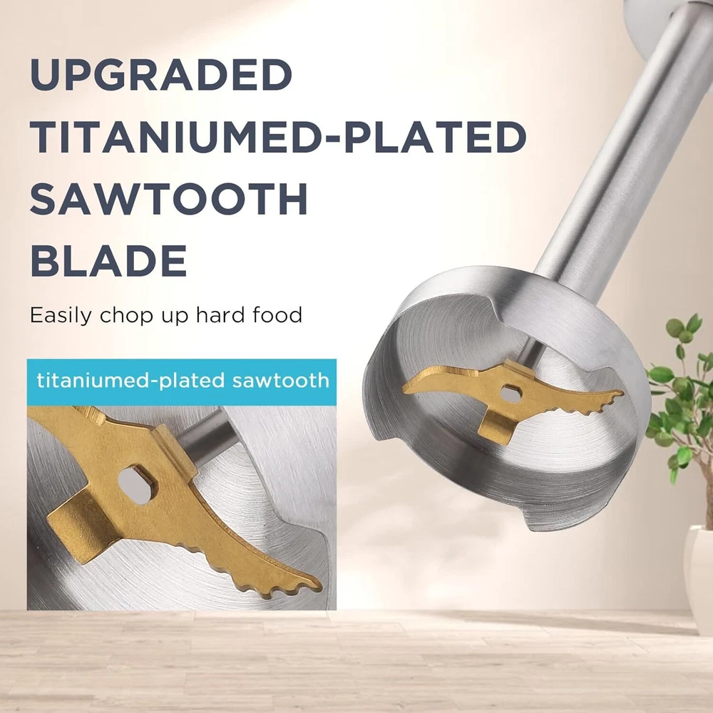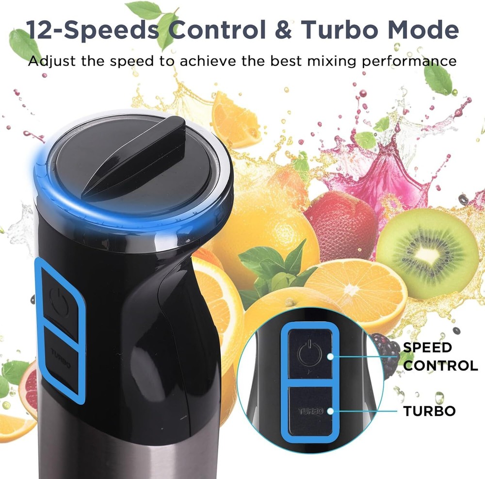Product Description Immersion Blender, 5-in-1 Hand Blender with 800W Heavy Duty Motor 12 Speeds, Hand Mixer Stick Titanium Stainless Steel Blade with Egg Whisk, Beaker, Chopper, Whisk and Milk Frother. Powerful Hand Blender: Immersion blender equipped with 800W powerful motor, which providing you a smoother and faster mixing experience. Whether you're blending ice or chopping hard ingredients, our hand blender can handle it. 5-in-1 Multifunctional: handheld blender includes a blender, 600ml(20oz) mixing beaker, 860ml(29oz) chopper , whisk attachment and milk frother. Get 5 accessories, you can make smoothies, soups, milkshakes, baby food, dips, sauces &cake batters. 12 Speeds Control: Our hand held blender has 12 speeds which give you options to choose the speeds you want. Just plug in the accessories of the hand blender you want, and rotate the control knob to the desired speed, making delicious food for your family. Titanium Stainless Steel Blades: Immersion blender equipped with upgraded cross blades which is more sharp. The titanium stainless steel blade with sawtooth allows you to easily blend tough food. Anti- Scratches pot guard: The pot guard protects your cookware when blending. It’s silicone and BPA-free food grade. All the accessories of our hand mixer stick is dishwasher safe. The motor SHOULD NOT be SUBMERGED in the water, Just wipe with a wet sponge and soap, and it'll be as good as new. About Us We are a reputable seller with many years of experience selling on eBay. Our goal is to provide high-quality products and excellent customer service. Shipping Items will be shipped within 1-3 business days when we received payment. (Orders are not processed on weekends & holidays) Tracking information will be sent once item is shipped. Delivery time depends on destination and other factors Item is shipped to ebay address. Leaving correct address can minimize delay. For international shipping and shipping to Guam, Hawaii and Alaska, Please contact us before placing the order. International buyers please note: Import duties, taxes and charges are not included in the item price or shipping charges. These charges are buyer’s responsibility. We will try our best to reduce the risk of the custom duties. Local pick-up is unavailable at the moment. Contact Us We reply any email messages within 1 business / working days(off-duty at weekend). If you do not get a response from us, then please check your junk or spam mailbox. Our Business hours: Mon-Fri 9:00-18:00, UTC/GMT +8 hours. Please contact us either by clicking "contact seller" in the "purchase history" section or simply click "ask a question" at the bottom of this page. If you are unsatisfied with our item or service, please contact us before leaving any feedback. We are committed to resolve all issues in a friendly and satisfactory manner.