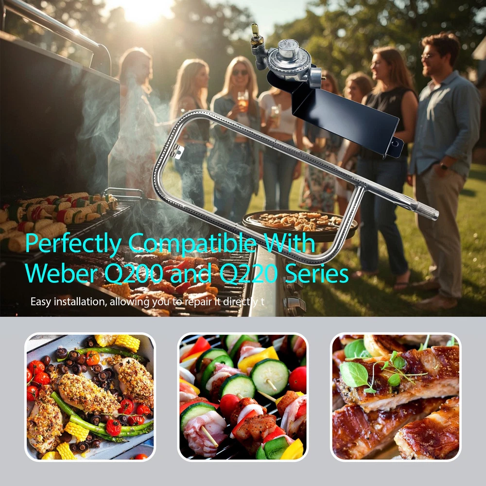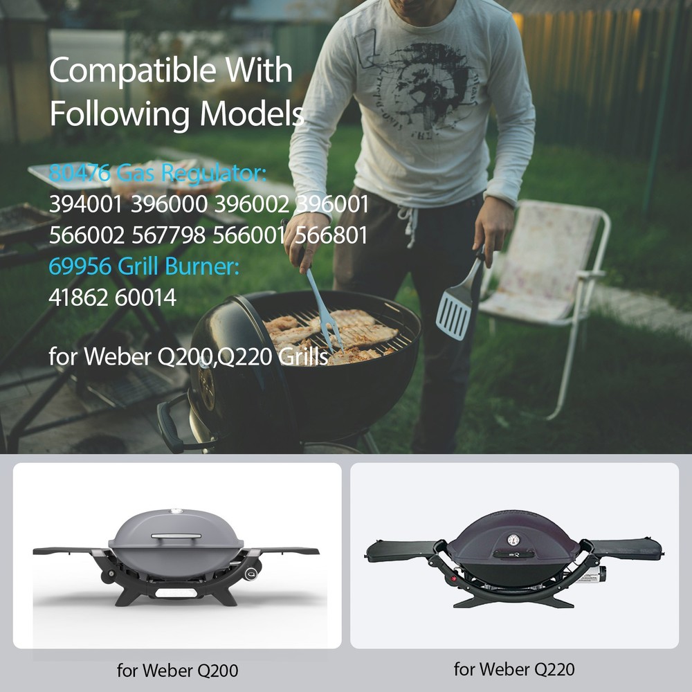 For Weber Q Grill Replacement Parts – 80476 Regulator + 69956 Burner Kit Product description 80476 Valve Regulator & 69956 Burner Replacement Kit Designed for Weber Q200 & Q220 Series Grills Compatibility: 80476 Gas Regulator replace kit fits for Weber grill part models:394001,396000,396002,396001,566002,567798,566001,566801.41862 grill burner replaces for weber parts: 69956,60041.Perfect fit for Weber Q200,Q220,Q-series portable grills Specification: Material: brass, 304 stainless steel Fitment Type: Direct Replacement With this 80476 + 69956 replacement kit, your Weber Q200/Q220 will grill like new — perfectly even heat, reliable ignition, and years of dependable service! 🍔🔥