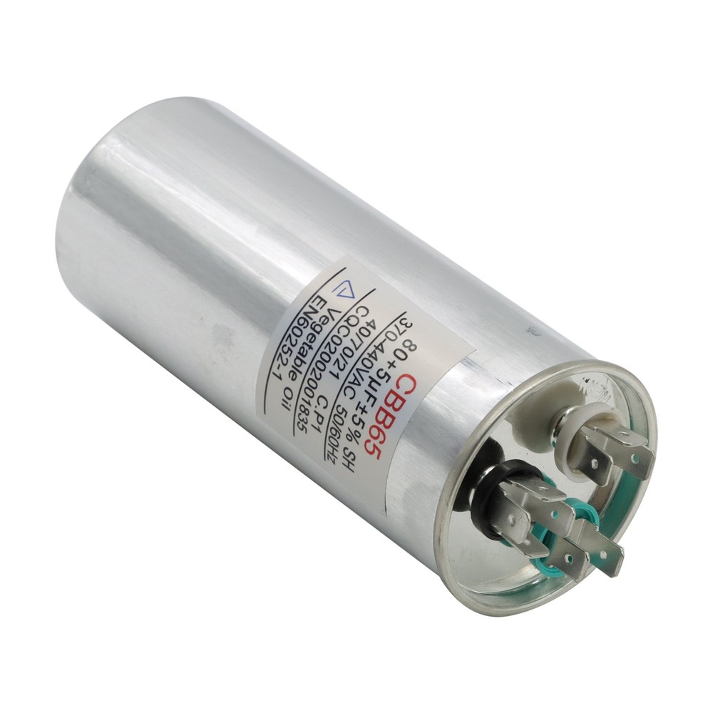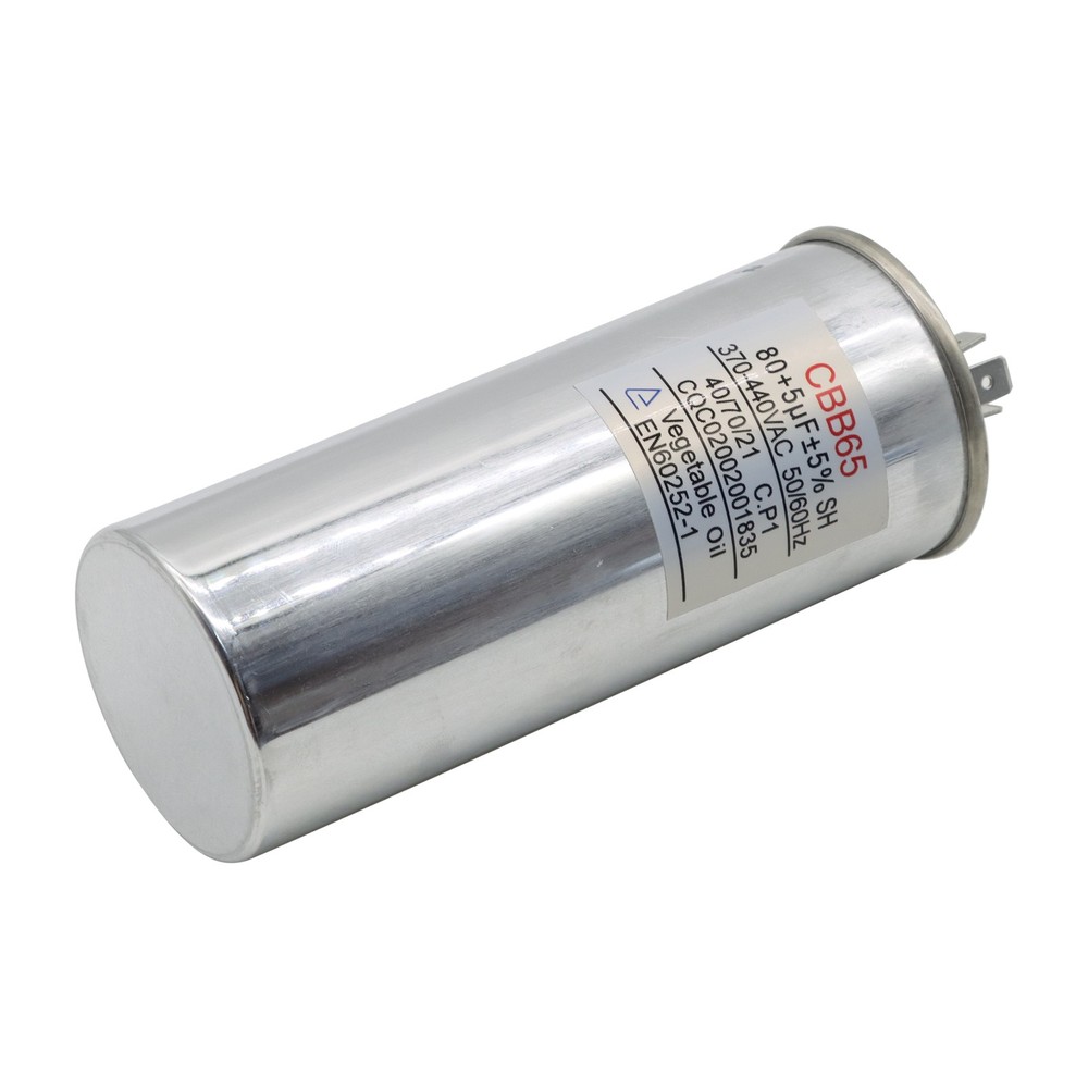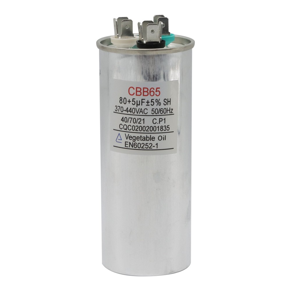 High Quality 80+5 80/5 MFD uF Motor Dual Run Capacitor 370 440 VAC CBB65-R Specification : Quantity: 1 Uf (mfd): 80/5 80+5 Voltage: 370-440 VAC Frequency: 50/60 Hz Tolerance: +/- 5% Capacitor type: Oil-filled (vegetable oil) Format: Round Construction Style: Aluminum w/ Steel Cap Overall Height (mm.): 125mm without cap tip Diameter (mm.): 50mm Terminal Type: 1/4 in. Quadruple QCT
