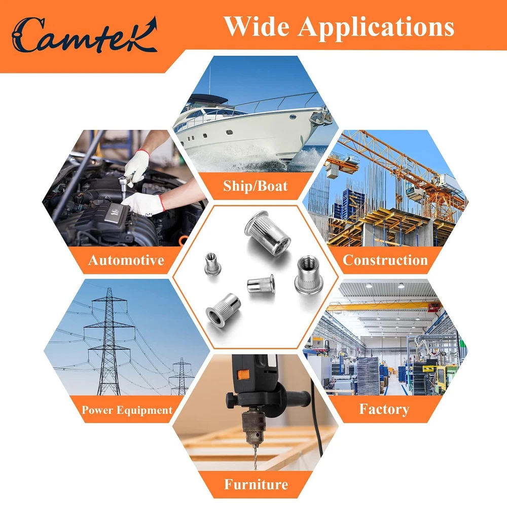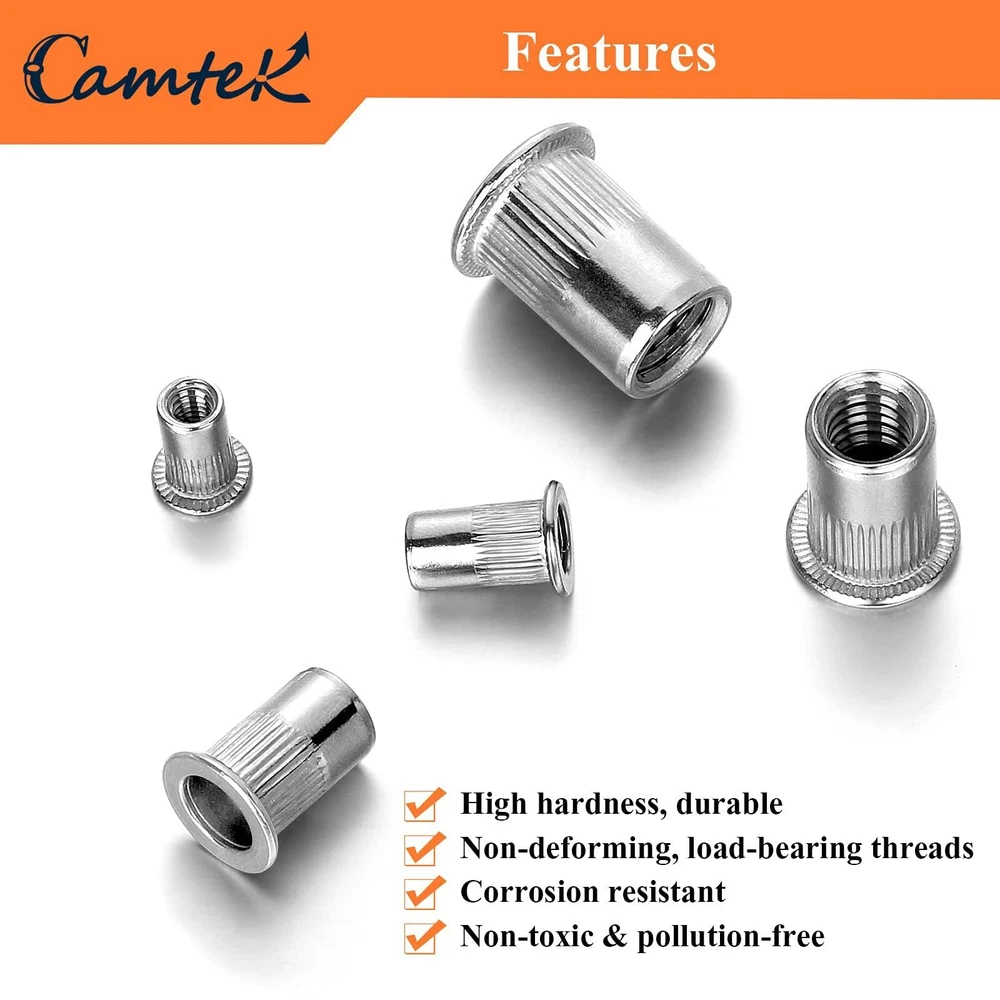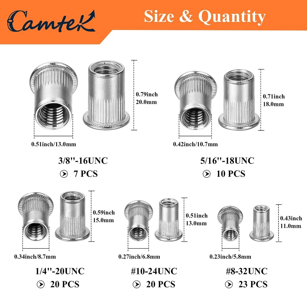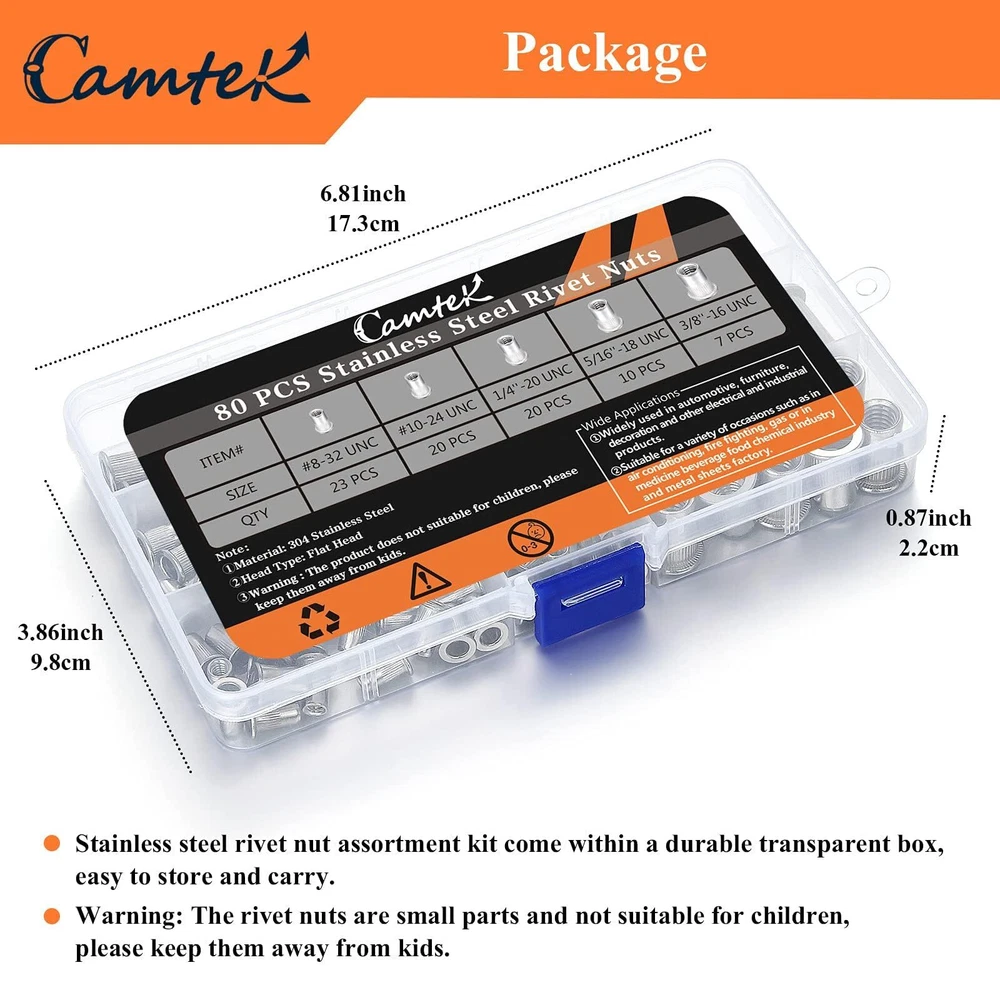 80PCS Stainless Steel Rivet Nuts Kit - 5 Sizes ----Our rivet nuts kit is usually applicated in various metal sheets, pipes and other manufacturing industries. It is widely used in the assembly of electromechanical and light industrial products such as automobiles, aviation, railways, refrigeration, elevators, switches, instruments, furniture, and decoration. SPECIFICATIONS: ●Material: 304 stainless steel ●Color: Silver tone ●Type: Flat head, knurled body ●Sizes: Thread -------------- Diameter -------------- Length -------------- Quantity #8-32UNC ------------ 0.23'' ------------------- 0.43'' ----------------- 23pcs #10-24UNC ---------- 0.27'' ------------------- 0.51'' ----------------- 20pcs 1/4''-20UNC ---------- 0.34'' ------------------- 0.59'' ----------------- 20pcs 5/16''-18UNC -------- 0.42'' ------------------- 0.71'' ----------------- 10pcs 3/8''-16UNC ---------- 0.51'' ------------------- 0.79'' ------------------ 7pcs FEATURES: ☑High hardness, durable ☑Non-deforming, load-bearing threads ☑Corrosion resistant ☑Non-toxic & pollution-free SMALL TIPS: ●All dimensions are measured manually, there may be measurement errors, please don't mind. ●The product are small parts and not suitable for children, please keep them away from kids. PACKAGE: 1 x 80pcs stainless steel rivet nuts nutsert assortment kit with a plastic case HIGH QUALITY: rivet nuts are made of stainless steel, strong rust and corrosion resistant for a long time use; anti-oxidation, healthy and lead-free, high strength, non-deforming, load-bearing threads WHAT YOU GET: 80pcs stainless steel rivet nuts with 5 sizes in a durable transparent box, it includes: 23pcs #8-32UNC, 20pcs #10-24UNC, 20pcs 1/4''-20UNC, 10pcs 5/16''-18UNC and 7pcs 3/8''-16UNC. Ideal rivet nut assortment kit to meet your multi-needs WIDE APPICATIONS: The rivet nuts kit is usually applicated in various metal sheets, pipes and other manufacturing industries, and widely used in automotive, furniture, decoration and other electrical and industrial products WARNING: All dimensions are measured manually, there may be measurement errors, please don't mind. The product are small parts and not suitable for children, please keep them away from kids DESIGN: Rivnut are designed with flat head vertical threads, with flat and deep threads for easy fixing and anti-slip effect, making them easier to handle and install