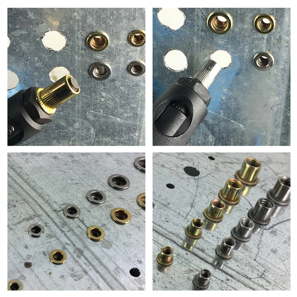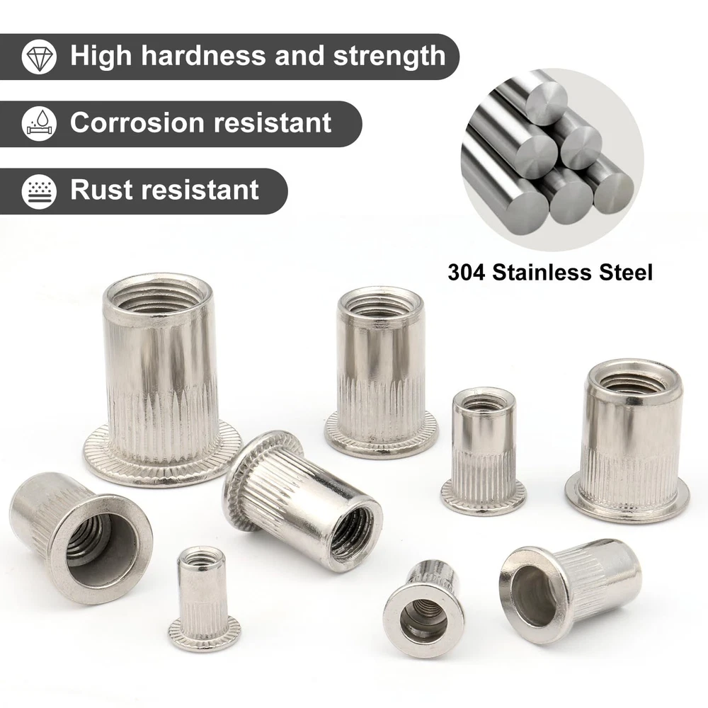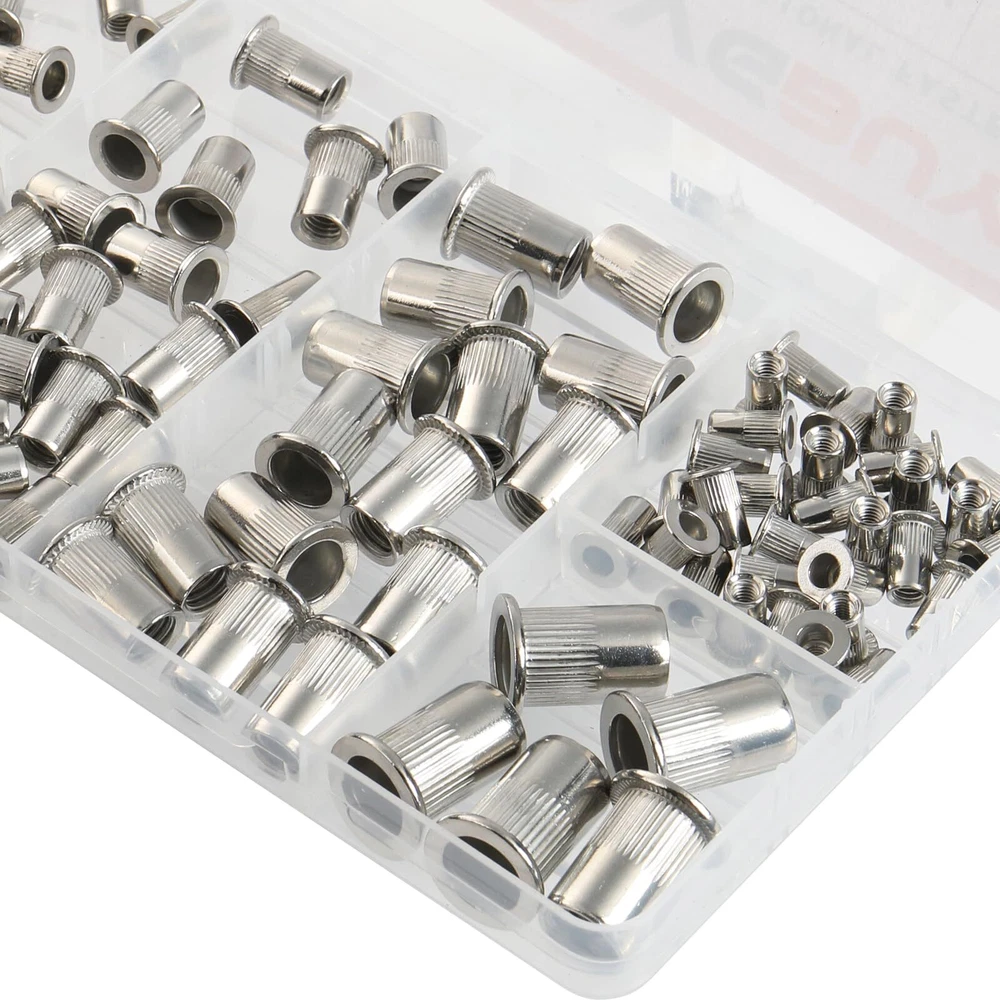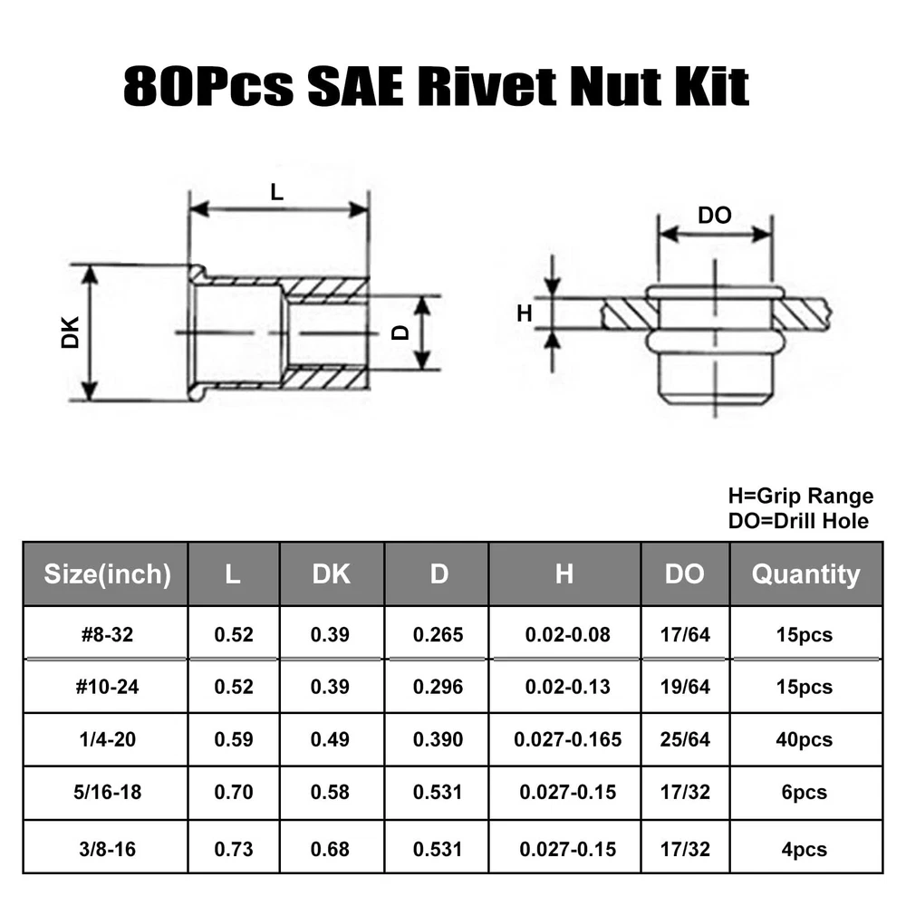 Cost-effective Rivet Nut kit:This rivet nut set includes 80pcs rivet nuts in the most commonly needed SAE sizes: 8-32*15PCS, 10-24*15PCS, 1/4-20*40PCS, 5/16-18*6PCS, 3/8-16*4PCS; 5 different sizes to help you deal with a wide range of fasteners. High Quality Materials: rivnuts kit is made of 304 stainless steel, strong rust ,corrosion resistant, high strength, and non-deforming for a long time use. Easy to Install: The nutsert makes attachments easy without welding or adding heat. Our rivet nuts crushes easily even with a mini installer and it has large grip area for various thickness of metals, making installing fast and easy. Wide Application: The nutsert set makes long lasting seams and joints,suitable for the fastening field of various metal plates and pipes and other manufacturing industries.Widely used in assembly of electromechanical and light industrial products such as automobiles, elevators, switches, instruments, furniture, and decoration. Convenient Threaded Rivets: These riv nuts kit comes with a tight and durable case, which is lightweight, very convenient to carry and keep. And the thickened storage box is durable enough to accommodate all items safely.