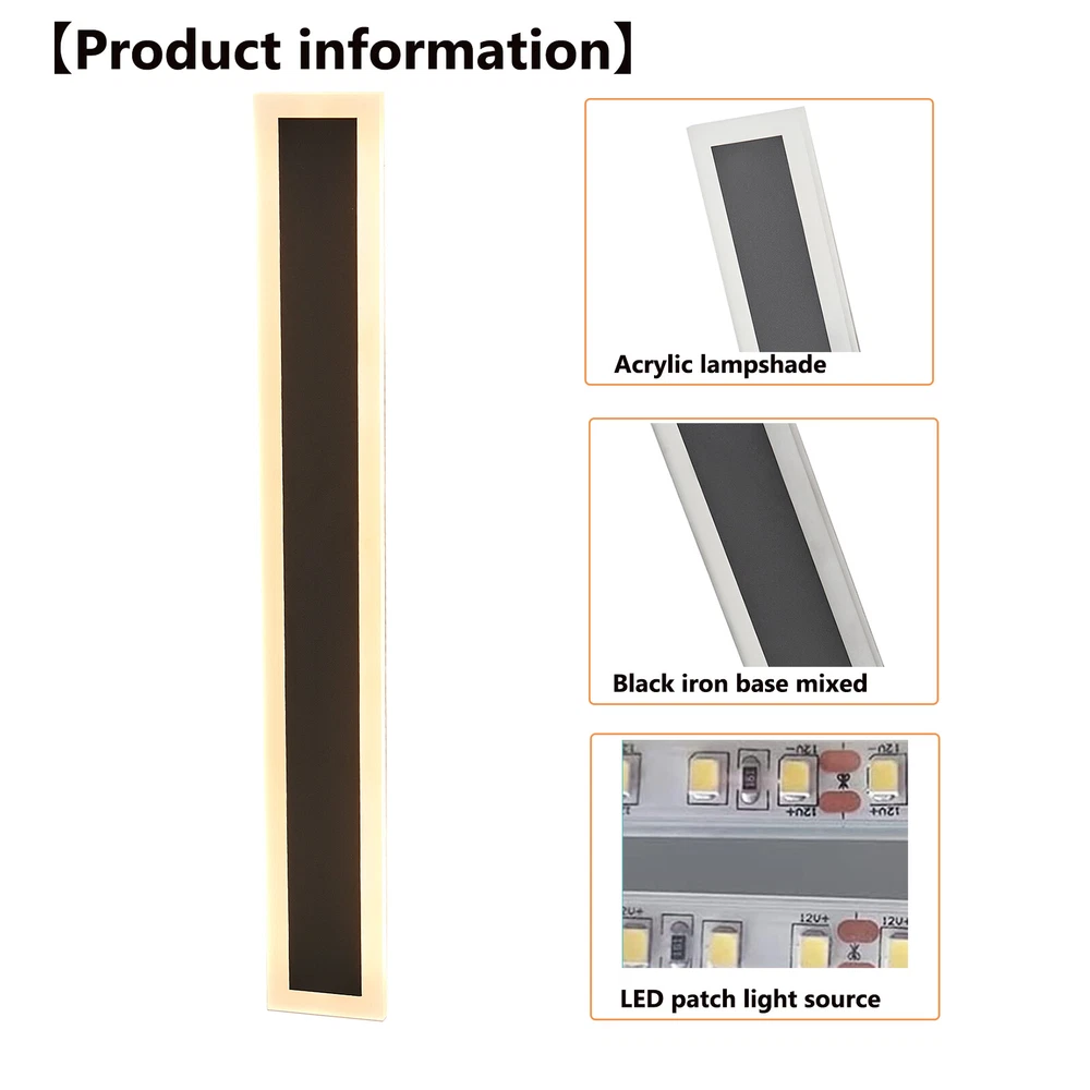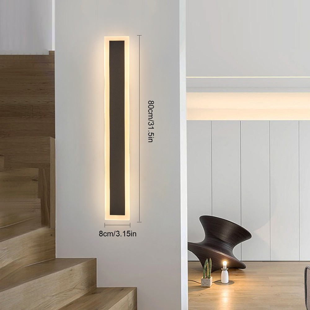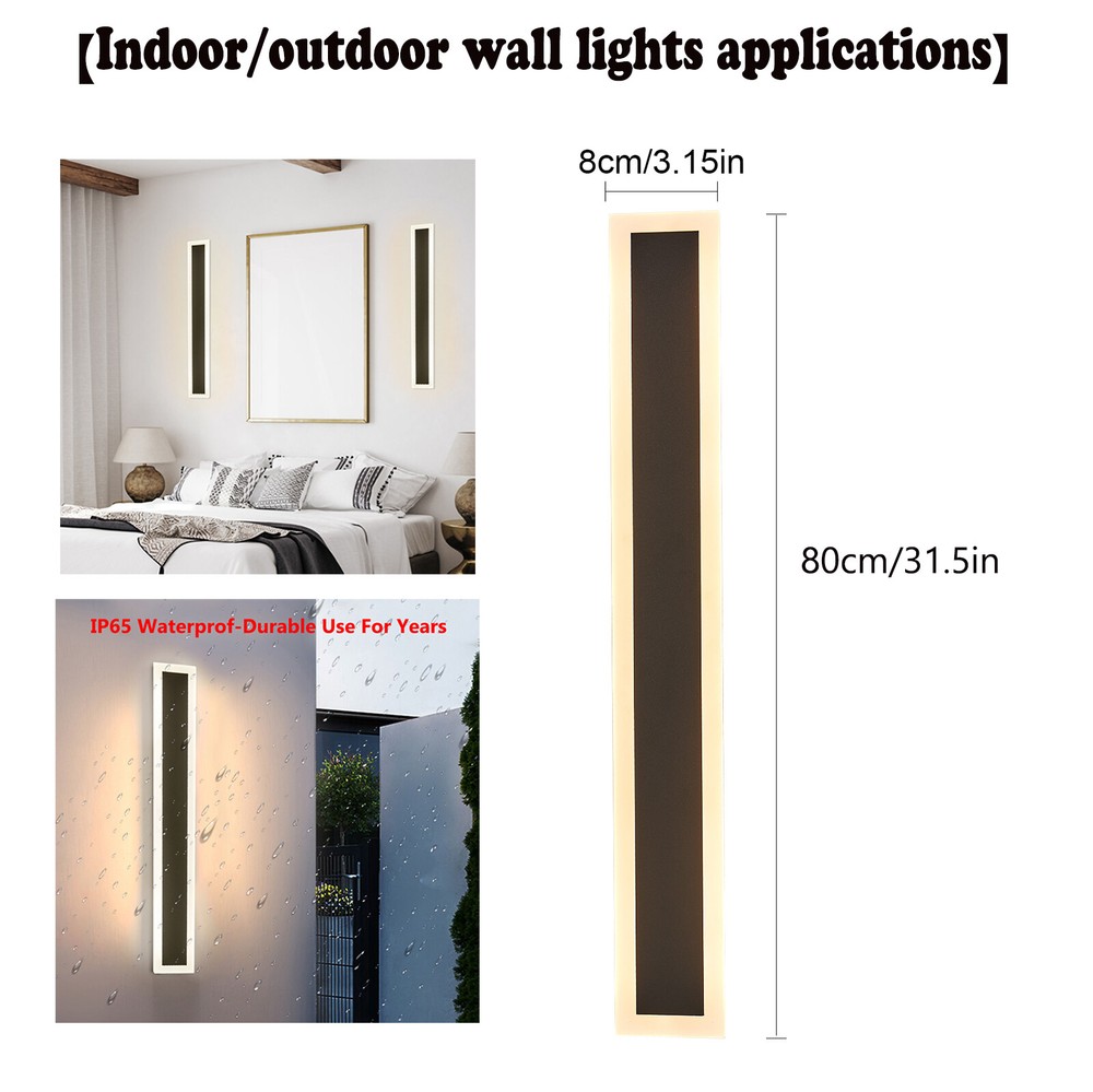 LED Wall Light 80cm Waterproof Outdoor Modern Lamp Exterior Lights Long Strip Description This wall lamp has an acrylic shade and an iron base with a high-temperature painting treatment, making it anti-rust, waterproof, and corrosion-resistant to be used indoors and outdoors. With its elegant appearance and exquisite design, this wall lamp can not only illuminate your doorway but also play a decorative role. Choose our wall lamp, you can have a warm guardian that guards your home every night. Key Features Premium Material: This wall lamp consists of an iron base with high-temperature painting treatment and high-quality acrylic shade, making it anti-rust, corrosion-resistant, and not easy to oxidize. Enjoy Your Night: With this wall lamp installed on your porch, you can enjoy the moonlight as night falls, have a tea/coffee time for relaxation and play snow with your family or friends under the lighting from this wall lamp after dinner, just like a close friend who accompanies you. Elegant Appearance: A black iron base mixed with white shade elevates the wall lamp to the epitome of simple but stylish that fits any decor, adding elegance and beauty to your porch. Considerate Design: The long LED wall lamp will produce soft and romantic light at 3000k color temperature without flickering to protect your eyes. High Waterproof Performance : Its IP65 grade waterproof allows for a wide application and long service life. You can use it indoors or outdoors. Flexible Installation : You need to connect the wire reserved on the wall to install this wall lamp horizontally and vertically. And you can do a DIY installation with more than one of these products. Easy to Clean: Due to its smooth surface with high-temperature painting treatment, you can wipe the dirt from it with a cloth. Ideal Gift: Thanks to its exquisite design, elegant appearance, and great lighting effect, you can choose this wall lamp as a gift for housewarming to your friends. Protective Package: To prevent the product from being damaged and bumped during transportation, we packed it with foam to protect your products to the maximum extent possible. Details Sturdy Base: The rectangular black base of 1.81*1.18 inches in size ensures stable support for the light body and present classic beauty. LED Chip: The 18W LED light source has high luminous efficiency, low calorific value, and long service life, making it energy-saving and safe to use. You also don't need to install the bulbs. Application It is suitable for aisles, garages, porches, patios, front doors, hallways, doorways, verandas, courtyards, entryways, corridors, backyards, sunrooms, bathrooms, sheds, and any other indoor/outdoor places. And its illumination area is about 161.4-215.3ft². How to Install Cut off the power. Drill a small hole in the wall. Fix the hanging bracket with the included self-tapping screws. Connect live, neutral, and ground to main power. Fasten the wall lamp to the bracket on the wall with black screws. Turn on the power and turn on the lights. Specifications Model: CT03 Color: Black, White Material: Iron, Acrylic Process: High-temperature Painting Shape: Rectangle Feature: Waterproof Mounting Type: Wall-mounted Installation: Hard-wired Room Type: Entryway, Garage, Porch Usage: Indoor&Outdoor Use Power Source: AC, Corded-electric Light Fixture Form: Wall Sconce Lighting Method: Downlight Light Source: 18W LED Chip Efficiency: E Lifespan: 50,000H Voltage: 90-260V Lumen: 3250Lumen Color Temperature: 3000K Warm Light Illumination Area: 15-20m²/161.4-215.3ft² Base Size (L*W): 4.6*3cm/1.81*1.18inch Product Size (L*W): 80*8cm/31.5*3.15inch Package Included 1* Wall Lamp Other Accessories for Assembly Notes Please check the size of the lamp before purchasing, and compare the specific conditions of the installation location to see if it is appropriate. It's best to space them 6 to 8 feet apart and not near other light sources (such as streetlights) to ensure a good lighting effect. Please cut off the power before installation. It is recommended to be installed by a professional electrician. It is waterproof, but it cannot be soaked in water. The wall lamp is not dimmable. It is directly wired for use. Please allow the slight color difference caused by the shooting light and 1-3cm error due to manual measurement, and make sure you do not mind before you order. Payment Delivery details Terms of sales About us Contact us Payment We accept ebay payment 。 Fees such as import duties, taxes are not included in the item price or shipping costs. These charges are the buyer's responsibility. Delivery details Shipping: 2-9 working days to: USA Terms of sales We maintain high standards of excellence and strive for hundred percent customer satisfaction. Feedback is very important to us. We hope that you contact us immediately before you give neutral or negative feedback, so that we can address your concerns. It is impossible to address issues if we do not know about them! About us Your satis faction is our ultimate goal. We work hard to earn your trust and future business. Our certified technicians have tested each item before shipping. The unit comes with 1 year limited warranty on all manufacturing defects. a) If you receive a defective item, you may return it or ask for a discount. Please contact us within 14 days after you receive the package. b) What you returned must be intact and in its original packaging as re? u. Customer is responsible for shipping costs of the returned item. c) We will cover the cost of shipping back t with the shipping rate indicated in the registration page. We will send you a new unit or refund the full payment you paid. Thank you. Contact us Business Hour Business Hour: Monday To Friday: 8:30 AM to 5:00 PM (Beijing China time) Due to time zones, our reply to your questions may not be immediately. But within above working time, we will reply your email within 24 hours. If it's non-workdays, please kindly be patient and wait till Monday. P