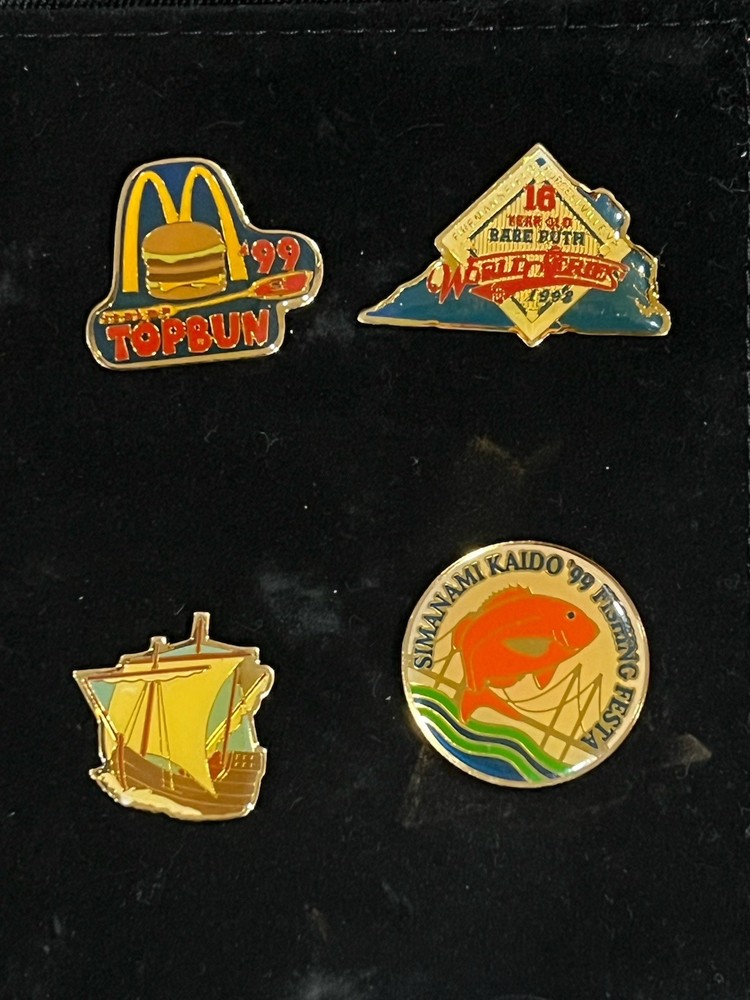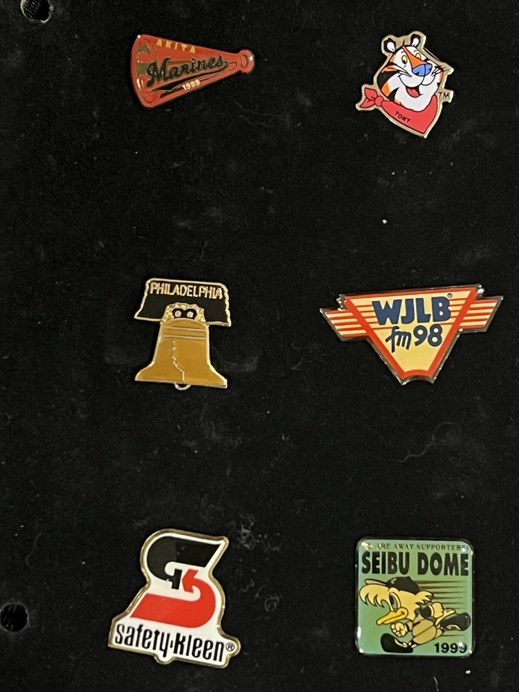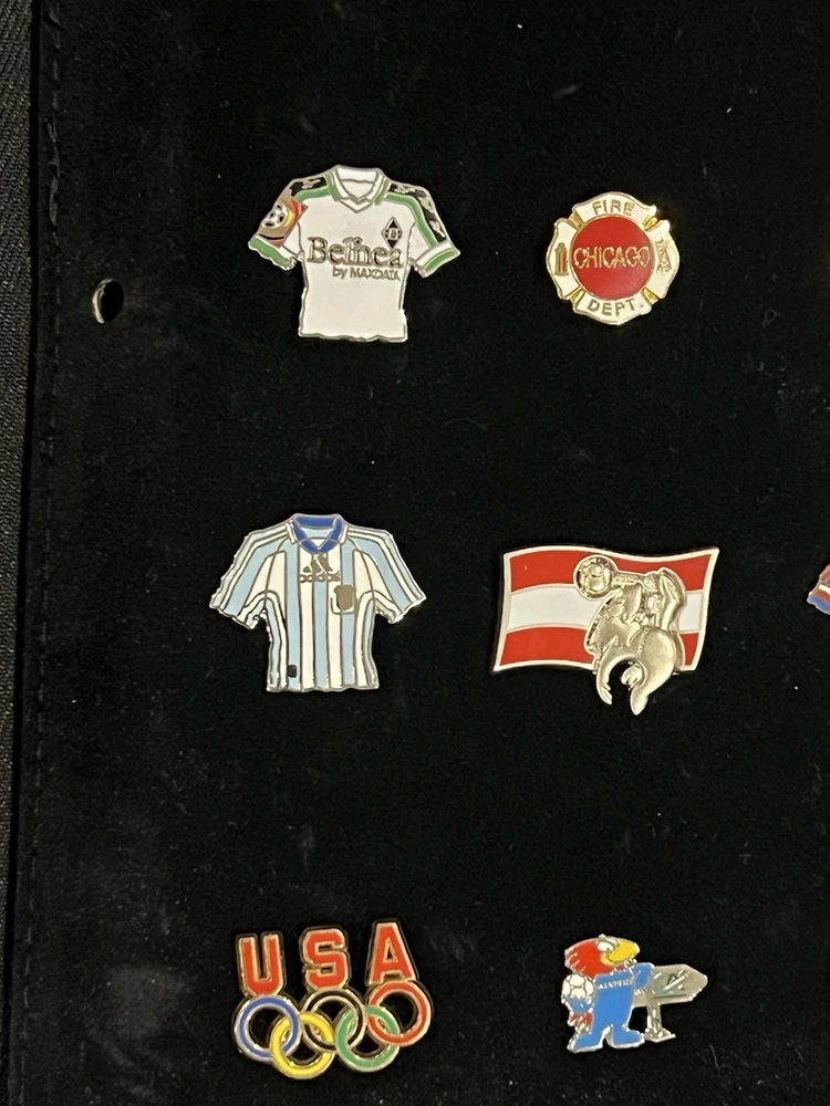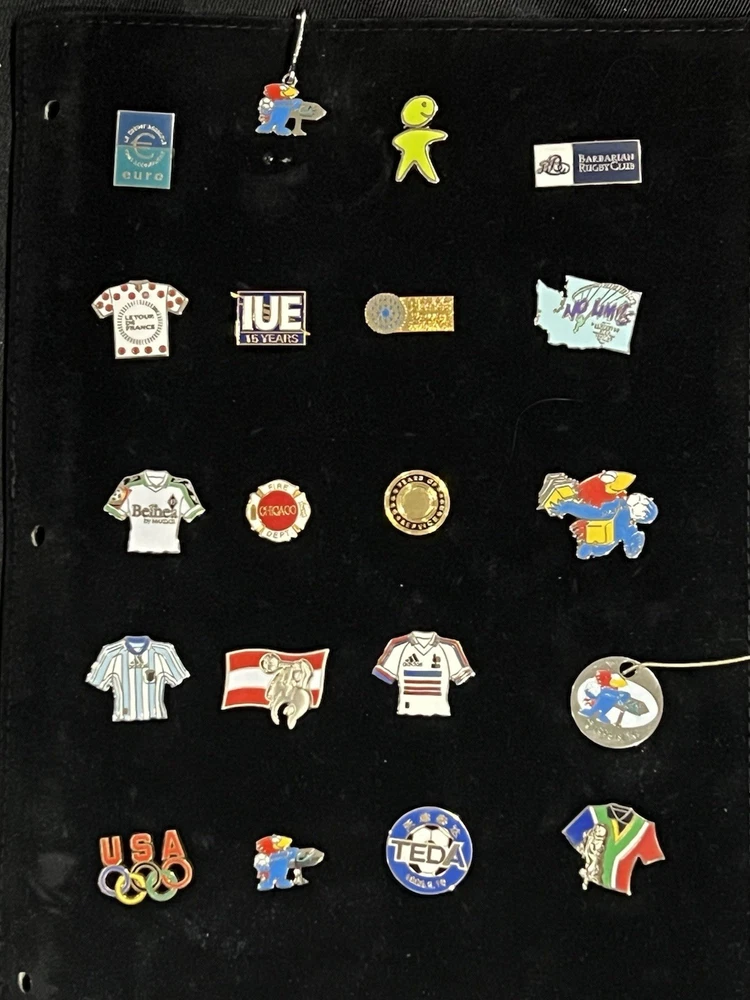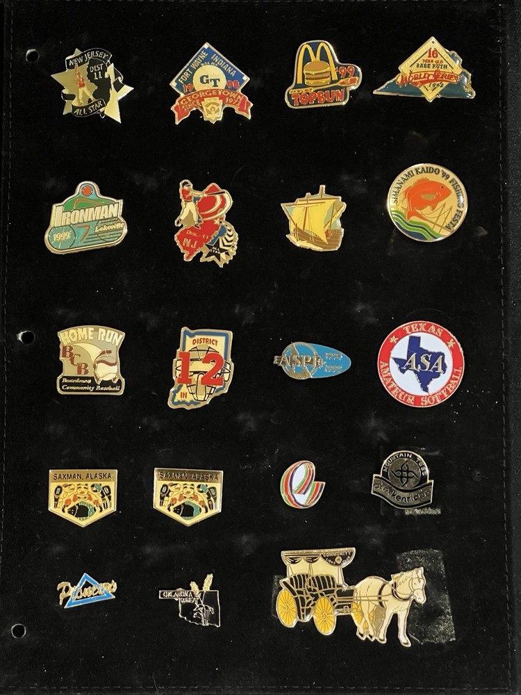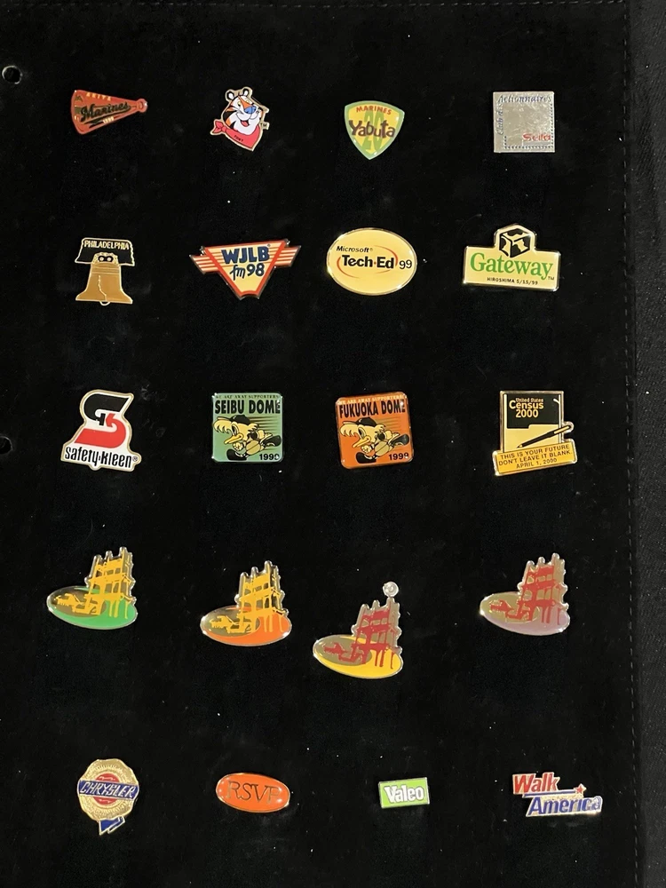 Large 80-piece lapel pin and emblem collection pulled from a manufacturer’s original sample book. Includes a mix of flats, lapel pins with posts, brooch backs, a pendant, and one keychain charm. These pieces were used for client presentations, color tests, production approvals, and internal reference. Many designs were never widely released to the public. What’s Included (80 Pieces Total): • Page 1 (20 pcs): All flats (no posts) — several loose on their adhesive dots. • Page 2 (20 pcs): • 17 standard post-back pins • 2 flats (bottom row) • 1 brooch-style pin (Breckenridge horse & carriage) • Page 3 (20 pcs): • 18 post-back lapel pins • 1 keychain clip charm (Jayhawk-style mascot) • 1 pendant with top loop • Page 4 (20 pcs): • 19 post-back lapel pins • 1 damaged piece (pin face separated from its post; included as-is) Themes Across the Collection: • Corporate & promotional (Microsoft Tech-Ed ’99, Gateway Japan, Safety-Kleen, Valeo, RSVP, Walk America, etc.) • International & travel (Japan Fukuoka Dome ’99, Seibu Dome ’99, Alaska Saxman tribal designs, rugby clubs, European designs) • Sports & event pins (USA Olympics, Ironman, baseball tournaments, district events, marathon/charity pieces) • Colorway & design variants typical of manufacturer sample presentations • Enamel, cloisonné-style, stamped metal, flats, and layered finishes Condition Highlights: • Most pins are clean enamel post-backs with butterfly clutches • Flats show expected light handling wear from sample book storage • One pendant and one charm included • One pin (Page 4, Row 4 Item 3) has detached from its post • Binder page felt/adhesive will show aging • Sold exactly as pictured Great for: Collectors • crafters • resale • repurposing • pin traders • display art • costume designers • prop departments needing period-correct small-format enamel pieces Please see pics for complete description and condition. Thanks for shopping!