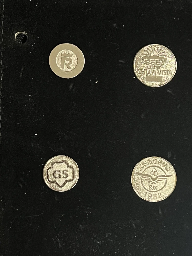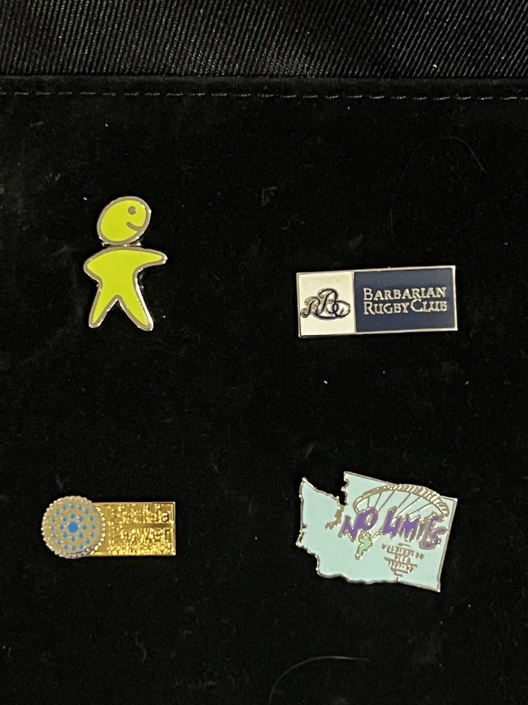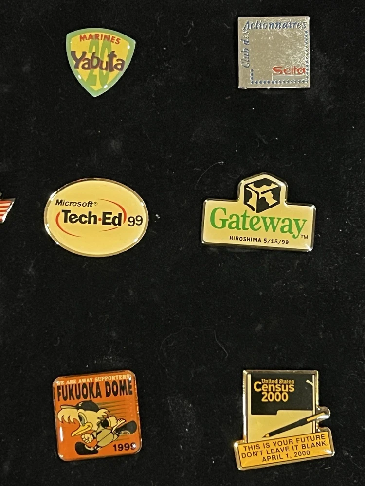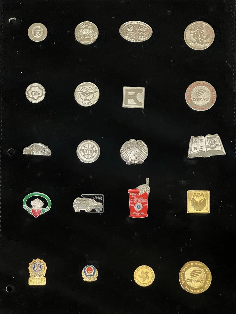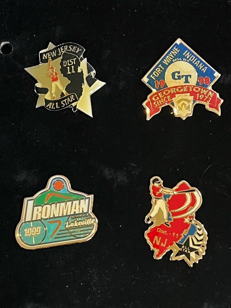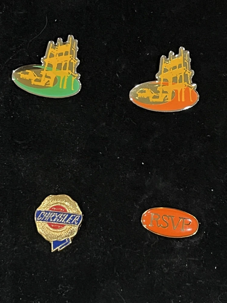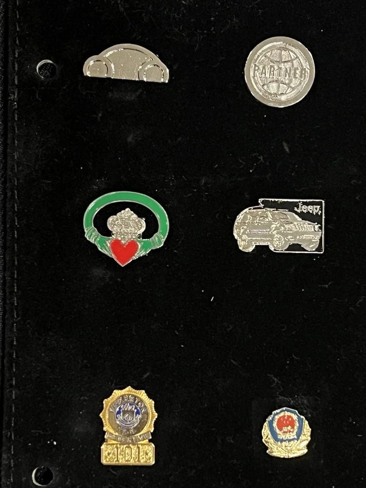 Large 80-piece lapel pin and emblem collection pulled from a manufacturer’s original sample book. Includes a mix of flats, lapel pins with posts, brooch backs, a pendant, and one keychain charm. These pieces were used for client presentations, color tests, production approvals, and internal reference. Many designs were never widely released to the public. What’s Included (80 Pieces Total): • Page 1 (20 pcs): All flats (no posts) — several loose on their adhesive dots. • Page 2 (20 pcs): • 17 standard post-back pins • 2 flats (bottom row) • 1 brooch-style pin (Breckenridge horse & carriage) • Page 3 (20 pcs): • 18 post-back lapel pins • 1 keychain clip charm (Jayhawk-style mascot) • 1 pendant with top loop • Page 4 (20 pcs): • 19 post-back lapel pins • 1 damaged piece (pin face separated from its post; included as-is) Themes Across the Collection: • Corporate & promotional (Microsoft Tech-Ed ’99, Gateway Japan, Safety-Kleen, Valeo, RSVP, Walk America, etc.) • International & travel (Japan Fukuoka Dome ’99, Seibu Dome ’99, Alaska Saxman tribal designs, rugby clubs, European designs) • Sports & event pins (USA Olympics, Ironman, baseball tournaments, district events, marathon/charity pieces) • Colorway & design variants typical of manufacturer sample presentations • Enamel, cloisonné-style, stamped metal, flats, and layered finishes Condition Highlights: • Most pins are clean enamel post-backs with butterfly clutches • Flats show expected light handling wear from sample book storage • One pendant and one charm included • One pin (Page 4, Row 4 Item 3) has detached from its post • Binder page felt/adhesive will show aging • Sold exactly as pictured Great for: Collectors • crafters • resale • repurposing • pin traders • display art • costume designers • prop departments needing period-correct small-format enamel pieces Please see pics for complete description and condition. Thanks for shopping!