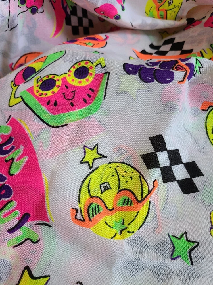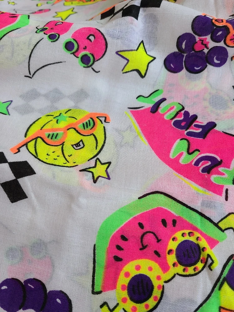80s Abstract Print Neon Splatter Graffiti VTG Fabric Over 1.4 Yards. 1.4 x 45in cotton blend. So much 1980 in one fabric .... wow! NEON, black and white checkers and fruits with sunglasses! Circa 1980 or earlier Non smoking no pets Paypal and shipping worldwide at buyers expense Smell very pleasant and old at the same time not prewashed.