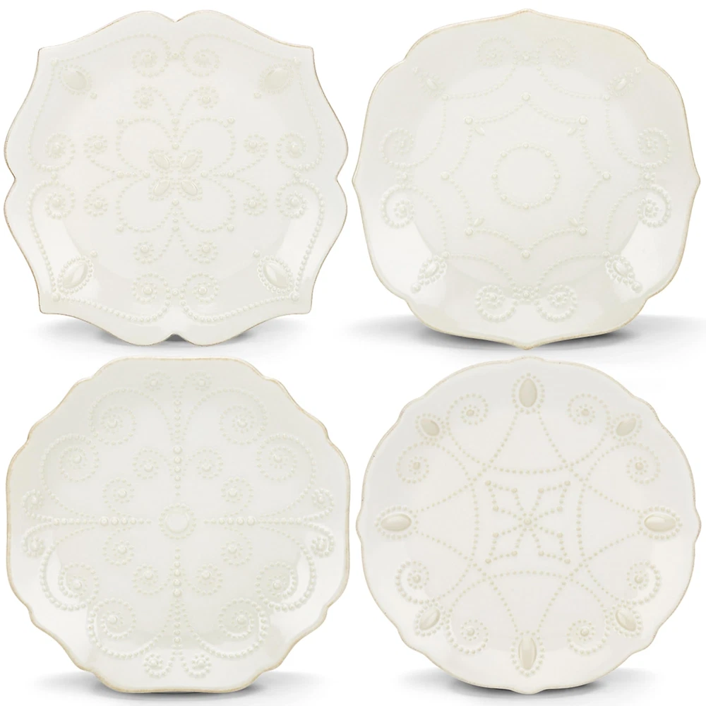 Put the accent on style at your next party! Each plate is 7.5" in diameter with a unique shape and beaded design. Variety meets versatility in these delightfully-shaped plates that coordinate beautifully with French Perle dinnerware. Crafted of durable stoneware, French Perle is deservedly of the most popular collections, and that is saying a lot! Whether your style is comfortably casual or fabulously formal, the classic French country charm of this collection will be right at home on your table. Inspired by the beauty of fine embroidery, French Perle is exquisite in every detail, from the raised bead motif to the hand-applied tea stain finish on every rim. Part of the fun of selecting French Perle is the easy way you can mix and match all of the color and pattern variations from the incredible range of products offered to create your own unique collection. Best of all, this versatile and stylish collection is created by , America’s first name in home entertaining, known around the world for offering a unique combination of design artistry and superior quality for over 125 years. Dishwasher and microwave safe.. 2 colors available - white and ice blue Made of durable stoneware. Dishwasher & microwave safe Each plate is 7.5" in diameter with a unique shape and design The scalloped rim features a hand-applied tea stain finish.