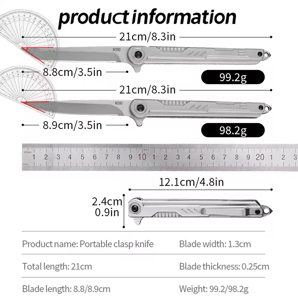 Product Description THE KNIFE HAVE TWO MODEL,WHEN YOU ORDER MIND WHAT MODEL DO YOU WANT,THAKNS! Description 1. Multi-functional design Users can personalize the configuration according to actual needs. 2. High-quality materials and sturdy and durable -HIGH CARBON STEEL BLADE: Made of stainless steel, high hardness and wear-resistant to ensure that it remains sharp after long time use. -Anti-corrosion treatment: the surface is treated with anti-rust and anti-corrosion treatment, which can effectively prevent rust even in humid environment and prolong the service life. -High-strength grip: made of durable composite material or metal, with good non-slip performance, ensuring a firm grip even with wet hands or gloves. 3. Portability and Compact Design -Lightweight and Portable: The overall weight is light and compact, easy to carry in pocket or backpack without adding extra burden. -Ensure the blade locks securely when deployed to prevent accidental closure and enhance safety. -Lanyard hole: comes with a lanyard hole design, easy to hang on a keychain or wrist, accessible anytime, anywhere. 4. Safety Features -Blade protector: Equipped with a special sheath or protector, it not only protects the blade from external damage, but also prevents accidental cuts. 5. Convenient operation -One-handed opening and closing: supports one-handed quick opening and closing, easy and fast operation, especially in emergencies can quickly deploy the knife. -Easy to clean and maintain: simple structure, easy to disassemble and clean, convenient daily maintenance to ensure the hygiene and performance after a long time of use. Specifications: Product Name: Stainless Steel Folding Knife Size: 8.3 INCH Material: stainless steel Hardness: 58-60hrc Surface: blade vacuum treatment, fine sanding. Handle material: front and back high quality titanium handle ct-4. Knife clip: blue titanium back clip Lock type: side opening. Screw: 420 stainless steel, hardness hrc45, CNC precision machining Structure: wire lock structure, built-in plane bearing gasket. Length: 21cm Blade length: 9.0CM Handle length: 12.1cm Blade width: 1.3cm Blade thickness: 2.5mm Blade material: M390(NC grinding of blade) Knife weight:100g Package: 1X folding knife NOTE: All dimensional data are measured by hand, please understand if there is any error. Payment Returns Contact Us Shipping Feedback 1. We only accept eBay payments. 2. All payments must be made within 3 days after auction won. Item may be returned for refund or replacement within 30 days of the purchase date. Returned merchandise must be unused, in original packaging and include all accessories. Shipping costs are non-refundable. Please do not hesitate to leave us your 5 Star ★★★★★ of DSR positive feedback if you are satisfaction with our products ,delivery or services . If you have Any Questions Or Unsatisfied with your purchase, please Email us firstly to get a better solution before you leave a neutral or negative feedback, we work hard to make sure every customer 100% satisfied and resolve anyproblem for you. Please email us first in the following situations: 1.The item can't work properly. 2.The item broken on the post. 3.You bought or received the wrong items. 4.You have not received your shipment within the period. 5.Before you give us Negative feedback. 6.Before you open a case/return on eBay. All questions will be replied within 24 hours (Except Saturday and Sunday or holidays). Thank you for your kindness! 1. eBay Payments Confirmed Addresses Only. 2. No Delivery to Alaska and Hawaii or PR. 3. No P.O. Box and APO/FPO Delivery. 4. Tracking Number will be provided. 5. Domestic shipping is within the 48 Contiguous States of United States, the delivery time is between 2 and 8 days. Items will be shipped by UPS, USPS or Fedex within 3 business day after receiving full payment. 6. International shipping is from China, the delivery time is between 10 and 30 working days. As a seller , Positive Feedback is very important to us. We try our best to let our customers to be happy. If you have any question about your order, please contact us ,please let us know before you Leave the Negative feedback ,We are willing to do our best to make up for it, Thank you very much ! Payment 1. We only accept eBay payments. 2. All payments must be made within 3 days after auction won. Returns Item may be returned for refund or replacement within 30 days of the purchase date. Returned merchandise must be unused, in original packaging and include all accessories. Shipping costs are non-refundable. Please do not hesitate to leave us your 5 Star ★★★★★ of DSR positive feedback if you are satisfaction with our products ,delivery or services . Contact Us If you have Any Questions Or Unsatisfied with your purchase, please Email us firstly to get a better solution before you leave a neutral or negative feedback, we work hard to make sure every customer 100% satisfied and resolve anyproblem for you. Please email us first in the following situations: 1.The item can't work properly. 2.The item broken on the post. 3.You bought or received the wrong items. 4.You have not received your shipment within the period. 5.Before you give us Negative feedback. 6.Before you open a case/return on eBay. All questions will be replied within 24 hours (Except Saturday and Sunday or holidays). Thank you for your kindness! Shipping 1. eBay Payments Confirmed Addresses Only. 2. No Delivery to Alaska and Hawaii or PR. 3. No P.O. Box and APO/FPO Delivery. 4. Tracking Number will be provided. 5. Domestic shipping is within the 48 Contiguous States of United States, the delivery time is between 2 and 8 days. Items will be shipped by UPS, USPS or Fedex within 3 business day after receiving full payment. 6. International shipping is from China, the delivery time is between 10 and 30 working days. Feedback As a seller , Positive Feedback is very important to us. We try our best to let our customers to be happy. If you have 