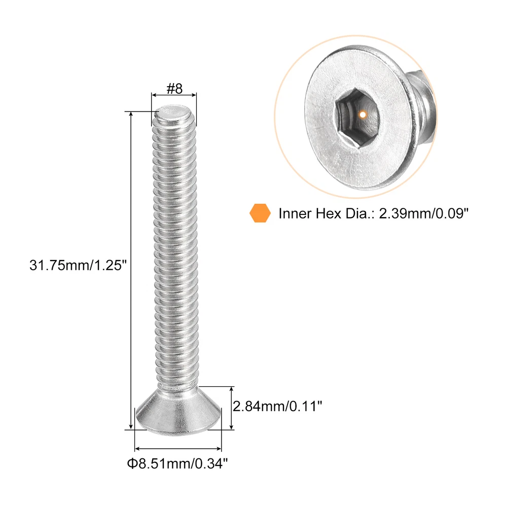 Document Description:Material: These flat head screws are made of 304 Stainless Steel which is one of the highest forms of corrosion-resistant metals, making it last longer than other hardware on the market today.Feature: Our flat head machine screws are very strong and are great for both indoor and outdoor use. This stainless is superior to regular steel and provides excellent rust resistance.Function: The flat-head socket cap screws are great to have around for use in wet environments and have strong oxidation resistance. They are strong, corrosion-resistant, and will support all of your projects.Application: Wind power industry, aerospace industry, office equipment industry, petrochemical industry, electronics industry, communications industry, shipbuilding industry, machinery, etc.Specification:Product Name: Flat Head Hex Socket Cap ScrewColor: Silver ToneModel: #8-32x1-1/4"Material: 304 Stainless steelScrew Total Length: 31.75mm/1.25"Inner Hex Dia.: 2.39mm/0.09"Screw Head Size: 8.51x2.84mm/0.34"x0.11"(D*T)Screw Groove Type: Inner HexPackage Content:25Pcsx Flat Head Hex Socket Cap Screw #8-32x1-1/4" Flat Head Socket Cap Screws, 304 Stainless Steel Fasteners 25Pcs Description: Material: These flat head screws are made of 304 Stainless Steel which is one of the highest forms of corrosion-resistant metals, making it last longer than other hardware on the market today. Feature: Our flat head machine screws are very strong and are great for both indoor and outdoor use. This stainless is superior to regular steel and provides excellent rust resistance. Function: The flat-head socket cap screws are great to have around for use in wet environments and have strong oxidation resistance. They are strong, corrosion-resistant, and will support all of your projects. Application: Wind power industry, aerospace industry, office equipment industry, petrochemical industry, electronics industry, communications industry, shipbuilding industry, machinery, etc. Specification: Product Name: Flat Head Hex Socket Cap Screw Color: Silver Tone Model: #8-32x1-1/4" Material: 304 Stainless steel Screw Total Length: 31.75mm/1.25" Inner Hex Dia.: 2.39mm/0.09" Screw Head Size: 8.51x2.84mm/0.34"x0.11"(D*T) Screw Groove Type: Inner Hex Package Content: 25Pcsx Flat Head Hex Socket Cap Screw Hot Item Payment 1.We accept eBay payment . 2.Payment must be received within 7 business days of auction closing. Shipping 1.We ship to your eBay or Paypal address. Please make sure your eBay and Paypal address is correct before you pay. 2.Items will be shipped within 1-3 business day when we received payment. 3.Delivery time depends on destination and other factors. Description Policy #8-32x1-1/4" Flat Head Socket Cap Screws, 304 Stainless Steel Fasteners 25Pcs Description: Material: These flat head screws are made of 304 Stainless Steel which is one of the highest forms of corrosion-resistant metals, making it last longer than other hardware on the market today. Feature: Our flat head machine screws are very strong and are great for both indoor and outdoor use. This stainless is superior to regular steel and provides excellent rust resistance. Function: The flat-head socket cap screws are great to have around for use in wet environments and have strong oxidation resistance. They are strong, corrosion-resistant, and will support all of your projects. Application: Wind power industry, aerospace industry, office equipment industry, petrochemical industry, electronics industry, communications industry, shipbuilding industry, machinery, etc. Specification: Product Name: Flat Head Hex Socket Cap Screw Color: Silver Tone Model: #8-32x1-1/4" Material: 304 Stainless steel Screw Total Length: 31.75mm/1.25" Inner Hex Dia.: 2.39mm/0.09" Screw Head Size: 8.51x2.84mm/0.34"x0.11"(D*T) Screw Groove Type: Inner Hex Package Content: 25Pcsx Flat Head Hex Socket Cap Screw Hot Item Payment 1.We accept eBay payment . 2.Payment must be received within 7 business days of auction closing. Shipping 1.We ship to your eBay or Paypal address. Please make sure your eBay and Paypal address is correct before you pay. 2.Items will be shipped within 1-3 business day when we received payment. 3.Delivery time depends on destination and other factors.