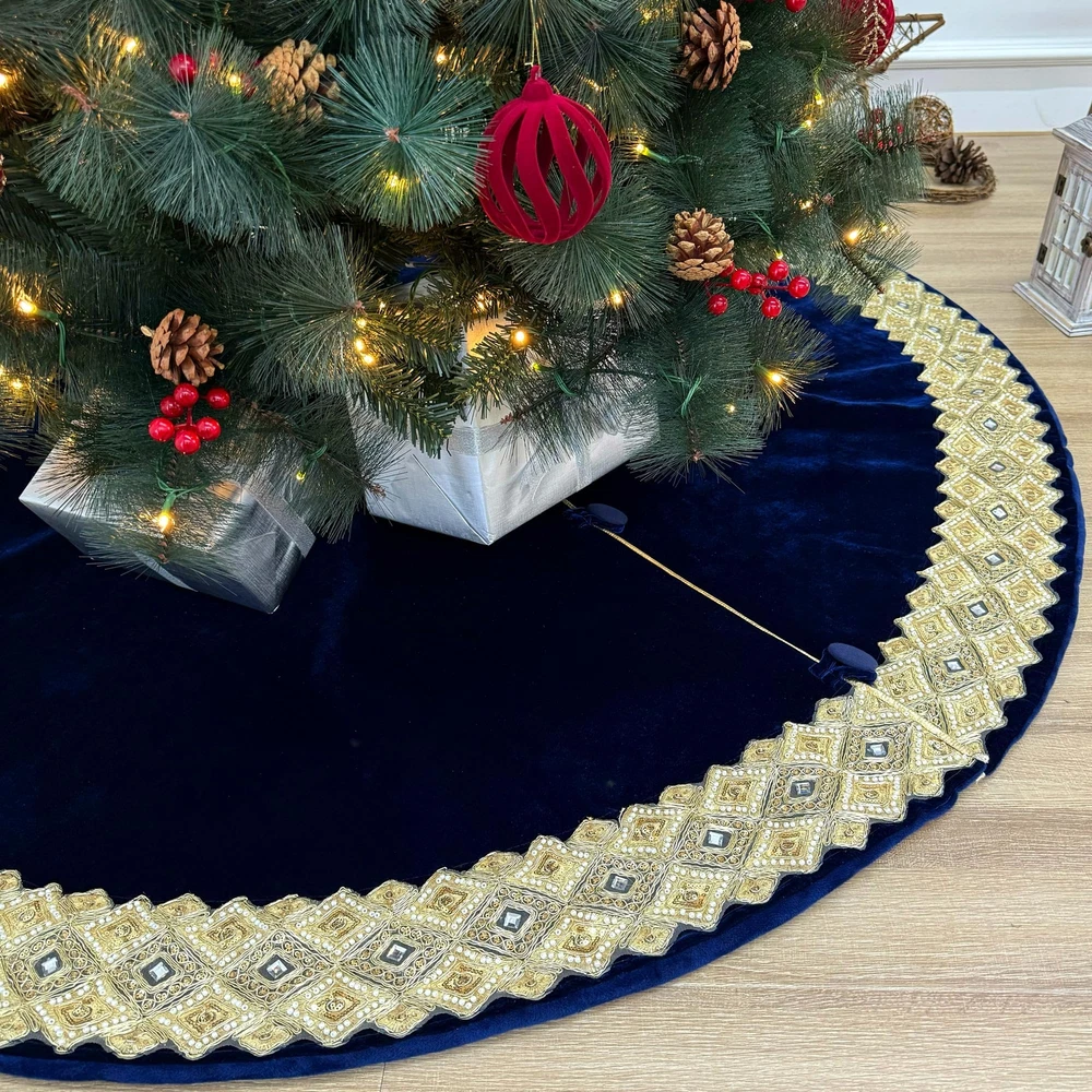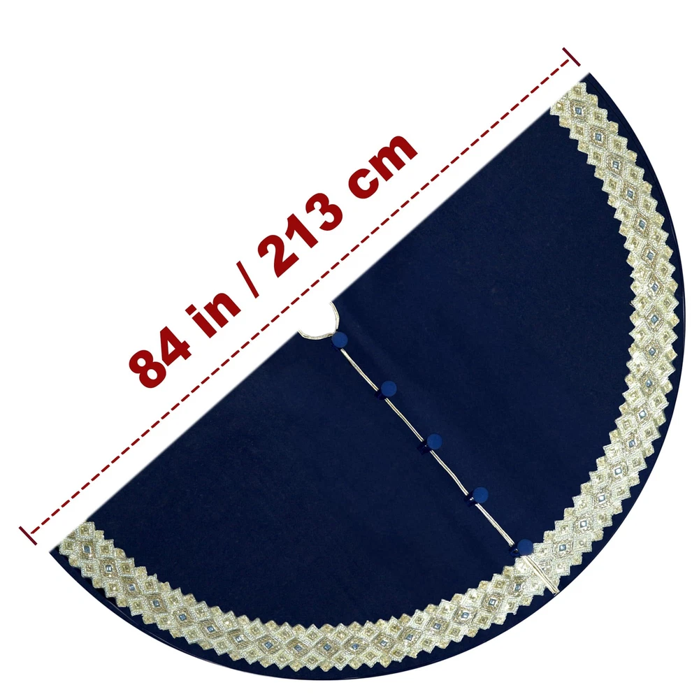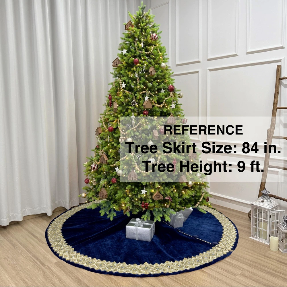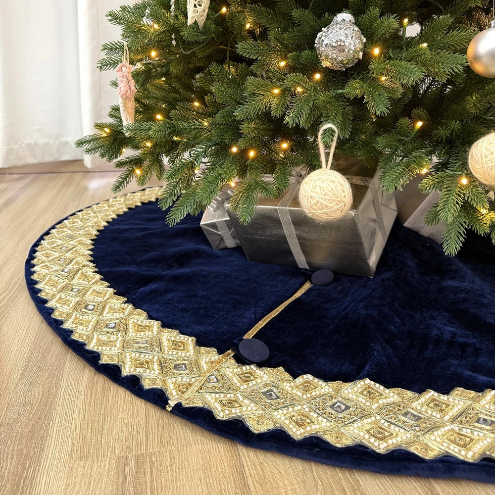 : Excellence in Festive Dรฉcor Welcome to Brought to you by Lit Ambition LLC, an American small business based in Laguna Beach, California. Since 1997, we've been a beacon for exquisite Christmas tree skirts and stockings. Every piece we craft echoes our deep understanding of holiday decoration desires, merging superior materials with time-tested craftsmanship. Our Commitment: - 24/7 US-based customer service - Rigorous quality checks on each product - Pledge to address any defects or shipping damages - Ethical manufacturing through partnerships adhering to amfori BSCI principles, ensuring fair wages and safe work environments for all. ๐ Gilded Splendor: Crafted from lustrous velvet, this extravagant tree skirt features a wide border adorned with a jeweled gold band. The band sparkles with mirrors and faux gemstones, creating a captivating display when illuminated by your tree's lights. Its timeless elegance makes it the perfect complement for Renaissance-themed or similarly opulent Christmas decorations. ๐ Grand in Scale: Measuring a generous 84 inches, this tree skirt gracefully adorns 8ft and taller trees, making it the ideal choice for grand setups seeking an equally impactful tree skirt. While many manufacturers compromise on size, our expertise guarantees impeccable quality for tree skirts of this grand scale. ๐ Easy On/Off Button Loops: Round, oversized cloth-covered buttons perfectly match the grandeur of the tree skirt. The 60" tree skirt includes 3 buttons, while the 72" and 84" versions each comes with 5 buttons. Easily secure the tree skirt around your tree base with its button loop closure, elegantly concealing the tree stand and wires underneath from view. ๐ Button Loop Closure: Three sets of oversized round buttons and matching loops make it simple to secure the tree skirt around the base, elegantly hiding the tree stand and wires underneath from view. Dressing your tree will feel like adorning it in fine attire. ๐ Care Instructions: Spot clean only. After the holidays, conveniently store the skirt in the included zip-up bag and box, keeping it pristine for seasons to come.