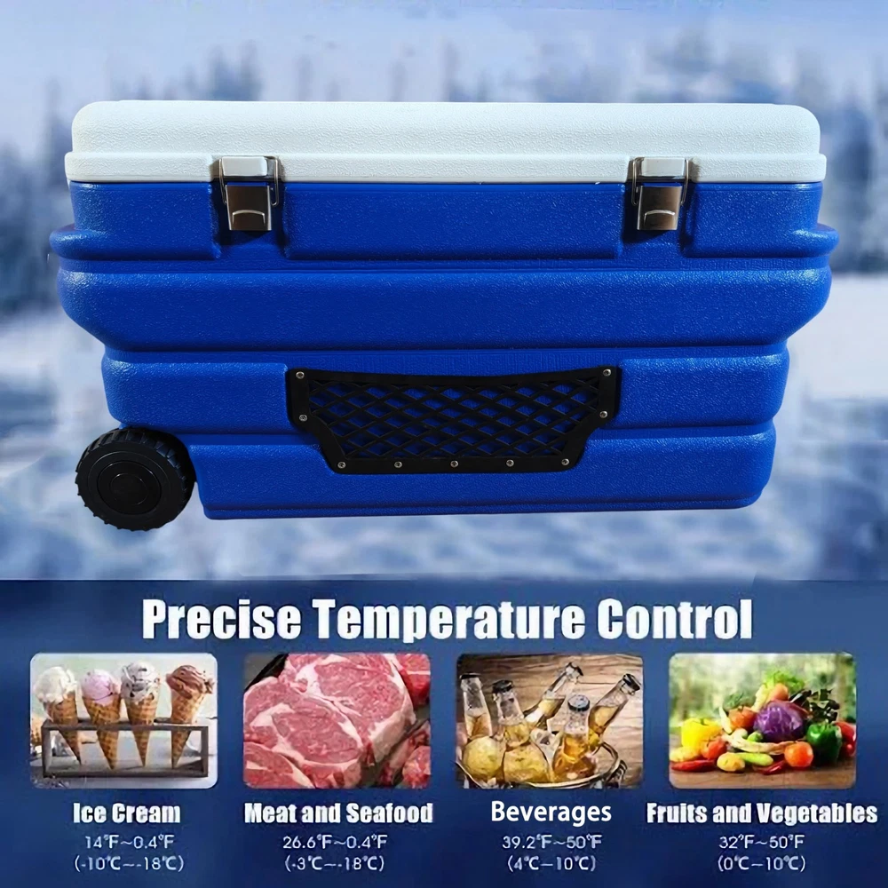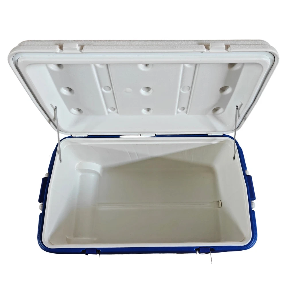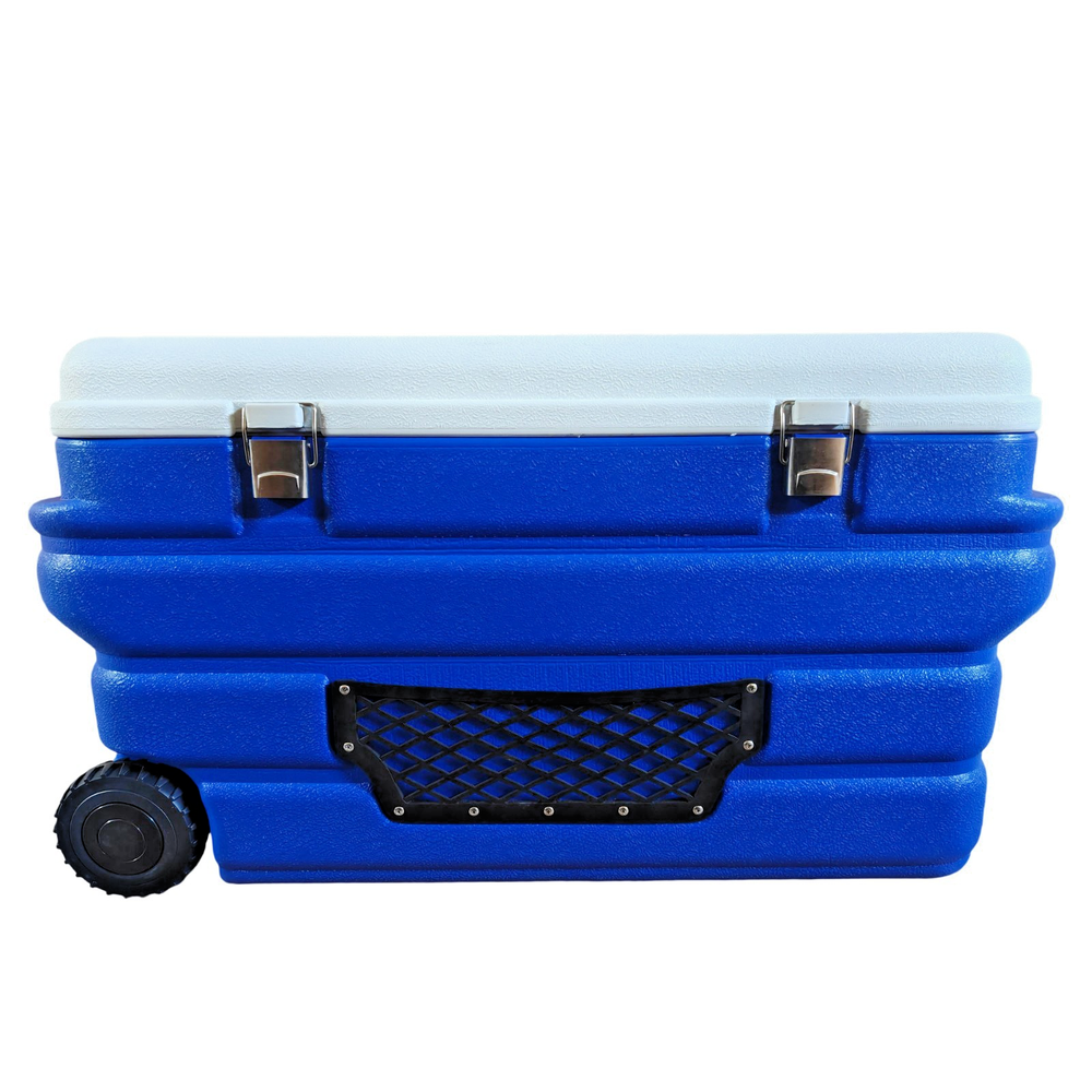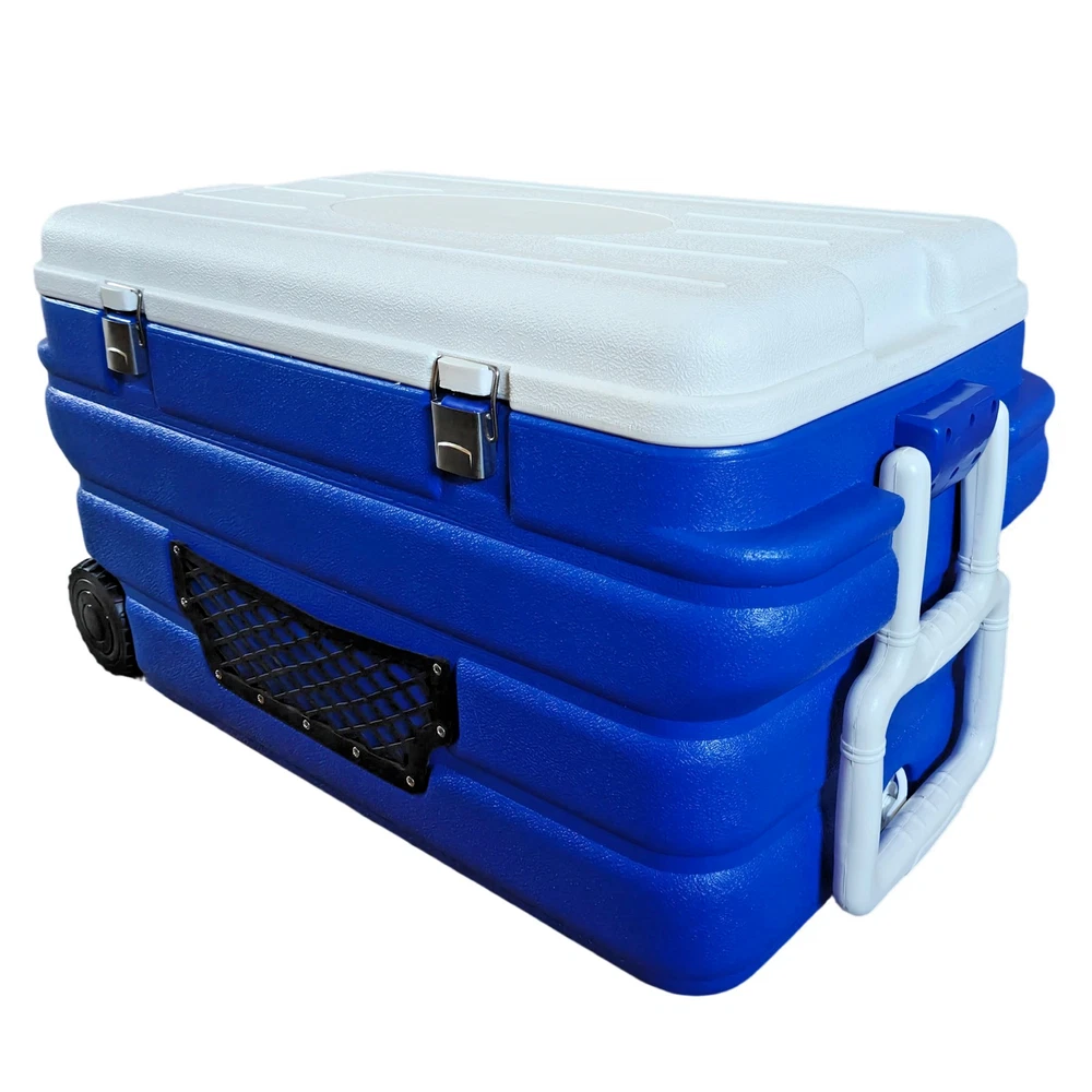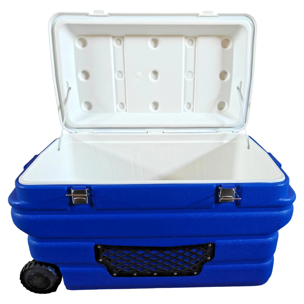 The 84-Quart Large Blue Plastic Cooler with Wheels is a versatile and durable option for outdoor activities such as camping, beach trips, fishing, traveling, and hiking. With a maximum insulation time of 72 hours and a capacity of 84.5 quarts, this ice box is perfect for keeping drinks and food cold for extended periods. The three compartments, portable design, and passive refrigeration type make it convenient for use in various settings. Made of lightweight yet sturdy plastic, this cooler weighs 27.6 lbs and features a matte finish, making it both practical and stylish for any adventure.