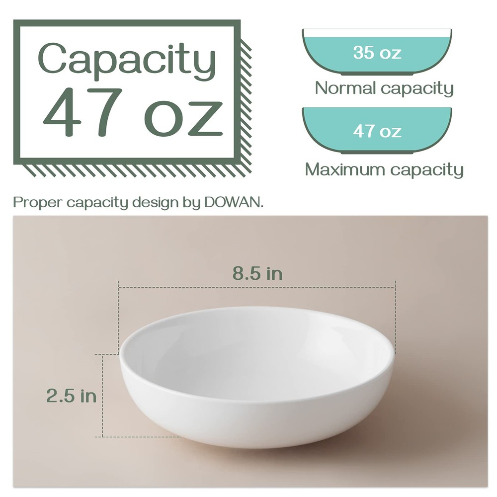 Great Deep and Wide Design -- 2.5 inches in height is deep enough to prevent the sauce from leaking. 8.5 inches in width is wide enough to show your dishes and cooking skills. The wide mouth allows large serving bowls to store more food. Versatile Bowls Set -- With a capacity of 47 oz, the serving bowl is deep enough to serve salads, pasta, vegetables, fruits, soups, meal prep, rice, or even morning cereal. This bowl set is versatile and perfect for all occasions, whether it's for dinner at home, in a canteen, or at a restaurant. Reliable Porcelain--Made of new bone china, which is pro-grade porcelain that is lead-free and cadmium-free. The lightweight design of the bowl makes it easy to handle and use, and safe for the freezer, dishwasher, microwave, and oven. Thickened & Stackable -- More durable and sturdy compared to regular serving bowls, and can use for years. The bowl's edge is designed for easy grip, making it comfortable to hold. The stackable design ensures cupboard space efficiency and secure storage without tilting. Sweet Gift Choice -- With the classic white color and deep serving bowl design, these large pasta bowls are not only practical but also eye-catching dinnerware on your table. Giving an ideal gift for birthdays, anniversaries, and housewarmings, bringing happiness to your family and friends.