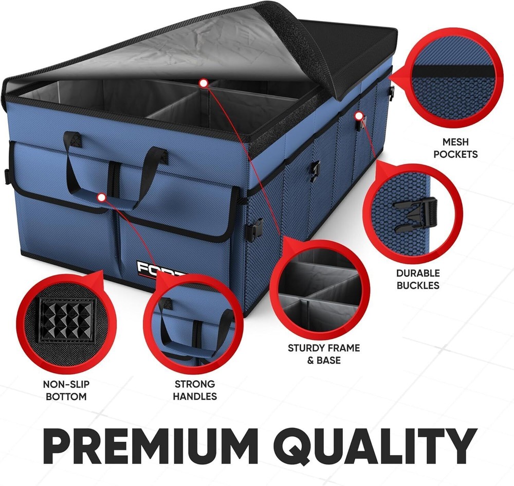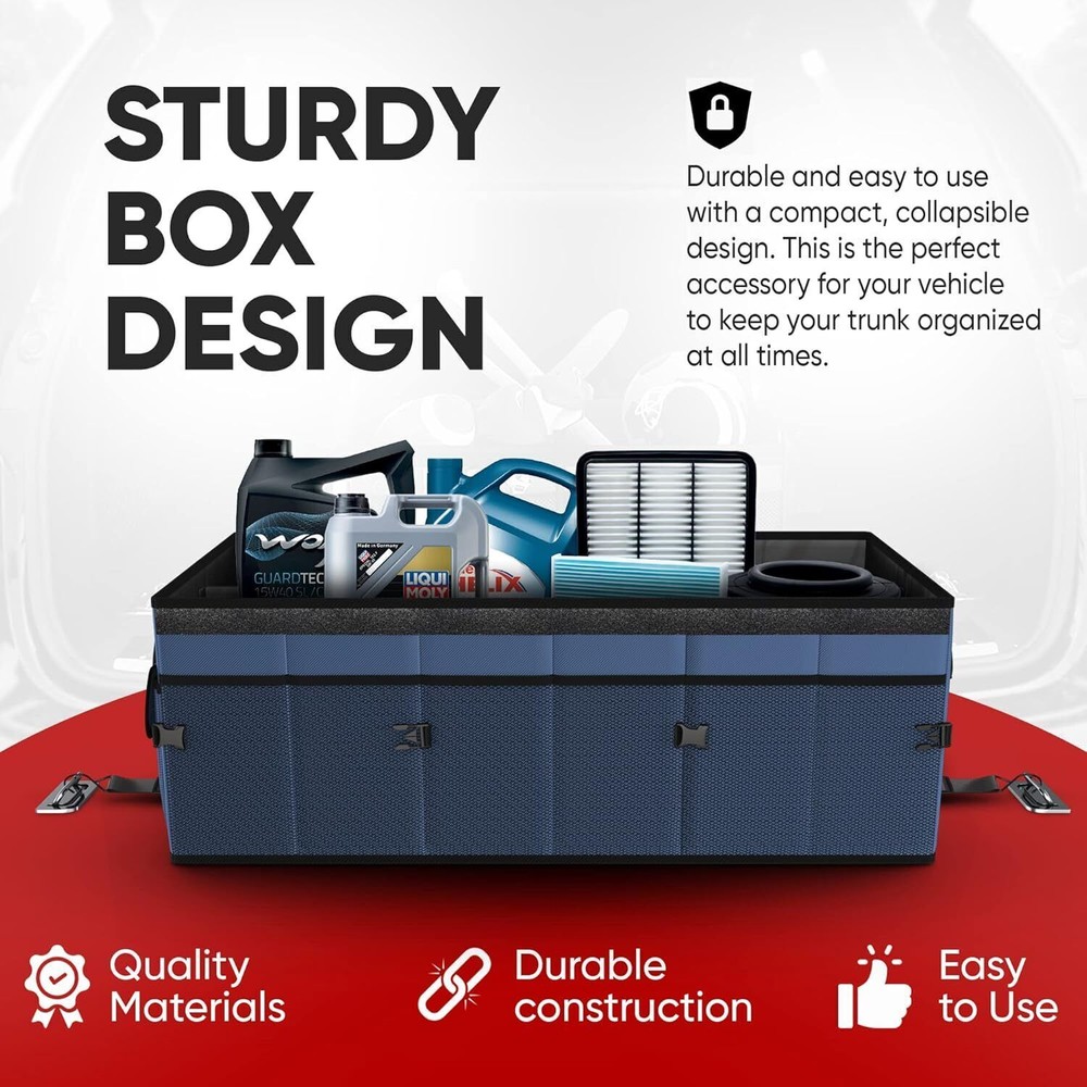 Sturdy Box Design – premium trunk storage organizer for car is reinforced with rigid base plates to support every side panel. Among car organizers and storage, ours will leave less mess to worry about with multiple side pockets and up to 3 compartments. Stays in Place – Our car trunk storage organizer has non-slip strips to prevent sliding and adjustable straps to secure to your trunk. Store small items in the tight mesh siding or pockets with lids. You can even connect 2 or more car organizers with interlocking buckles. Multifunctional – Trunk organizers and storage make car organization easy and simple. Organize a variety of products from groceries to office supplies, accessories (handbags, shoes,) or toys for . Consolidate the mess in your trunk and make room for your cooler or camp gear. Collapsible with Removable Lid – You can move trunk storage to the backseat, front seat, or center of your vehicle since it is collapsible to 1 compartment. The detachable lid keeps your goods out of sight for added security. Product information Technical Details Specific Uses For Product Automobiles Material Nylon Special Feature Expandable Color Blue