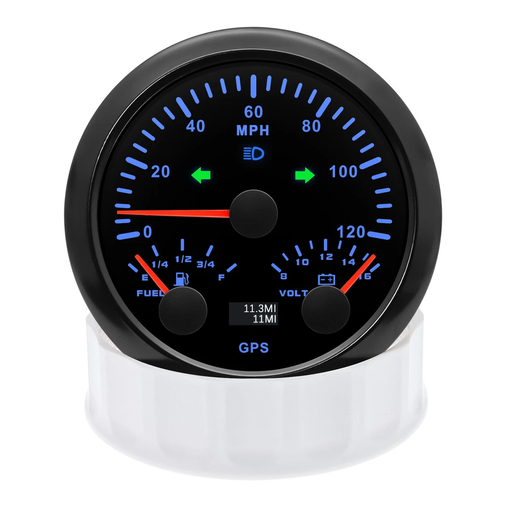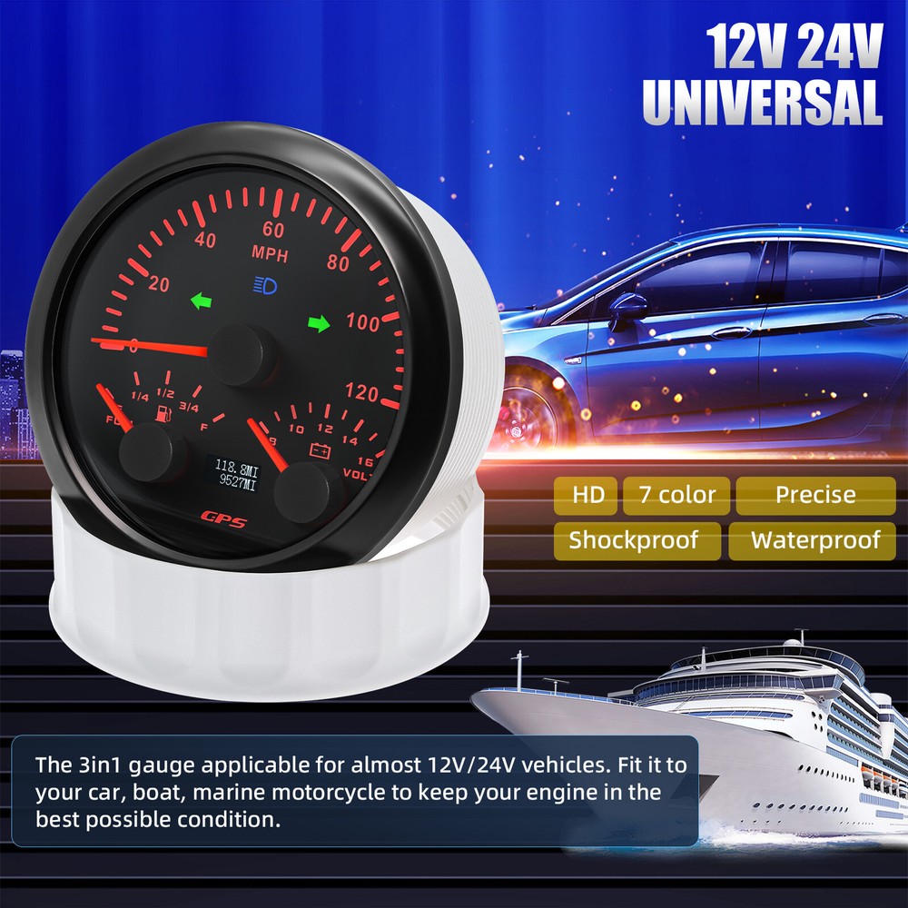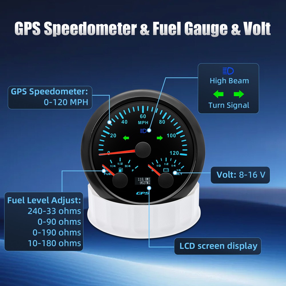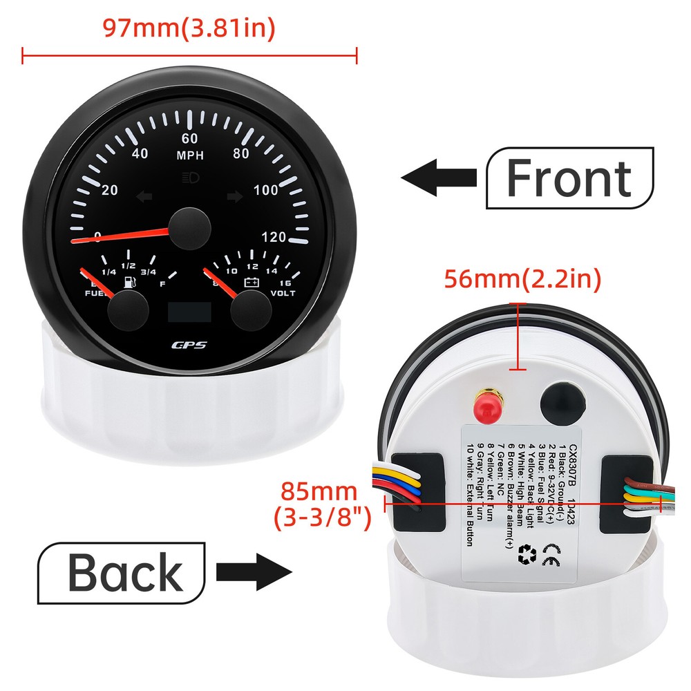 85MM 3IN 1 Car Boat GPS Speedometer 120MPH Fuel Level Gauge Voltage 7 Colors LED 85mm 3 in 1 Gauge GPS Speedometer 0-120MPH Fuel Level Gauge Voltage for Marine Boat Features: Fit for Car /Truck/ Boat /Diesel Generator Engine /Gasoline Engine Waterproof:IP 67 Excellent anti-fogging function; 316 Stainless steel bezel with curved glass; Convenient Installation by multi-plug socket connecting way; With curved glass( with anti-fog function). 7 colors baclight for your choose (red (default)→green →blue →white →yellow →cyan →Purple→(automatic)),customers can adjust any color that you like Specification: Size: 85mm GPS Speedometer: 0-120MPH Fuel level: 0-190ohms, 240-33ohms, 10-180ohms, 0-90ohms(Can be adjusted) Voltage: 8-16V Working voltage: 9-32VDC Working current: <100mA Working temperature: -30-80℃ Storage temperature: -40-85℃ Backlight :7 Color backlight Color: Black Connection 1 Black: Ground(-) 2 Red: 9~32vDc(+) 3 Blue: Fuel signal 4 Yellow: BackLight 5 White: High Beam 6 Brown: Buzzer alarm(+) 7 Green: Nc 8 Yellow: Left Turn 9 Gray: Right Turn 10 white: External Button Package Included: 1 x 85mm 3 in 1 Multifunctional Gauge 1 x Cable 1 x Installation Instruction