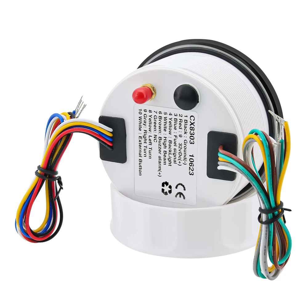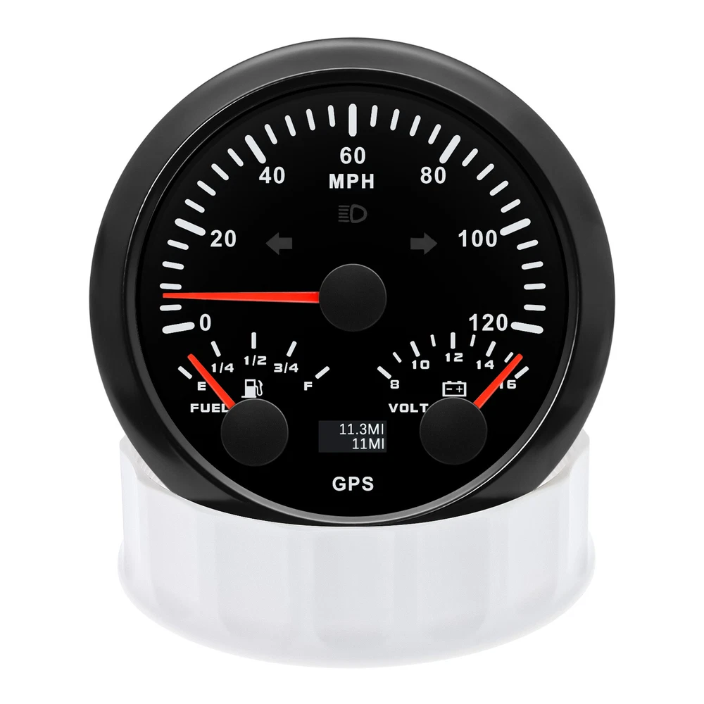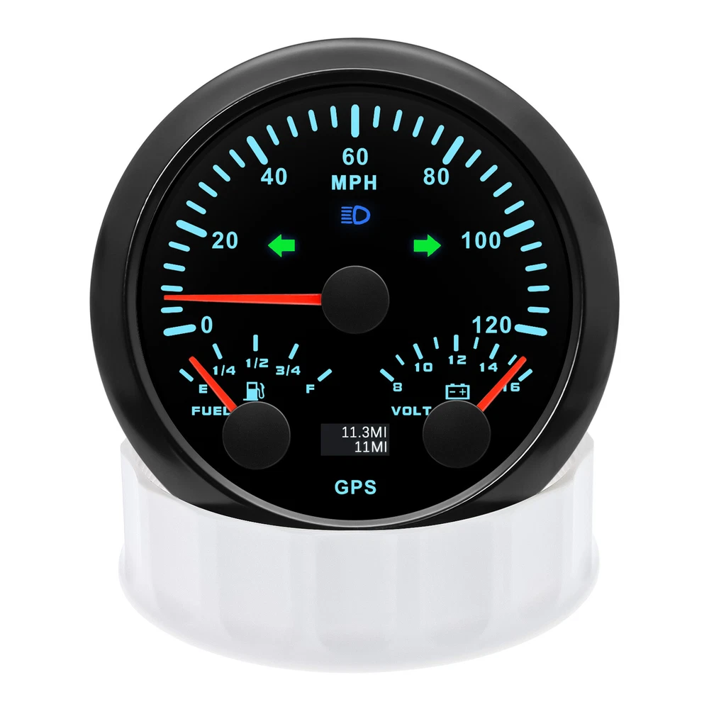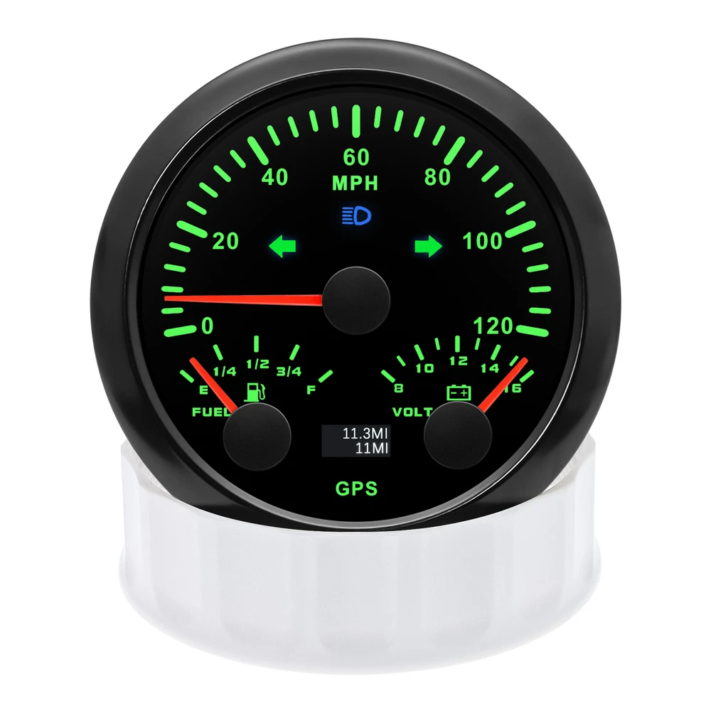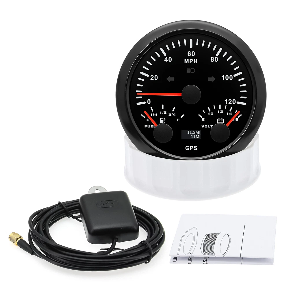85MM 3IN 1 Car Boat GPS Speedometer 120MPH Fuel Level Gauge Voltage 7 Colors LED 85mm 3 in 1 Gauge GPS Speedometer 0-120MPH Fuel Level Gauge Voltage for Marine Boat Features: Fit for Car /Truck/ Boat /Diesel Generator Engine /Gasoline Engine Waterproof:IP 67 Excellent anti-fogging function; 316 Stainless steel bezel with curved glass; Convenient Installation by multi-plug socket connecting way; With curved glass( with anti-fog function). 7 colors baclight for your choose (red (default)→green →blue →white →yellow →cyan →Purple→(automatic)),customers can adjust any color that you like Specification: Size: 85mm GPS Speedometer: 0-120MPH Fuel level: 0-190ohms, 240-33ohms, 10-180ohms, 0-90ohms(Can be adjusted) Voltage: 8-16V Working voltage: 9-32VDC Working current: <100mA Working temperature: -30-80℃ Storage temperature: -40-85℃ Backlight :7 Color backlight Color: Black Connection 1 Black: Ground(-) 2 Red: 9~32vDc(+) 3 Blue: Fuel signal 4 Yellow: BackLight 5 White: High Beam 6 Brown: Buzzer alarm(+) 7 Green: Nc 8 Yellow: Left Turn 9 Gray: Right Turn 10 white: External Button Package Included: 1 x 85mm 3 in 1 Multifunctional Gauge 1 x Cable 1 x Installation Instruction