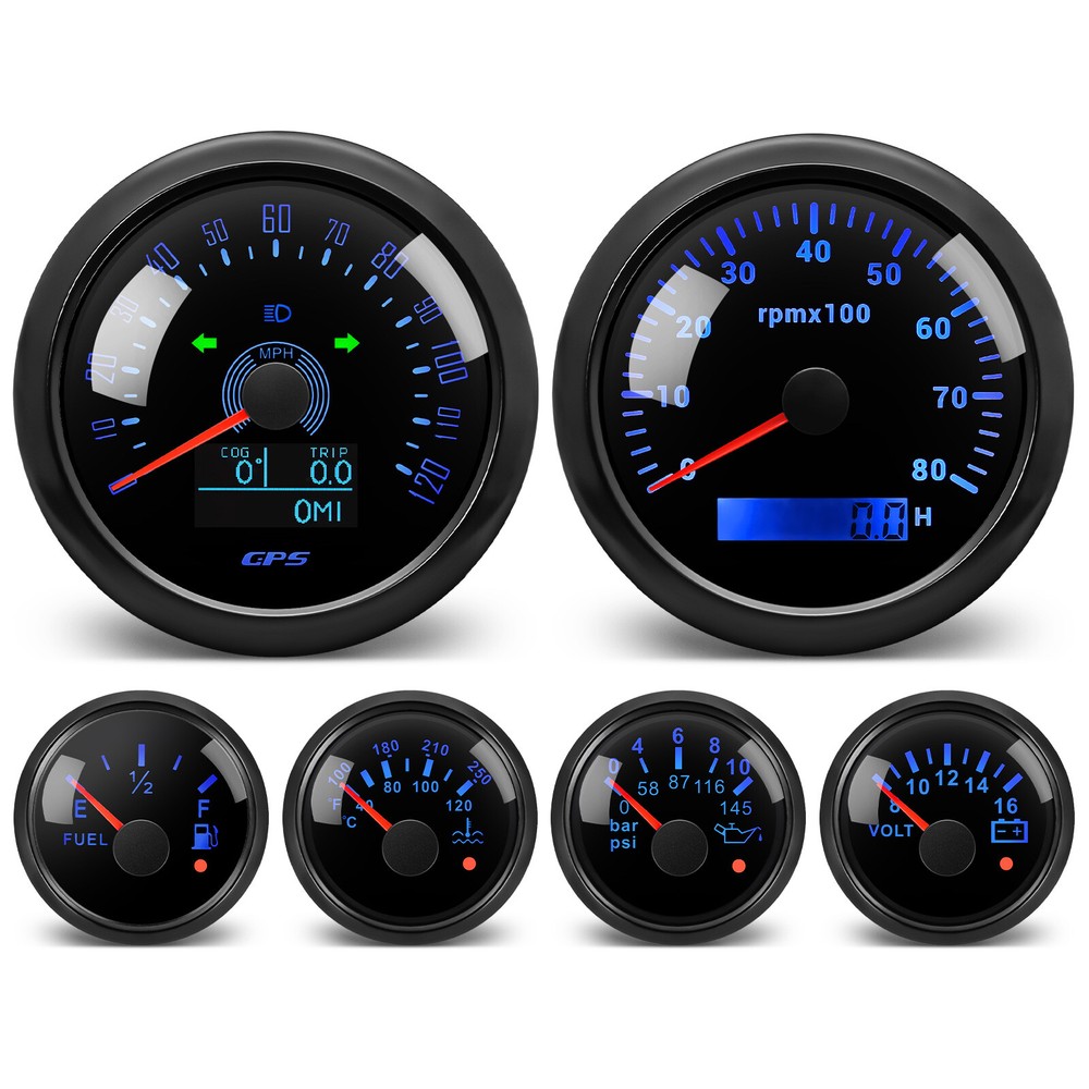 85MM GPS Speedometer 0-120MPH Tachometer &52mm Fuel/Oil/Temp/Volt with Senders 6 Gauge SET 85MM Black GPS Speedometer 120MPH&Tacho & 52mm Fuel/Oil/Temp/Volt with Sensor Features: Suitable for all cars,tractors,vans,vessels,boats,yachts,etc. The signal comes directly from the satellite signal receiver (GPS Speed Sensor) The gauge has the advantages of high precision, quick location confirmation and short start up time. IP67 waterproof and dustproof grade. Stepper motors used for full range of stepping gauges, great feature with its less power consumption, longer life, higher precision, etc. With curved glass (with anti-fogging function). With ultra-wide working voltage design( long-term operating voltage: 9-32V,Maximum up to: 36V (≤ 1 min)). Technical Data: Fixing dimension:85mm(3-3/8 inches) Indicating Range:0-120MPH Item:Black Working Voltage:9-32VDC(12VDC/24VDC) 7 Backlight color:red,green,blue,white,yellow,cyan,purple Tachometer Engine hours: 0.0-99999.9H Backlight :7 Color backlight Indicating Range: 0~8000 RPM Signal:Pulse For Tachometer, you can substitute for different unit, please contact us before / after purchase or note on the order. Tachometer: 0-3000rpm/0-4000RPM/6000RPM/7000RPM Volt Gauge Sizes:52 mm (2-1/16") Measuring Range:8-16 (V) Backlight: 7 Colors Fuel Level Gauge Sizes:52 mm (2-1/16") Measuring Range:Empty-Full Resistance: 240 (E)-33 (F) ohms Backlight:7 Colors Water Temperature Gauge Install diameter: Φ52mm Indication range: 0~120℃/100-250℉ Input signal: 287.4~22.4 ohm Storage temperature: -40~+85 Backlight: 7 Colors Oil Pressure Gauge Install diameter:Φ52mm or 2-1/16" Indication range:0~10bar/0-145 PSI Operating temperature:-30~+75 Storage temperature:-40~+85 Backlight: 7 Colors Package Includes: 1X 85MM Digital GPS Speedometer Gauge 1X GPS Antenna 1X Tachometer 1X Voltmeter 1X Fuel level gauge 1X Water temp gauge 1X Oil pressure gauge 1x Fuel level Sending Units (240-33ohms) 1X Oil pressure Sensor (1/8NPT) 1X water temp Sensor (1/8NPT) 1X Tachometer Sensor(M16*1.5) Installation Instruction NOTES: The Sending units will be included