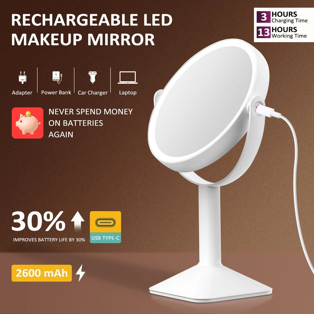 đŸ„°Are you still worried about the mirror unstable? 💯【Sturdy Triangular and Removable Base Easy to Instal】Unlike others,the double-sided lighted makeup mirror features a sturdy U-shaped bracket and stable triangular base design to ensure stability and support.The detachable base design offers convenience for carrying around. 💡【3 Color Lighting and Dimmable】This mirror with lights provides cool light, warm light, and natural light, allowing you to freely switch between three different lighting effects. Short press can easily change the lighting mode, and long press the touch screen switch to dim or brighten the lights, with various brightness levels to meet your needs. 👍【Rechargeable LED Mirror】The light up mirror is equipped with a 2600mAh rechargeable battery, which can work continuously for 13 hours after fully charged, avoiding frequent charging. Adopt a Type-C interface charging design, convenient for you to charge the lighted mirror. ✹【Premium Pearl ABS Finish Surface and Smart Function】Crafted from high-quality pearl ABS, the mirror combines durability with smart .Also it features a brightness memory function and a 30-minute auto-off timer which is convenient for your everytime use. 💝【Enjoy 360°Free-rotation】The desktop lighted mirror can be freely adjusted between 1X to 15X,so you can always find the most suitable makeup angle on any plane. The magnified mirror with lights is suitable for tables and wash tables of all heights, allowing you to avoid the damage caused by bending over. 🎁【Perfect Gift for Women】Our mirror for desk is made of high-quality materials, with exquisite appearance and intelligent dimming function, making it practical and beautiful. Whether it's a birthday, anniversary, Mother's Day, Valentine's Day, or Christmas, this mirror makeup is the best gift for mom, girlfriend, wife or friend.