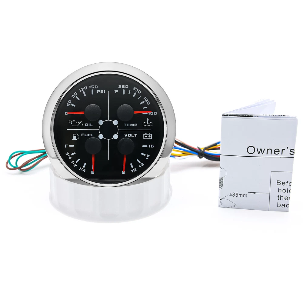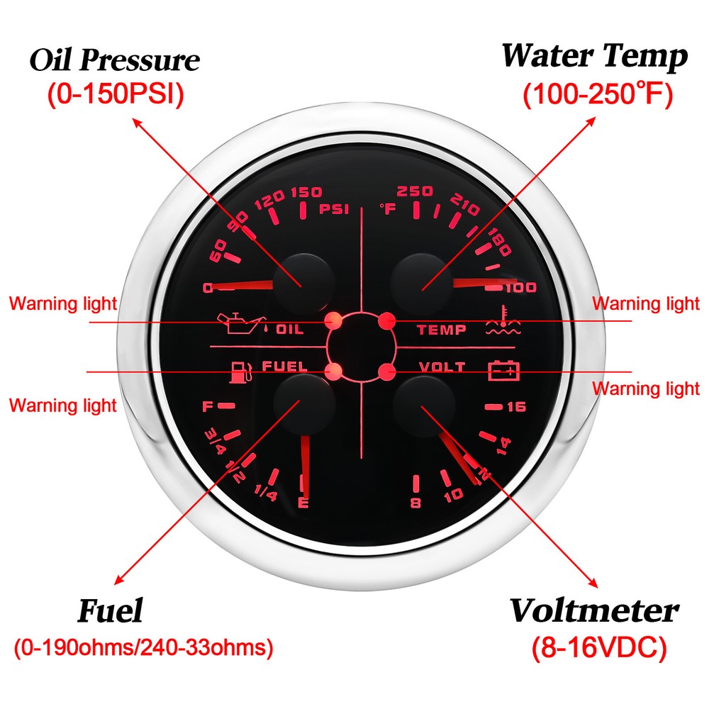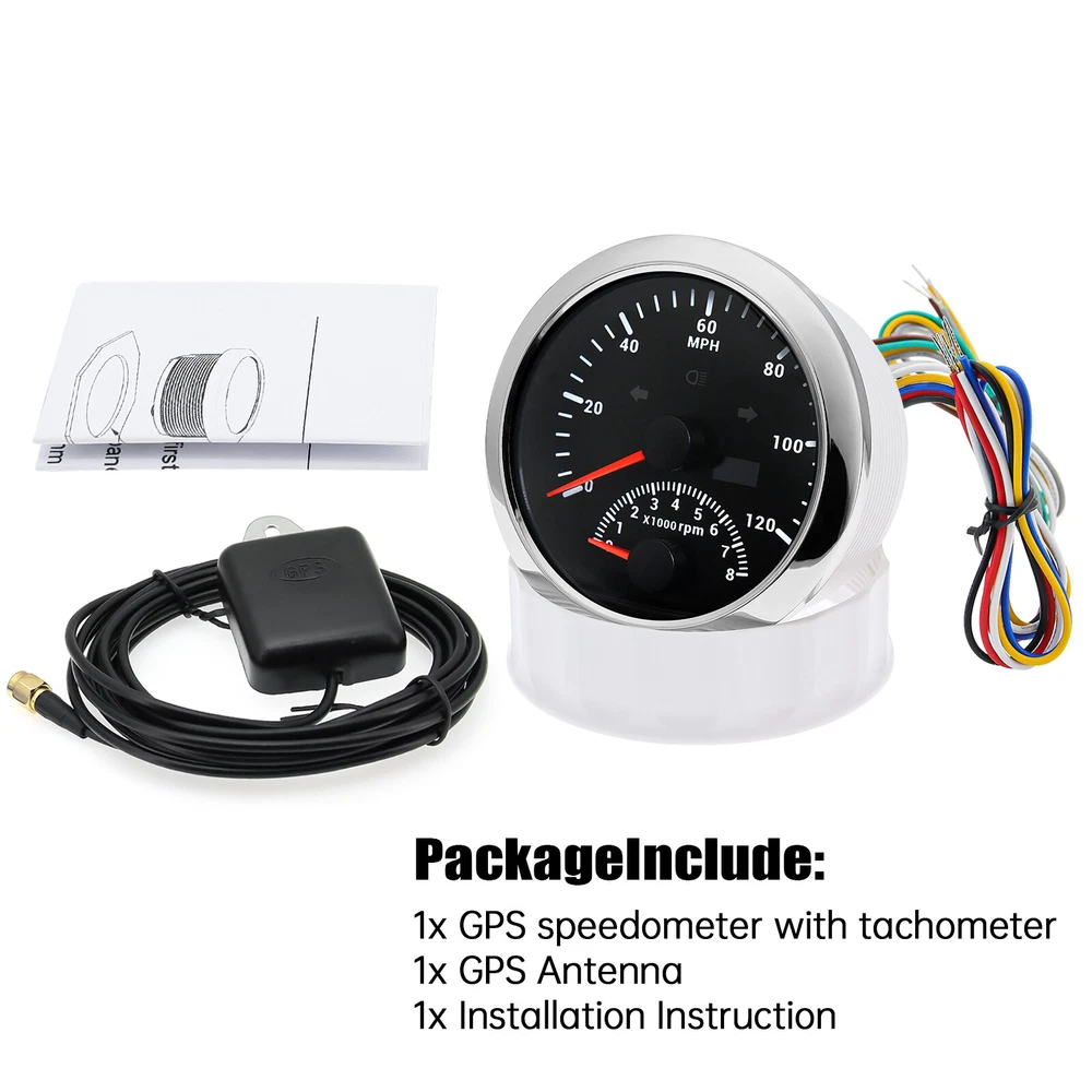 2 Gauge Set 85mm GPS Speedometer 120MPH w/Tacho 0-8000RPM & 85mm 4 in 1 Gauge 2 Gauge Set 85mm GPS Speedometer 0-120MPH w/ 85mm Fuel Level Water Temp Oil Pressure Volt Features: Suitable for all vehicles and off-road vehicles The signal comes directly from the satellite signal receiver(GPS Antenna), don't need other speed sensor. The gauge has the advantages of high precision, quick location confirmation and short start up time. IP67 waterproof and dustproof grade Reverse polarity protection and anti-fogging performance Stepper motors used for full range of stepping gauges, great feature with its less power consumption, longer life, higher precision, etc. Most importantly, the gauge is easy to setup, and can be used in all vehicles, boats and off-road vehicles. Speedometer Specifications: Application: Universal fit for Motorcycle/ Boat/Truck/Bus/Car Electronic Speedometer (stepper motor) No Mechanic Sensor, get speed signal from GPS Speed ≠0 and show accurate speed in tunnel with the help of accelerometer Total Mileage Adjustable GPS Blind Area Odometer Compensation OverSpeed Buzzer Alarm (Value Adjustable) Indication Light (Left, Right and High Beam Installation Diameter: 85mm (3 3/8") Speed Range: 0~120MPH RPM Range : 0~8000RPM Mileage Range: 0-99999.9miles Working Voltage: 12V/24V Working temperatures: - 40 to 85°C Protection rank: IP67 Waterproof Reverse polarity protection and anti-fogging performance 4 IN 1 Gauge Technical Data: Fixing dimension: 85mm Indicating Range: Oil press. meter: 0-150PSI Water temp. meter: 100-250℉ Fuel level meter: 0-190ohms/240-33ohms, empty-full; The signal can be adjusted Voltmeter: 8-16V Working Voltage: 12V Input Signal: 10-184ohms for 0-10Bar oil pressure meter; 0-190ohms for fuel level meter;(Default 0-190ohms, can adjust to 240-33ohms) 8-16V voltage meter; Input Signal 320-22ohms for water temperature meter Red backlight Protection grade is IP67, the whole body is completely waterproof; Excellent antifogging function; 316 Stainless steel bezel with curved glass; Convenient Installation by multi-plug socket connecting way; Accessories: matched with connectors, Installation Instruction Package Included: 1 x 85mm 4 in 1 Multifunctional Gauge 1 x 85mm GPS Speedometer Gauge 1 x GPS Antenna 2 x Cable 2 x Installation Instruction