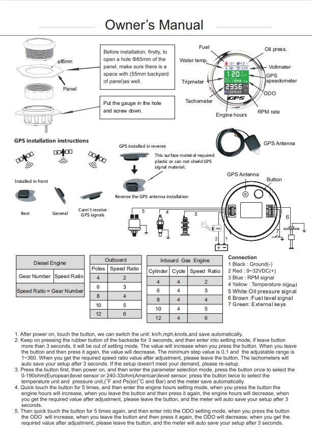 85mm 6 In 1 Boat GPS Speedometer Tachometer Pressure Temp Fuel Gauge With Sender 85MM GPS Speedometer Tachometer Voltage 9-32V Water Temp Fuel Level Oil Pressure 0-10Bar 6 in 1 Multi-functional Digital Gauge with alarm Warmly tips: If any problem after buying, such as some when you install or the parcel received or un-received, please do not open a case and do not hesitate to contact us. We would do our best to give you the best solution. Thank you so much Features: - GPS SOG: Speed Over Ground: 0-600km/h - ODO: odometer: 0-999999km (can be adjusted by the back button.) - TRIP: 0-999.9km (Return Zero When off electricity) - COG: Course Over Ground - Tachometer: 0-9999RPM - Speed Ratio: 1.0-360.0; Step Value: 0.1 - Oil Pressure: 0-10 bar/0-145psi (Pressure sensor: 10-184ohm) (After power on, press the back button to adjust unit, if the oil pressure unit is "psi", the temperature unit will be "℉".) - Water Temperature: 40-120℃/100-250℉ (Temperature sensor: 301-22ohm) (The water temperature is displayed by default. If you need oil temperature, please contact us to customize.) - Voltmeter: 9-32V - Fuel Level: 0-100% (Press the back button to adjust the level signal: 0-190Ω/240-33Ω available.) - Total Engine Hours: 0.0-99999.9H(Press the back button to adjust.) - Sensor Fault Alarm(Chinese and English can be switched) - Degree of Protection: IP67 - Backlight: TFT Screen * Sensor are not provided with this gauge. * Plz. order the sensor separately if you need it. Setting: - Keep on pressing the back button for 3 seconds, and then enter into setting mode, leaving button more than 3 seconds, it will be out of setting mode. - The value will increase when you press the button. When you leave the button and then press it again, the value will decrease. The minimum step value is 0.1 and the adjustable range is 1.0-360.0.(tachometer setting) - When you get the required speed ratio value after adjustment, please leave the button. The tachometers will autoclave your setup after 3 seconds. If the setup doesn't meet your demand, please re-setup. - Must press the button first and power up, can select English or Chinese. Dimensions: - 85mm diameter (3-3/8") - 55mm Depth (2-3/4") Package Included(as picture): - 1X 85mm 6 in 1 Gauge - 1X 1/8NPT Water temp sender - 1X 1/8NPT Oil pressure sender - 1X Multi-plug socket - 1X GPS antenna - 1X Instruction Note: - Please make sure you can Installation,if you need help you can contact your local car repair workshop,Thank you! - Please allow a voltage error of 0.2V, thank you Wholesale and Drop shipping - For wholesale, we will offer the discount or free express shipping which only takes 3-7 days to arrive. - For drop shipping, We could send the goods to your customers directly and won't leave information about us if youd like to.