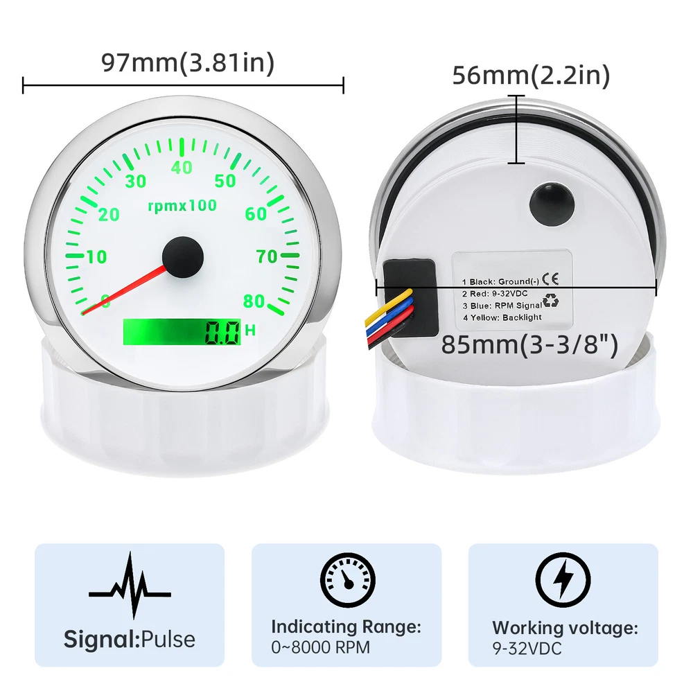 7 Gauges Set 85mm GPS Speedometer 0-120MPH Waterproof for Marine Boat Car Truck 7 Gauge Set 85mm GPS Speedometer 0-120MPH Tachometer Waterproof for Boat Car Feature: High-brightness LED backlight. 316 stainless steel for long-term use even in acid-base, humid environment. IP67 waterproof and dust-proof grade. With curved glass( with anti-fog function). Suitable for all kinds of vehicle modification. Using stepper motor drive pointer, accurate display of the engine speed, and with the LCD display clear display mileage. Gauges have many kinds backlight color (red,yellow,orange,green,blue,purple,white),customers can adjust any color that you like GPS Speedometer Gauge Install Diameter: Φ85mm or 3-3/8" Signal: GPS Working Voltage: 9~32V DC Size: 12x8x12cm / 4.72x3.1x4.75 inch Indication Range: 0-120MPH Backlight:7 Colors Backlight Tachometer Install Diameter: Φ85mm or 3-3/8" Engine hours: 0.0-99999.9H Backlight :7 Color backlight Indicating Range: 0~8000 RPM Signal: Pulse For Tachometer, you can substitute for different unit, please contact us before / after purchase or note on the order. Tachometer: 0-3000rpm/0-4000RPM/6000RPM/7000RPM Fuel Level Gauge Sizes: 52 mm (2-1/16") Measuring Range: Empty - Full Resistance: 240 (E) - 33 (F) ohms Backlight: 7 Colors Water Temperature Gauge Install diameter: Φ52mm Indication range: 0~120℃/30-250℉ Input signal: 287.4~22.4 ohms Storage temperature: -40~+85℃ Backlight: 7 Colors Oil Pressure Gauge Install diameter:Φ52mm or 2-1/16" Indication range:0~10bar / 0-150 PSI Input signal: 10-184 ohms Operating temperature:-30~+75 Storage temperature:-40~+85 Backlight: 7 Colors Volt Gauge Sizes: 52 mm (2-1/16") Measuring Range: 8 - 16 (V) Backlight: 7 Colors Trim gauge 7 Color Backlight : Red (default)→green → blue → white →yellow→cyan →Purple →(automatic). Fixing dimension: 52mm(2'') Indicating Range: UP-DN Signal: 0-190ohms Working Voltage: 9-32V(12V/24V) Operation mode: LCD display, stepper motor Package Includes: 1X 85MM Digital GPS Speedometer Gauge 1X GPS Antenna 1X 85MM Tachometer 1X 52MM Fuel Level gauge 1X 52MM Trim gauge 1X 52MM Voltmeter 1X 52MM Water temp gauge 1X 52MM Oil Pressure gauge 7X Installation Instruction Please confirm the size you need before buying