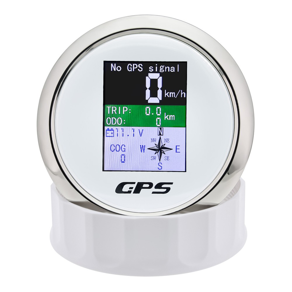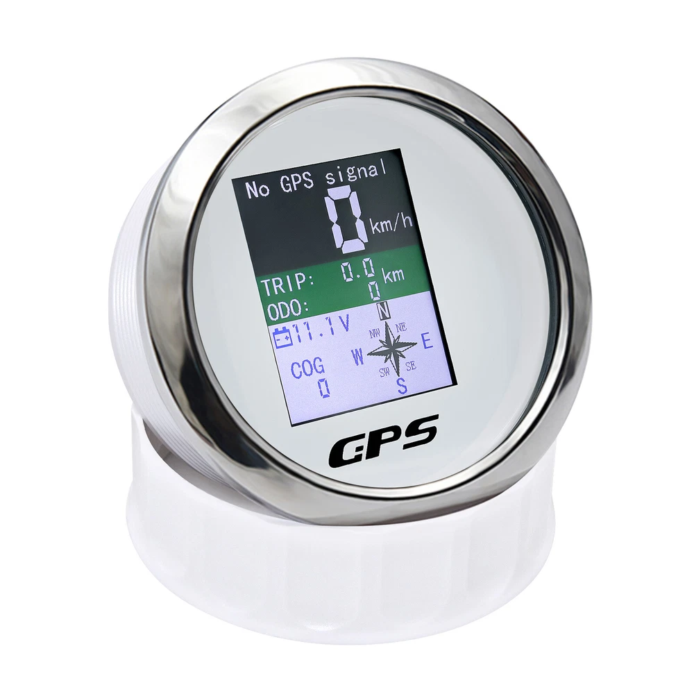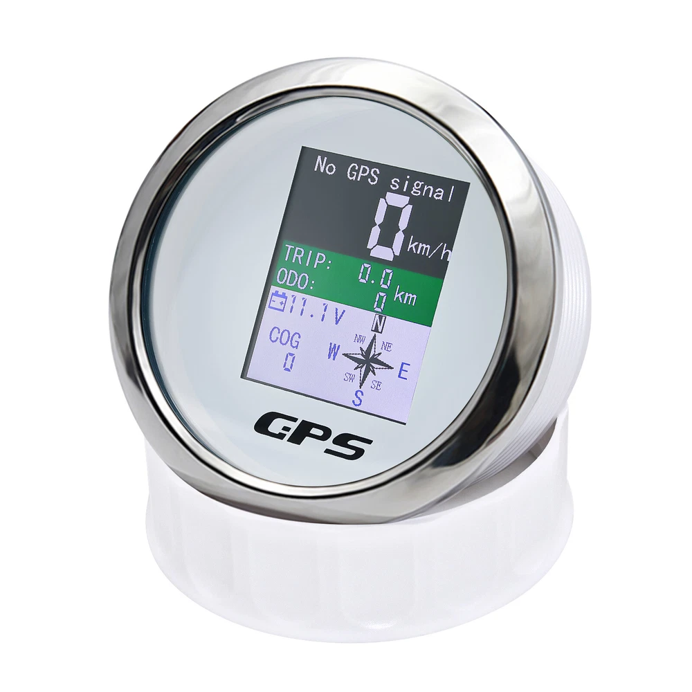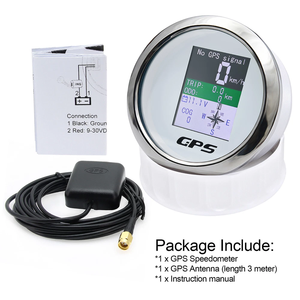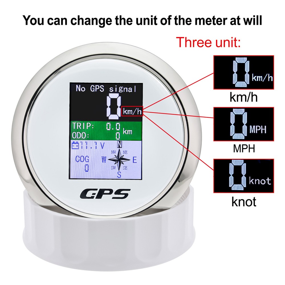 85mm Digital Car Boat GPS Speedometer Odometer Voltmeter Gauge MPH Kmh Knots US 85mm Waterproof Digital GPS Speedometer Odometer Voltmeter for Boat Car Truck US Features: GPS SOG:Speed Over Ground: 0-600km/h ODO: odometer:0-999999km (can be adjusted by the back button.) TRIP:0-999.9km (Return Zero When off electricity.) COG:Course Over Ground (Orientation Pointer) Battery voltage: 9~32VDC Three unit can be swicthed:knot;mph;km/h Degree of Protection:IP67 Backlight:TFT Screen Input Parameter: GPS signal GPS antenna length 3 mete Dimensions: 85mm diameter (3-3/8") 55mm Depth (2-3/4" Package Included: 1*GPS Speedometer 1*GPS Antenna 1*Multi-plug socket 1*Instruction