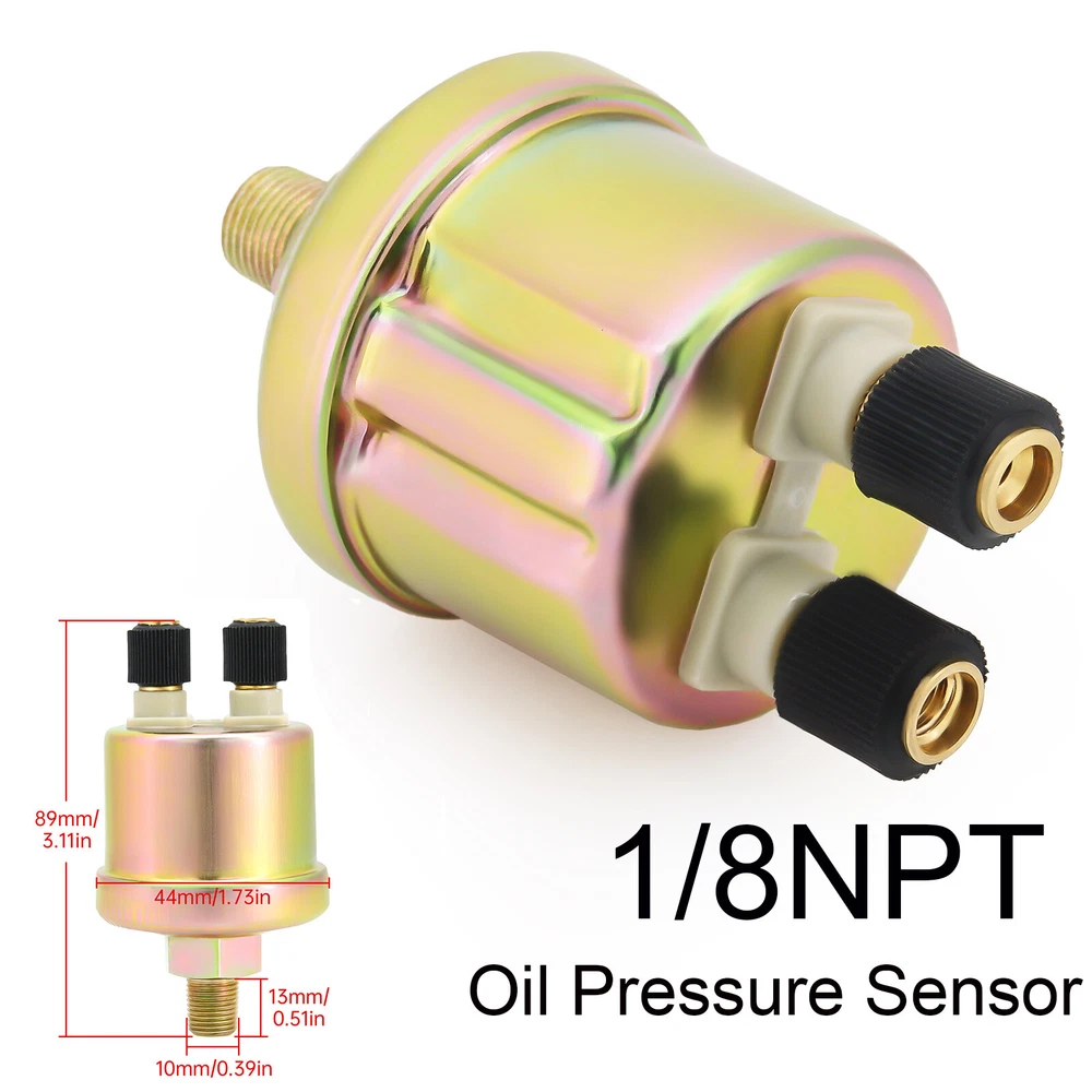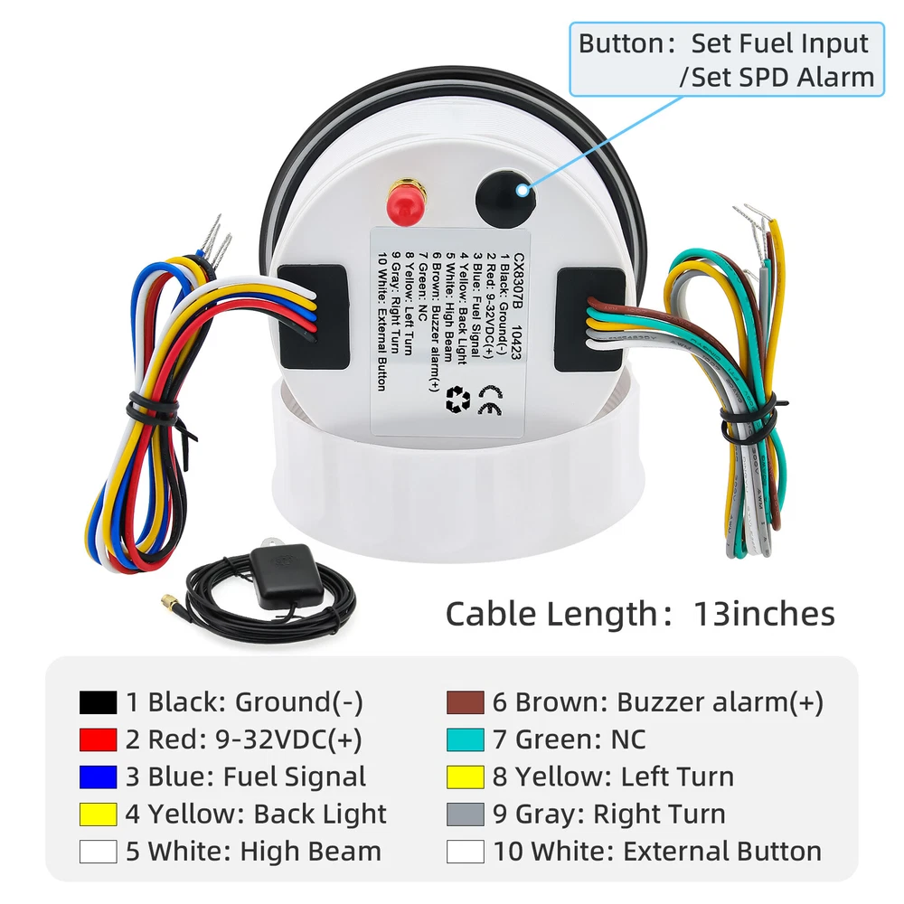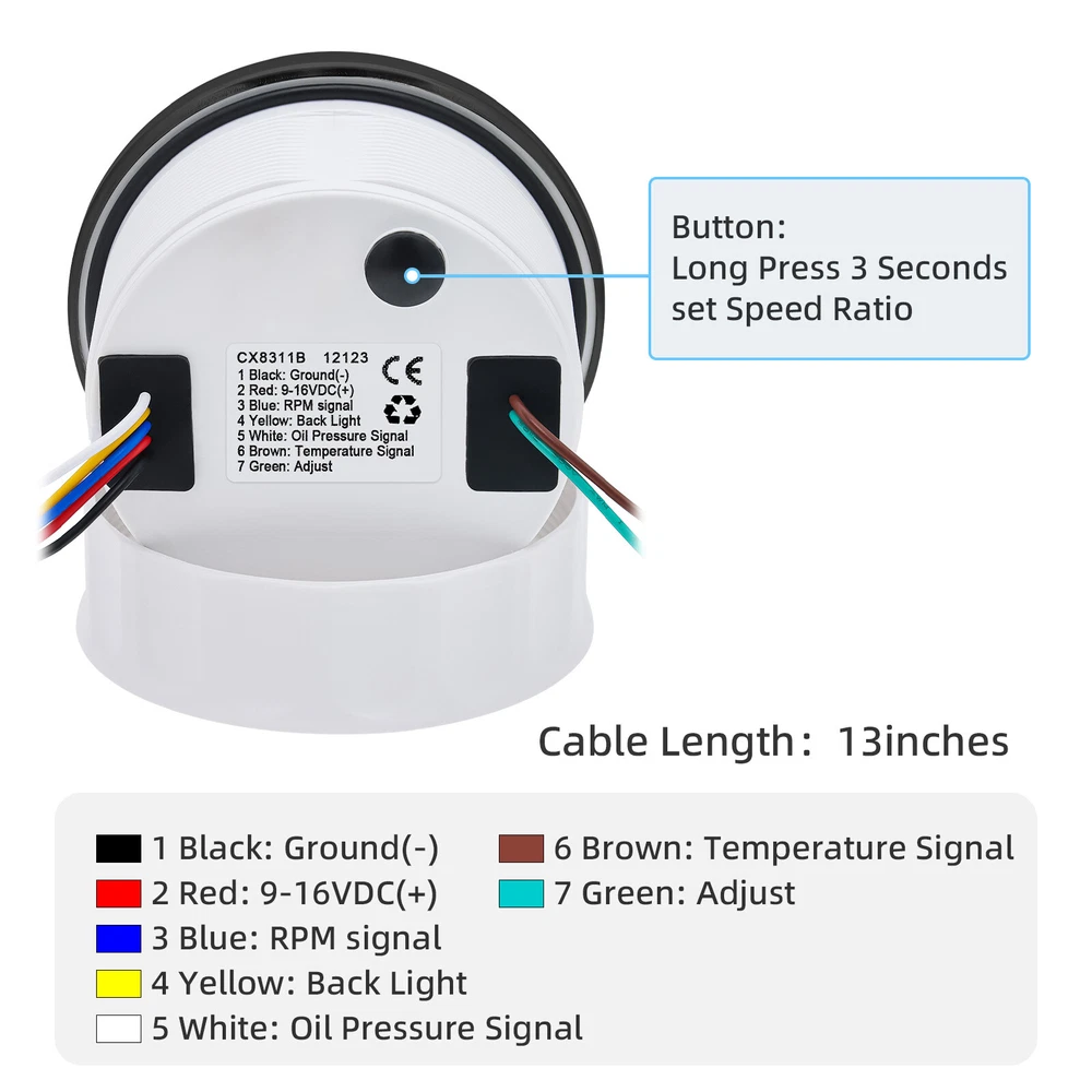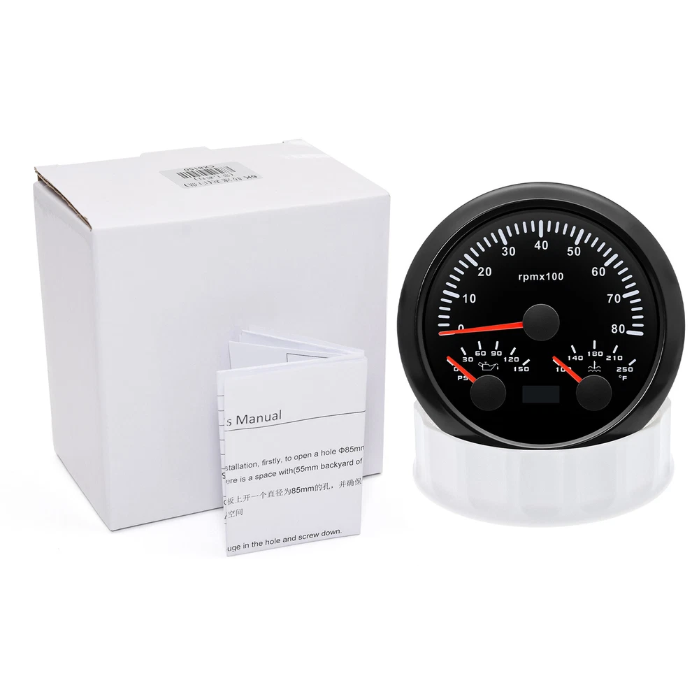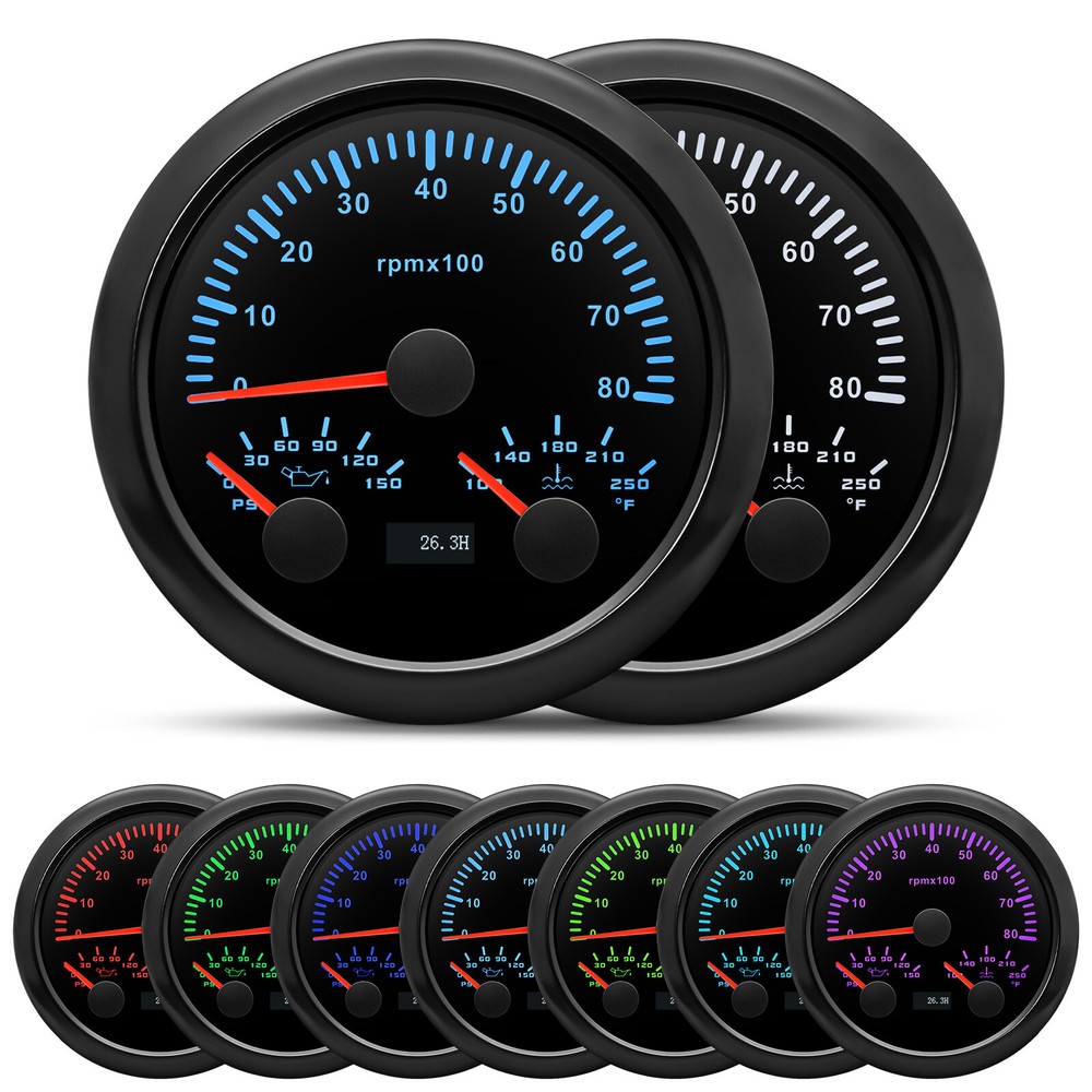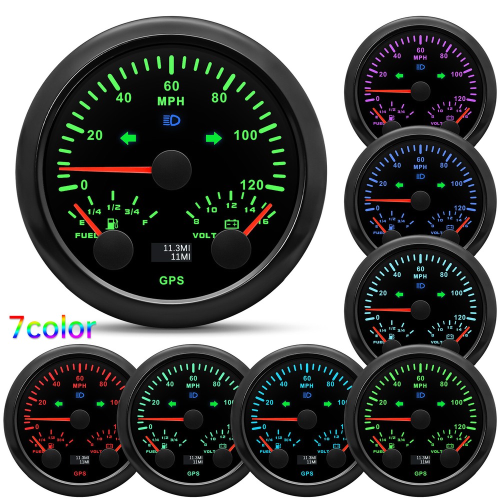 85mm GPS Speedometer 0-120MPH Fuel/Volt/Tacho/Oil Press/Water Temp with Senders 2 Gauge Set With Senders 85mm GPS Speedometer 0-120MPH Fuel Gauge Volt Tachometer 0-8000RPM Water Temp ℉ Oil Press PSI NOTES: The water temperature gauge, Oil pressure gauge does not support desktop testing. It is necessary to connect the SENDING UNITS in order to use it properly. Any helps, please do not hesitate to contact me. Thank you Features: RPM Tachometer Support : Car /Truck/ Boat /Diesel Generator Engine /Gasoline Engine Waterproof:IP67 Excellent anti-fogging function; 316 Stainless steel bezel with curved glass; Convenient Installation by multi-plug socket connecting way; With curved glass( with anti-fog function). 7 colors baclight for your choose (red (default)→green →blue →white →yellow →cyan →Purple→(automatic)),customers can adjust any color that you like Tachometer fit for Car /Truck/ Boat /Diesel Generator Engine /Gasoline Engine GPS Speedometer Specification: Size: 85mm GPS Speedometer: 0-120MPH Fuel level: 0-190ohms, 240-33ohms, 10-180ohms, 0-90ohms(Can be adjusted) Voltage: 8-16V Working voltage: 9-32VDC Working current: <100mA Working temperature: -30-80℃ Storage temperature: -40-85℃ Backlight :7 Color backlight Color: Black Tachometer Specification: Size: 85mm Tachometer: 0-8000RPM Oil pressure: 0-150PSI Water temperature: 100-250℉ Engine hours: 0.0-99999.9H Working voltage: 9-32VDC Working current: <100mA Working temperature: -30-80℃ Storage temperature: -40-85℃ Backlight :7 Color backlight Color: Black Input parameter Oil pressure sensor: 10~184ohms Temperature sensor: 301~22ohms Tachometer Connection 1 Black: Ground(-) 2 Red: 9-32vDC(+) 3 Blue:PRM signal 4 Yellow: Backlight 5 White: Oil pressure signal 6 Brown:Temperature signal 7 Green:Adjust GPS Speedometer Connection 1 Black : Ground(-) 2 Red : 9~32vDc(+) 3 Blue : Fuel signal 4 Yellow : BackLight 5 White : High Beam 6 Brown: Buzzer alarm(+) 7 Green: Nc 8 Yellow: Left Turn 9 Gray: Right Turn 10 white: External Button Package Included: 1 x 85mm 3 in 1 GPS Speedometer 1 x 85mm 3 in 1 Tachometer Gauge 1 x GPS Antenna 1 x 1/8NPT Temp sensor 1 x 1/8NPT Pressure sensor 2 x Cable 2 x Installation Instruction