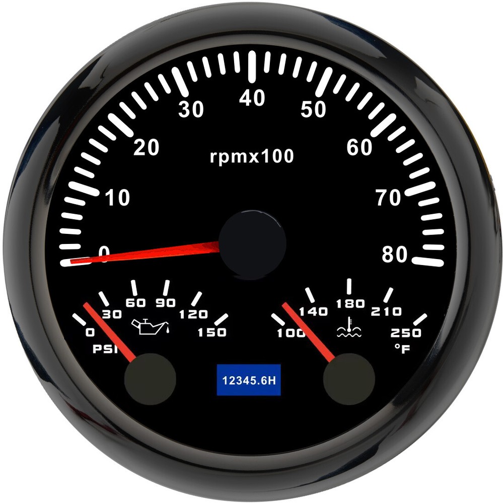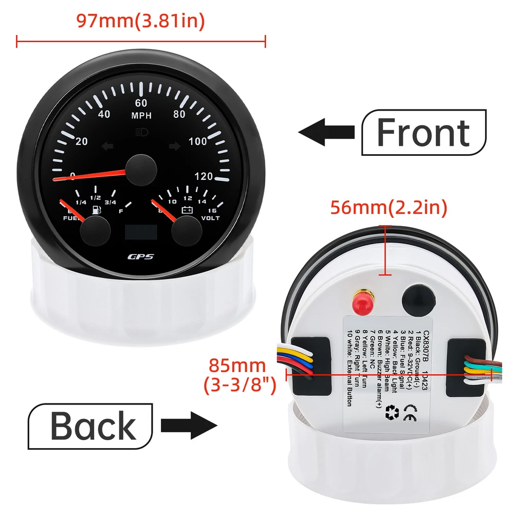 85mm GPS Speedometer 0-120MPH Fuel Gauge/Volt/Tacho/Oil/WaterTemp with Senders 2 Gauge Set With Senders 85mm GPS Speedometer 0-120MPH Fuel Gauge Volt Tachometer 0-8000RPM Water Temp ℉ Oil Press PSI NOTES: The water temperature gauge, Oil pressure gauge does not support desktop testing. It is necessary to connect the SENDING UNITS in order to use it properly. Any helps, please do not hesitate to contact me. Thank you Features: RPM Tachometer Support : Car /Truck/ Boat /Diesel Generator Engine /Gasoline Engine Waterproof:IP67 Excellent anti-fogging function; 316 Stainless steel bezel with curved glass; Convenient Installation by multi-plug socket connecting way; With curved glass( with anti-fog function). 7 colors baclight for your choose (red (default)→green →blue →white →yellow →cyan →Purple→(automatic)),customers can adjust any color that you like Tachometer fit for Car /Truck/ Boat /Diesel Generator Engine /Gasoline Engine GPS Speedometer Specification: Size: 85mm GPS Speedometer: 0-120MPH Fuel level: 0-190ohms, 240-33ohms, 10-180ohms, 0-90ohms(Can be adjusted) Voltage: 8-16V Working voltage: 9-32VDC Working current: <100mA Working temperature: -30-80℃ Storage temperature: -40-85℃ Backlight :7 Color backlight Color: Black Tachometer Specification: Size: 85mm Tachometer: 0-8000RPM Oil pressure: 0-150PSI Water temperature: 100-250℉ Engine hours: 0.0-99999.9H Working voltage: 9-32VDC Working current: <100mA Working temperature: -30-80℃ Storage temperature: -40-85℃ Backlight :7 Color backlight Color: Black Input parameter Oil pressure sensor: 10~184ohms Temperature sensor: 301~22ohms Tachometer Connection 1 Black: Ground(-) 2 Red: 9-32vDC(+) 3 Blue:PRM signal 4 Yellow: Backlight 5 White: Oil pressure signal 6 Brown:Temperature signal 7 Green:Adjust GPS Speedometer Connection 1 Black : Ground(-) 2 Red : 9~32vDc(+) 3 Blue : Fuel signal 4 Yellow : BackLight 5 White : High Beam 6 Brown: Buzzer alarm(+) 7 Green: Nc 8 Yellow: Left Turn 9 Gray: Right Turn 10 white: External Button Package Included: 1 x 85mm 3 in 1 GPS Speedometer 1 x 85mm 3 in 1 Tachometer Gauge 1 x Fuel level sending units 1 x 1/8NPT Temp sensor 1 x 1/8NPT Pressure sensor 2 x Cable 2 x Installation Instruction
