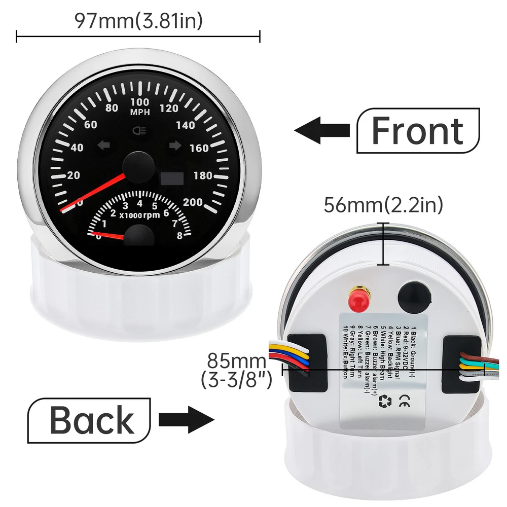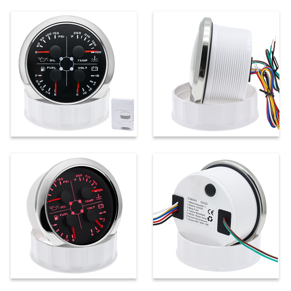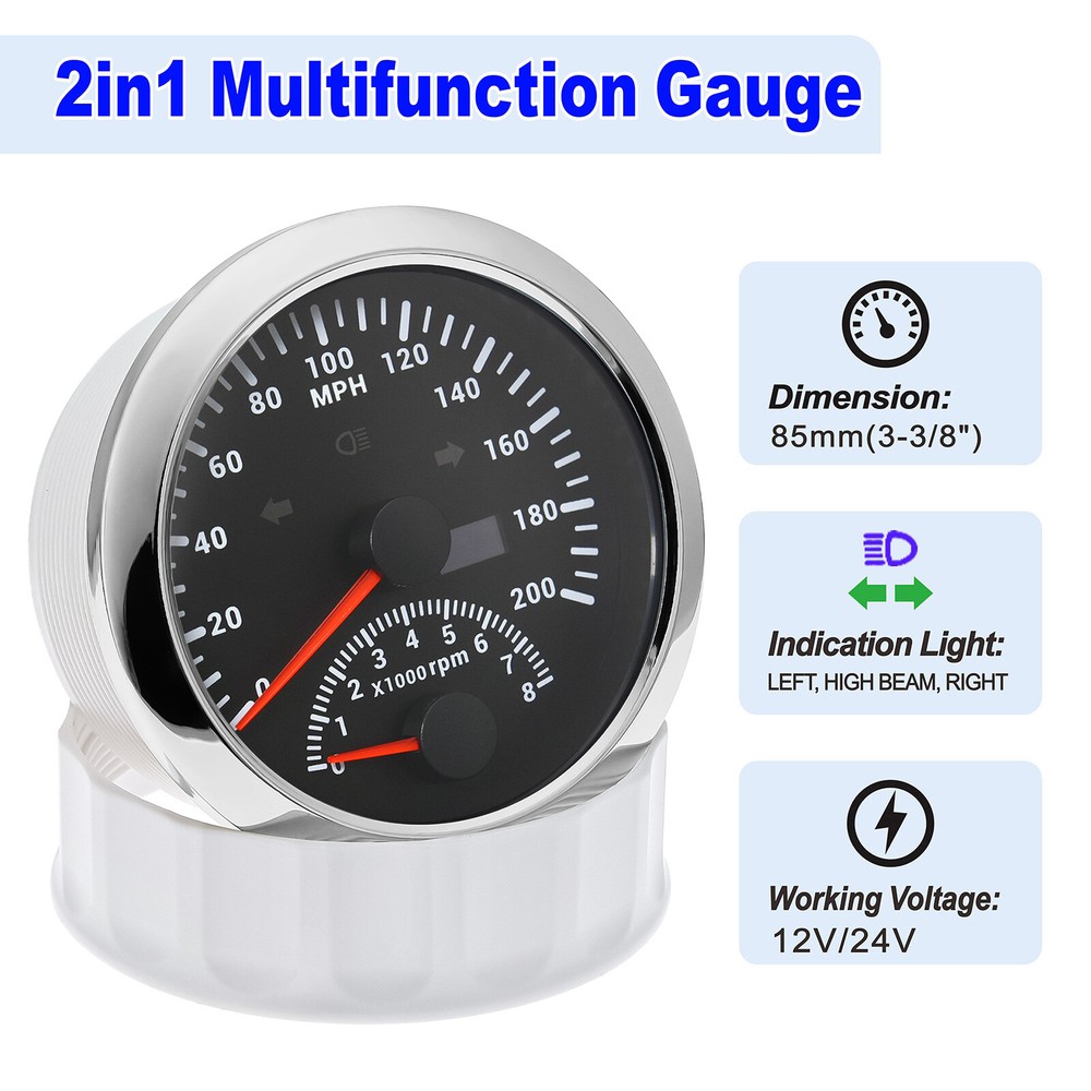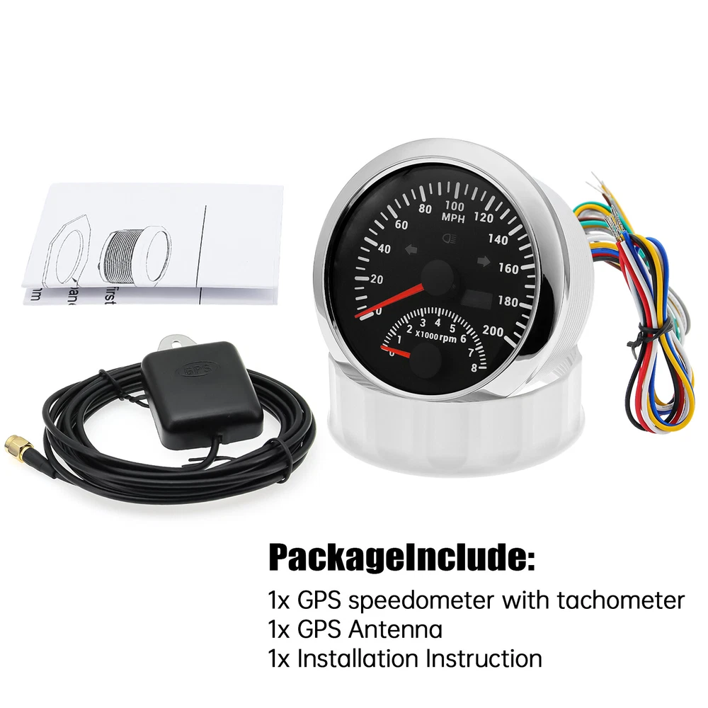 2 Gauge Set with Senders 85mm GPS Speedometer 200MPH W/tacho & 85mm 4 in 1 Gauge 2 Gauge Set With Senders 85mm GPS Speedometer 0-200MPH with 85mm Fuel Level Water Temp Oil Pressure Volt Features: Suitable for all vehicles and off-road vehicles The signal comes directly from the satellite signal receiver(GPS Antenna), don't need other speed sensor. The gauge has the advantages of high precision, quick location confirmation and short start up time. IP67 waterproof and dustproof grade Reverse polarity protection and anti-fogging performance Stepper motors used for full range of stepping gauges, great feature with its less power consumption, longer life, higher precision, etc. Most importantly, the gauge is easy to setup, and can be used in all vehicles, boats and off-road vehicles. GPS Speedometer Specifications: Application: Universal fit for Motorcycle/ Boat/Truck/Bus/Car Electronic Speedometer (stepper motor) No Mechanic Sensor, get speed signal from GPS Speed ≠0 and show accurate speed in tunnel with the help of accelerometer Total Mileage Adjustable GPS Blind Area Odometer Compensation OverSpeed Buzzer Alarm (Value Adjustable) Indication Light (Left, Right and High Beam Installation Diameter: 85mm (3 3/8") Speed Range: 0~200MPH RPM Range : 0~8000RPM Mileage Range: 0-99999.9miles Working Voltage: 12V/24V Working temperatures: - 40 to 85°C Protection rank: IP67 Waterproof Reverse polarity protection and anti-fogging performance 4 IN 1 Gauge Technical Data: Fixing dimension: 85mm Indicating Range: Oil press. meter: 0-150PSI Water temp. meter: 100-250℉ Fuel level meter: 0-190ohms/240-33ohms, empty-full; The signal can be adjusted Voltmeter: 8-16V Working Voltage: 12V Input Signal: 10-184ohms for 0-150PSIoil pressure meter; 0-190ohms for fuel level meter;(Default 0-190ohms, can adjust to 240-33ohms) 8-16V voltage meter; Input Signal 320-22ohms for water temperature meter Red backlight Protection grade is IP67, the whole body is completely waterproof; Excellent antifogging function; 316 Stainless steel bezel with curved glass; Convenient Installation by multi-plug socket connecting way; Accessories: matched with connectors, Installation Instruction Package Included: 1 x 85mm 4 in 1 Multifunctional Gauge 1 x 85mm GPS Speedometer Gauge 1 x M16*1.5 Tacho Sensor 1 x 1/8NPT Oil pressure Sensor 1 x 1/8NPT Water Temp Sensor 1 x GPS Antenna 2 x Cable 2 x Installation Instruction