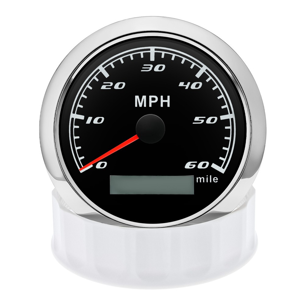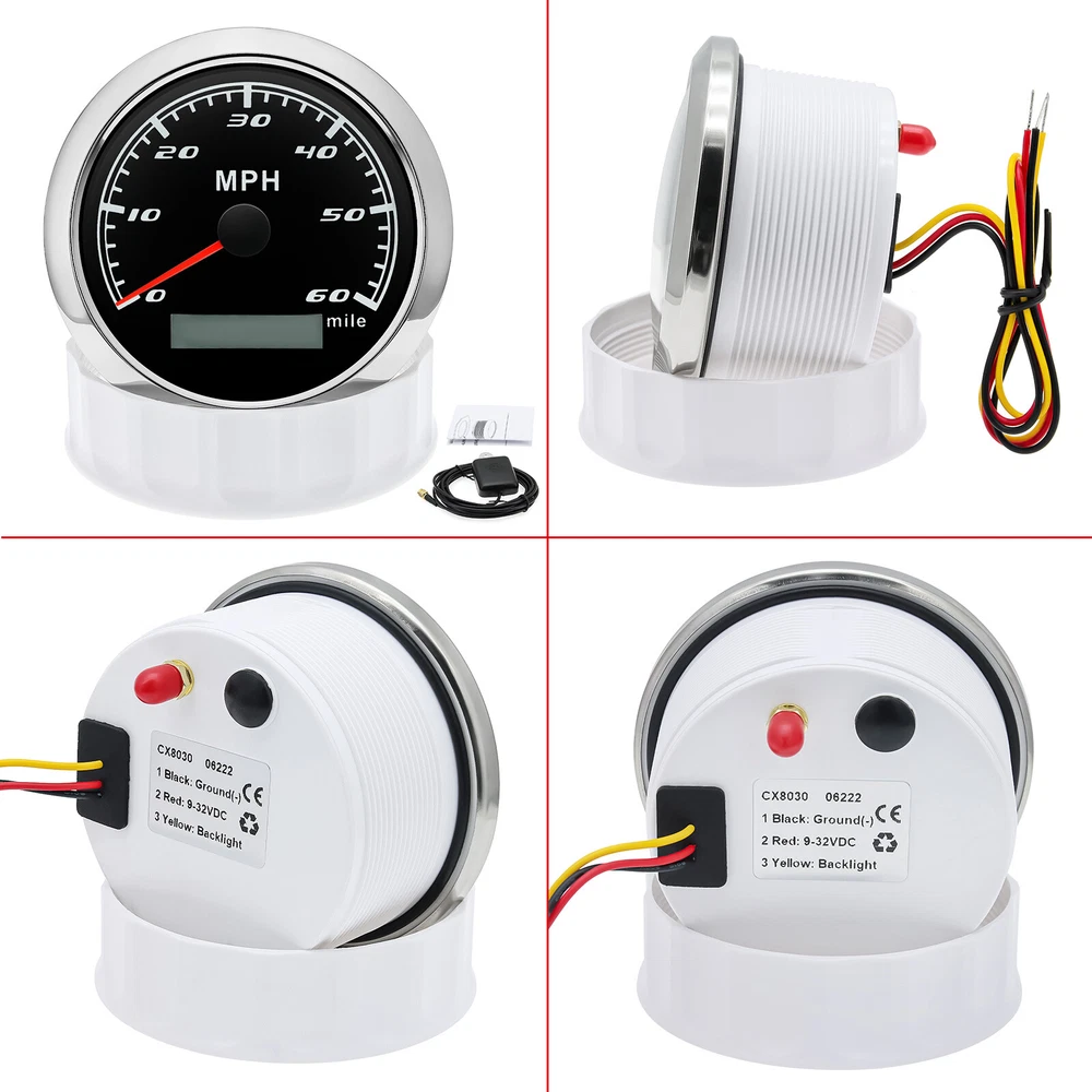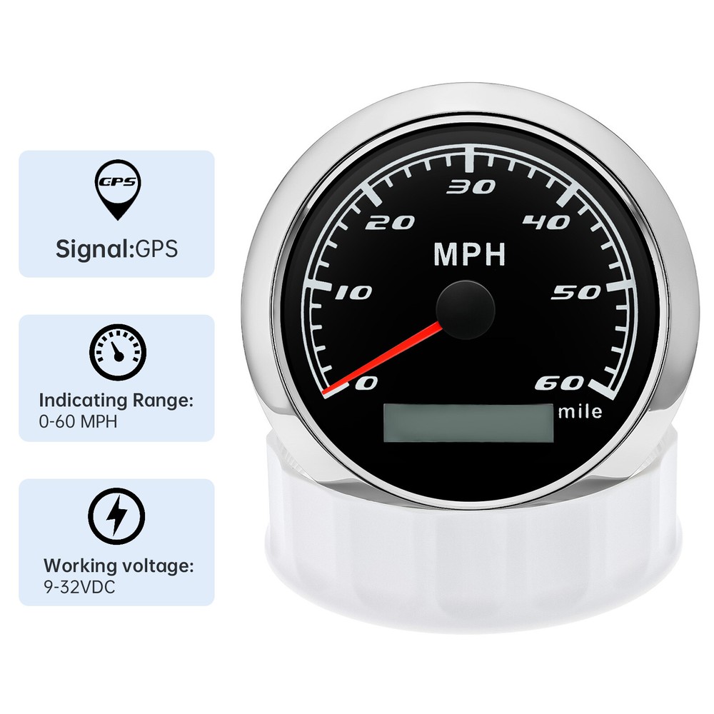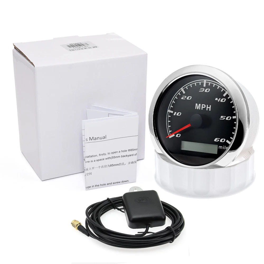 85mm GPS Speedometer 0-60MPH Odometer Gauge 7 Colors LED For Car Truck Boat 85mm GPS Speedometer Gauge Odometer 0-60MPH 7 Colors LED for Car Boat Motorcycle Specifications: Dial: Black Material: Stainless Steel 316L Bezel + Anti-fog Glass Install Diameter: Φ85mm or 3-3/8" Signal: GPS Working Voltage: 9~32V DC Working Current: ≤100mA Operating Temperature: -30℃ ~ 75℃ Storage Temperature: -40℃ ~ 85℃ Size: 12x8x12cm / 4.72x3.1x4.75 inch IP67 waterproof and dustproof grade Indication Range: 0-60 MPH Backlight:7 Colors Backligt Product Descriptions High-brightness LED backlight. 316 stainless steel for long-term use even in acid-base, humid environment. IP67 waterproof and dust-proof grade. With curved glass( with anti-fog function). Suitable for all kinds of vehicle modification. Using stepper motor drive pointer, accurate display of the engine speed, and with the LCD display clear display mileage. Gauges have many kinds backlight color (red,yellow,orange,green,blue,purple,white),customers can adjust any color that you like. Package Includes: 1X 85MM Digital GPS Speedometer Gauge 1X Instruction 1X GPS Antenna