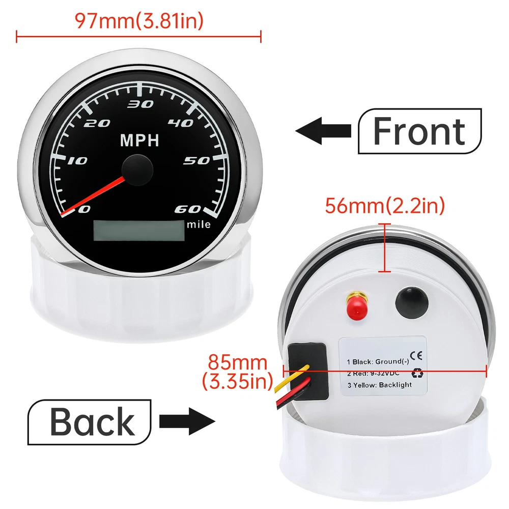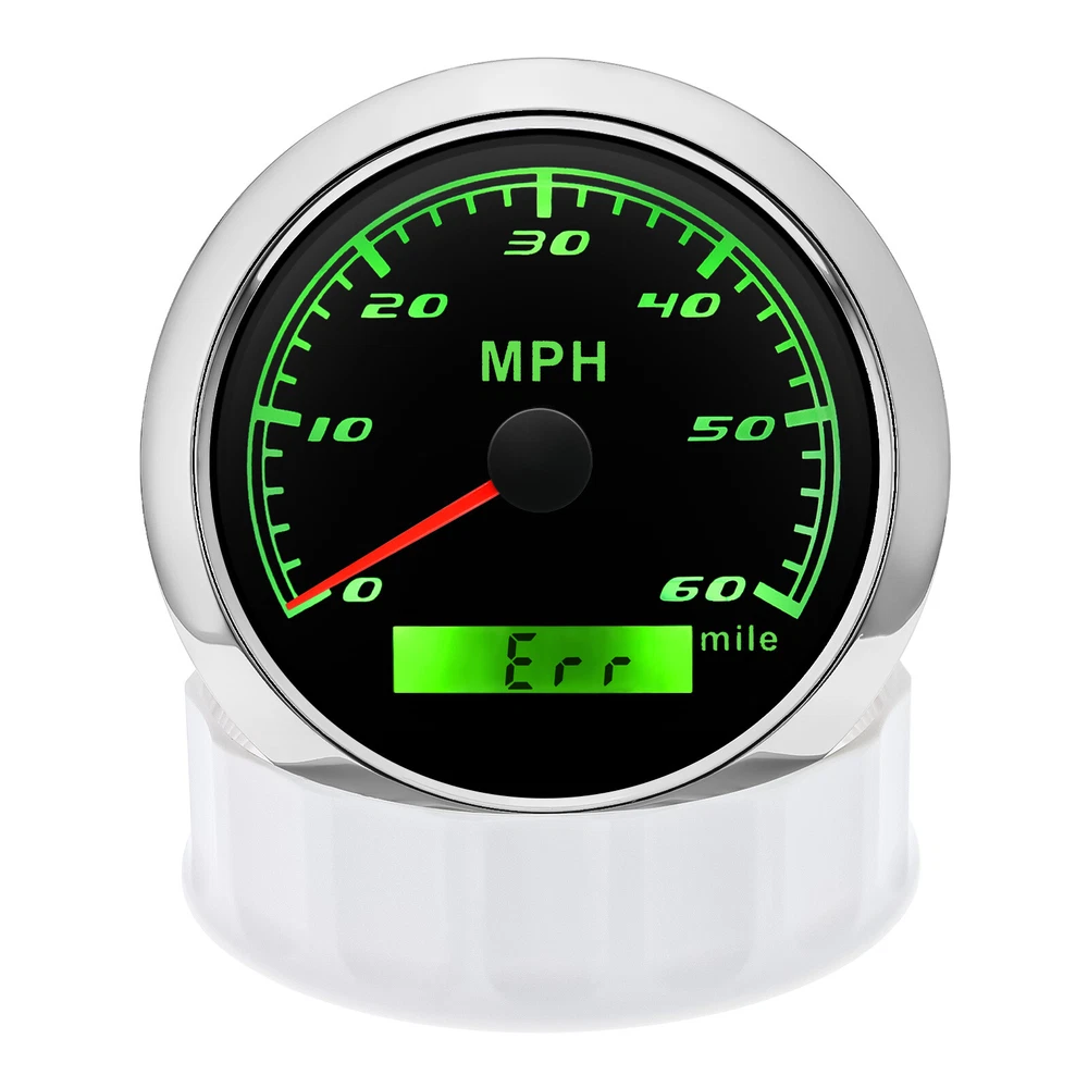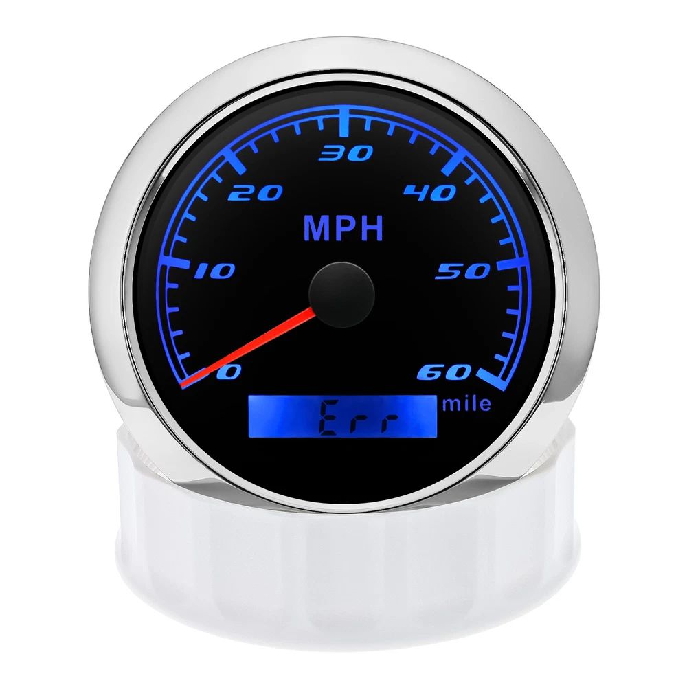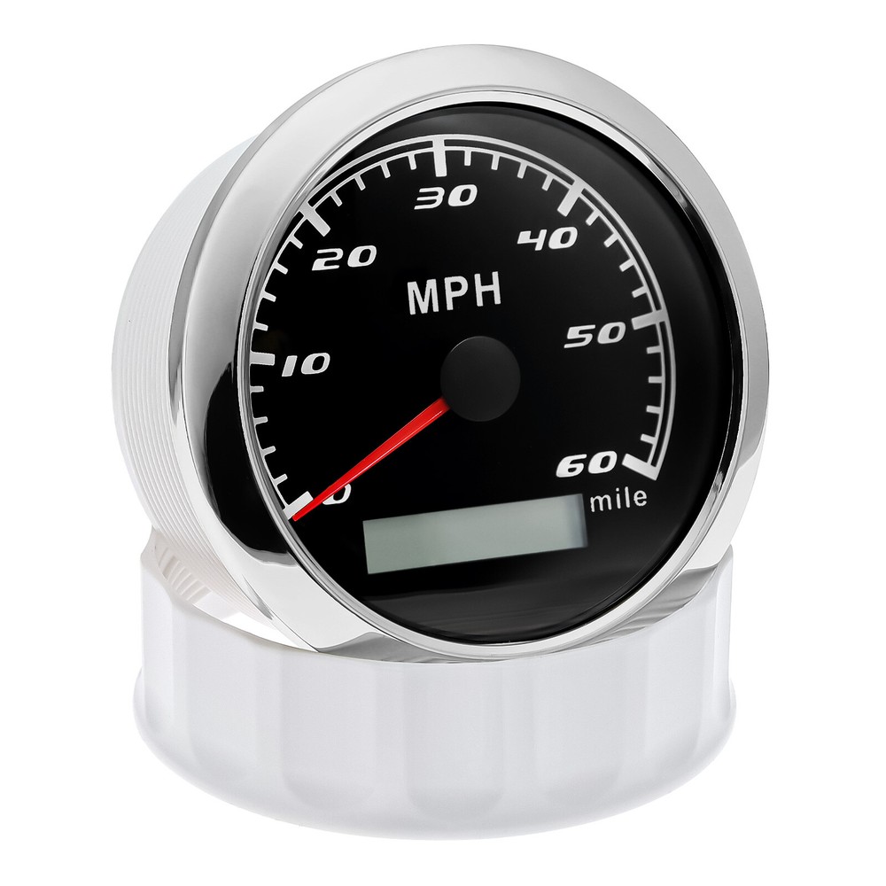 85mm GPS Speedometer 0-60MPH Odometer Gauge 7 Colors LED For Car Truck Boat 85mm GPS Speedometer Gauge Odometer 0-60MPH 7 Colors LED for Car Boat Motorcycle Specifications: Dial: Black Material: Stainless Steel 316L Bezel + Anti-fog Glass Install Diameter: Φ85mm or 3-3/8" Signal: GPS Working Voltage: 9~32V DC Working Current: ≤100mA Operating Temperature: -30℃ ~ 75℃ Storage Temperature: -40℃ ~ 85℃ Size: 12x8x12cm / 4.72x3.1x4.75 inch IP67 waterproof and dustproof grade Indication Range: 0-60 MPH Backlight:7 Colors Backligt Product Descriptions High-brightness LED backlight. 316 stainless steel for long-term use even in acid-base, humid environment. IP67 waterproof and dust-proof grade. With curved glass( with anti-fog function). Suitable for all kinds of vehicle modification. Using stepper motor drive pointer, accurate display of the engine speed, and with the LCD display clear display mileage. Gauges have many kinds backlight color (red,yellow,orange,green,blue,purple,white),customers can adjust any color that you like. Package Includes: 1X 85MM Digital GPS Speedometer Gauge 1X Instruction 1X GPS Antenna