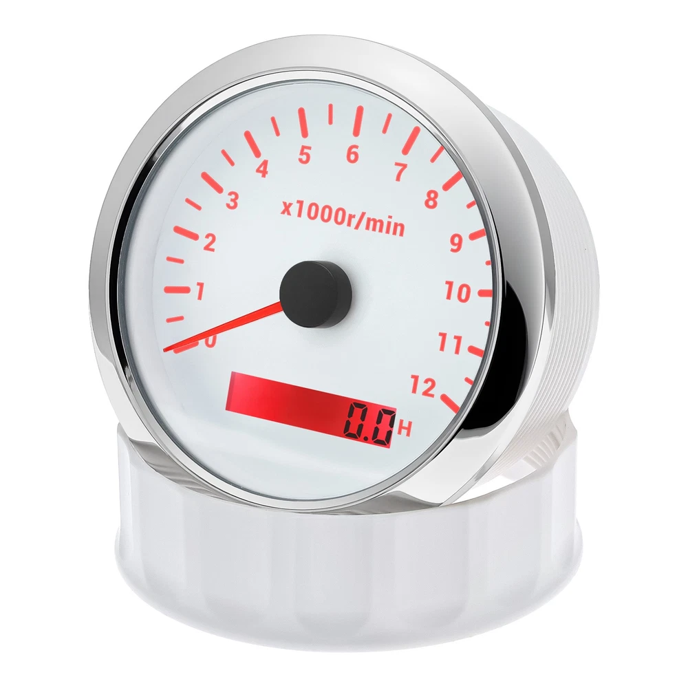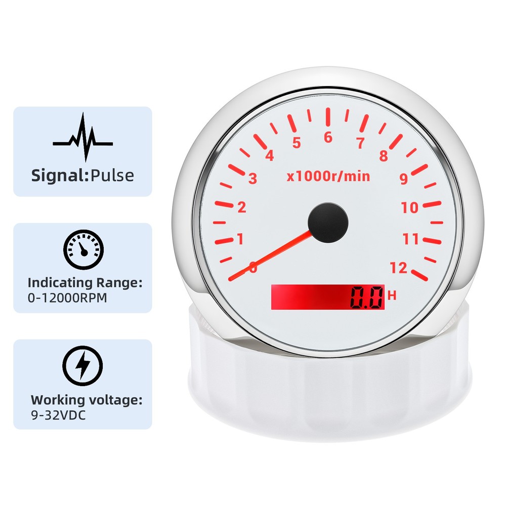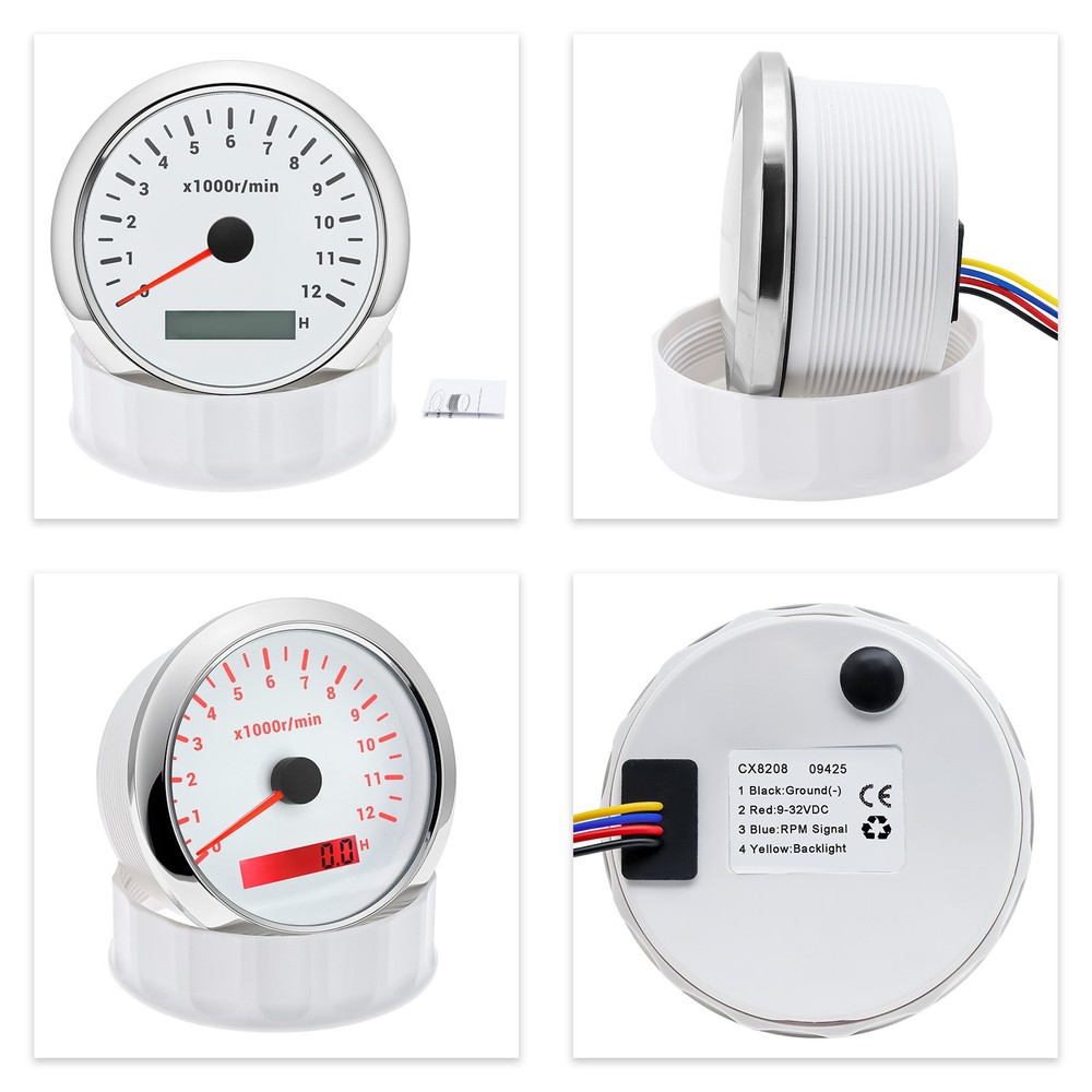 85mm White Tachometer Gauge 0-12000RPM Waterproof For Marine Boat Car Truck 85mm Car Tachometer 0-12000RPM LCD Digital Hourmeter With Red Backlight For Car Truck Motorcycle ATV UTV Marine Boat Yacht Specification: Fit For: Outboard Gas or Disel Engine Car Truck Motorcycle ATV UTV Marine Boat Yacht Face Color: White Face with Chrome bezel Bezel Materials: Stainless Steel Indicating Range: 0-12000RPM Operating Voltage:9-32VDC Operating Current:≤100mA Operating Temperature:-30~+75 ℃ Storage Temperature:-40~+85 ℃ Install diameter: 85mm(3-3/8") Grade of protection :IP67 Package Method :Neutral box Features: -100% Brand new and high quality. -Excellent anti-fogging performance. -316L Stainless steel bezel with curve glass. -Easy installation with multi-plug socket connection design. -RED LED Connection: Red--+9-32VDC Black--Ground(-) Orange--Backlight(+) Blue--Signal Input Package Included: 1xTachometer 1xWiring Harness 1x Instruction manual This tacho must be hooked up to the "W" terminal on vehicle alternator. Many diesel engines and most inboard gas boat engine alternator have this connection. It can also be working with tachometer sender or ECU of the car (pulse signal) Installation instructions: 1.Opening a hole in the panel (your cabin board and dashboard) with a diameter of 85mm,Insert meter into the hole,The panel corresponding to the instrument panel is marked with a convex table,and open a small notch in this location,To ensure that there is at least 85mm of the instrument panel at the back of the instrument. 2.After the instrument is mounted in the panel,Screw down with a fixed ring. 3.Connect the wire,the instrument housing is directly connected to the 12~24V power supply. 4.Insert wire harness,Firmly locked in the table. How to adjust the speed ratio? 1. Turn on the power supply first. 2. Press and hold the mode button for three seconds to enter the setting speed ratio mode. Then adjust the speed ratio of 1-300 according to your request. 3. After setting the data will be saved automatically. 4.If your sensor is installed on the flywheel plate, the speed ratio corresponds to the number of gears of the engine; If the speed signal comes from the W terminal, the speed ratio is equal to half the number of poles. 5.When the engine is idle, the rev counter will normally display 600-800 U.min, which means the transmission ratio is correct. If not, you can reduce or increase the gear ratio to check the speed difference.