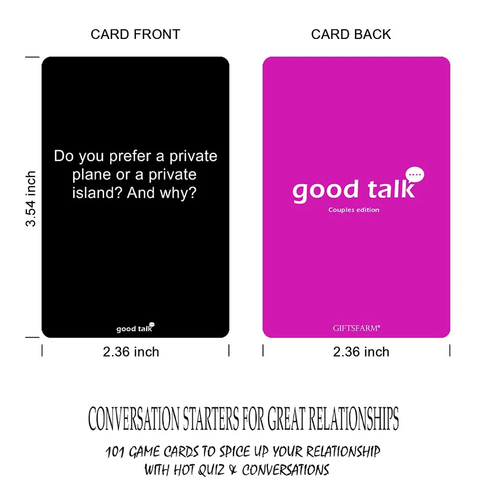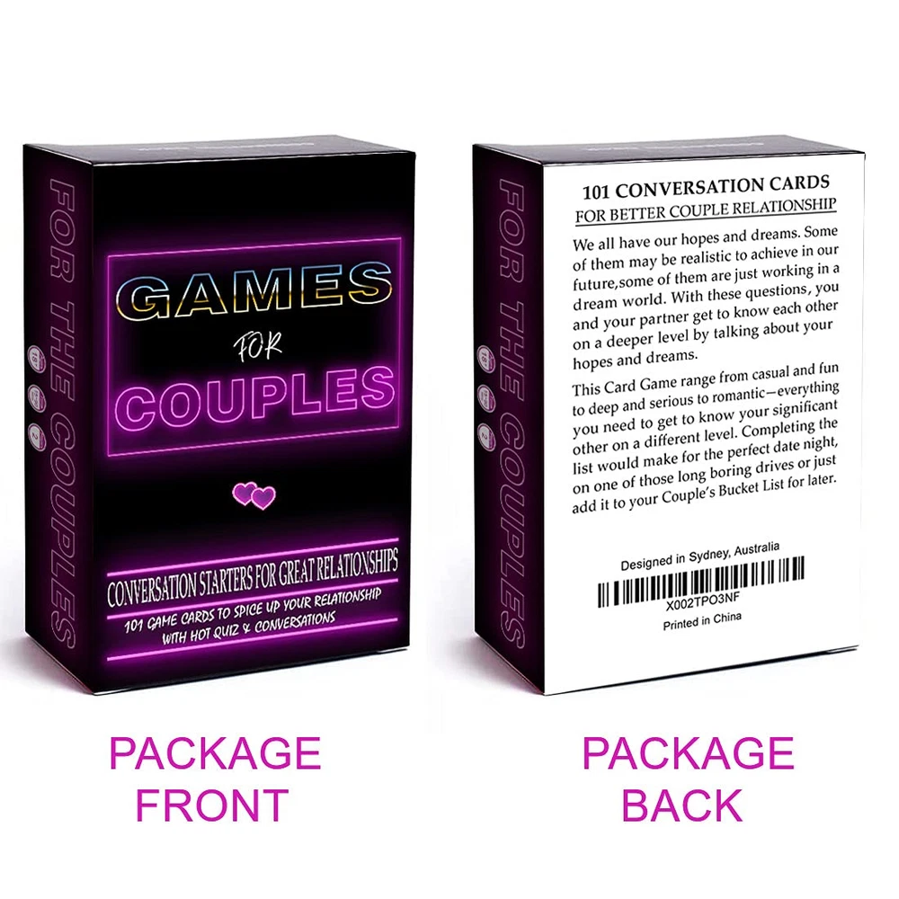 GAMES FOR COUPLES: Whether you just Started Dating or have been Married for Decades, Our Couples Game Cards will be a Sure Fire Way to get the Sparks Flying Between You Two! Get to Know Each Other Better as you dive into Meaningful Conversations and perform Funny Challenges. QUALITY TIME WITH YOUR PARTNER: Put aside the Day-to-Day Thoughts and Worries and Focus only on the Game and your Partner. A Fun Way to Create Deeper Understanding & Strengthen your Relationship & Connection. It will also be Perfect for Multiple Occasions – Dating, Engaged Couples, Wedding, Anniversaries, Bridal Showers, Newlyweds, Valentine’s Day, etc. SIMPLE RULES: With No Complicated Rules, you and your partner can Start Playing Right Away. Simply give the Cards a Good Shuffle and Take Turns Drawing from the Pile, One Person Reads the Question, and the Other Give His / Her Answer. This is YOUR TIME Enjoy It Together! A Perfectly Simple Present: Each Product is thoughtfully enclosed in Sophisticated Packaging, ensuring it arrives in Perfect Condition and Ready to be Presented as a Delightful Gift. The High-Quality Wrapping not only Adds to the Charm of your Present but also Safeguards the Art against any Transport Damage. Your Happiness, Our Promise: We're Committed to Your Contentment. Should there be any dissatisfaction with your order, Rest Assured, we're here to Make Things Right. Whether it's a complete Refund or a Brand-new Replacement you seek, no questions asked. Our aim is to Enhance those Precious Moments with your Dear ones through our Innovative and Distinctive Designs. Fun Conversation Cards Game for Couples