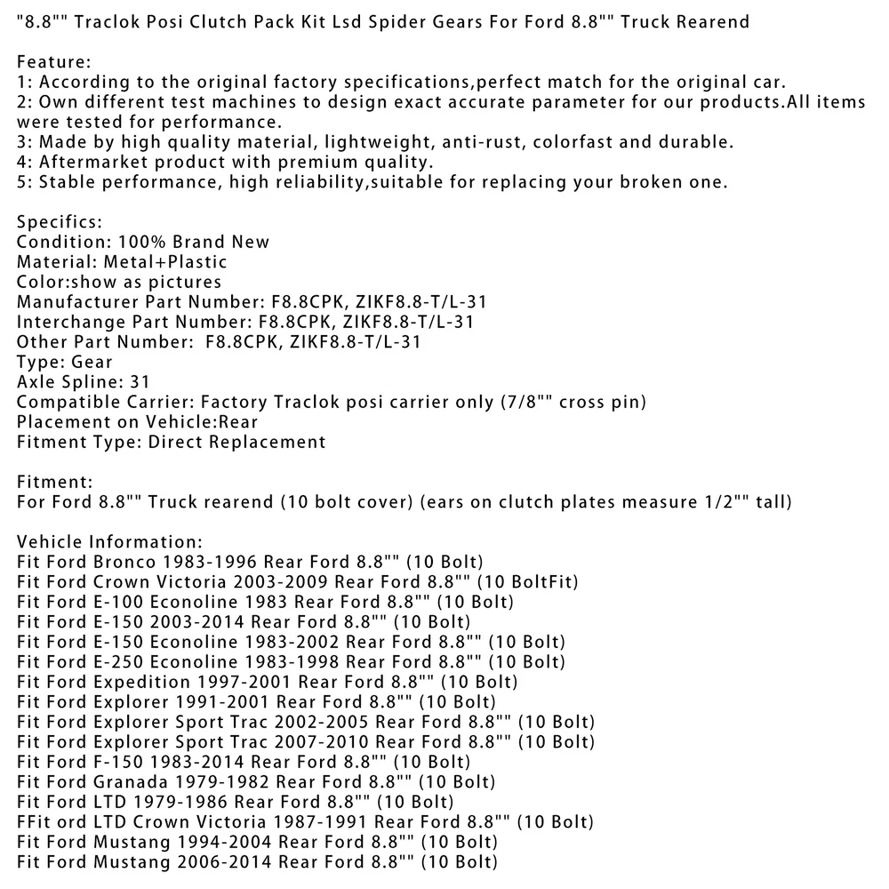 Locker Axle SL D44-30 Posi 30 Spline For Dana 44 Yukon Spartan Locker 169.85 USD Free shipping Rear Differential Coupling 387613KA0B For Infiniti QX60 Nissan Pathfinder 13-20 429.85 USD Free shipping 47800-39000 Coupling Assy 4WD For Hyundai Santa Fe 2001-2005 269.85 USD Free shipping Rear Differential Coupling 387613KA0B For Infiniti QX60 Nissan Pathfinder 13-20. 369.85 USD Free shipping Rear Differential Locker SL M35-1.5-27 For Jeep Wrangler Dana 35 27 Spline 84-04 163.85 USD Free shipping 8.8" Traclok Posi Clutch Pack Kit Lsd Spider Gears For Ford 8.8" Truck Rearend Feature: 1: According to the original factory specifications,perfect match for the original car. 2: Own different test machines to design exact accurate parameter for our products.All items were tested for performance. 3: Made by high quality material, lightweight, anti-rust, colorfast and durable. 4: Aftermarket product with premium quality. 5: Stable performance, high reliability,suitable for replacing your broken one. Specifics: Condition: 100% Brand New Material: Metal+Plastic Color:show as pictures Manufacturer Part Number: F8.8CPK, ZIKF8.8-T/L-31 Interchange Part Number: F8.8CPK, ZIKF8.8-T/L-31 Other Part Number: F8.8CPK, ZIKF8.8-T/L-31 Type: Gear Axle Spline: 31 Compatible Carrier: Factory Traclok posi carrier only (7/8" cross pin) Placement on Vehicle:Rear Fitment Type: Direct Replacement Fitment: For Ford 8.8" Truck rearend (10 bolt cover) (ears on clutch plates measure 1/2" tall) Vehicle Information: Fit Ford Bronco 1983-1996 Rear Ford 8.8" (10 Bolt) Fit Ford Crown Victoria 2003-2009 Rear Ford 8.8" (10 BoltFit) Fit Ford E-100 Econoline 1983 Rear Ford 8.8" (10 Bolt) Fit Ford E-150 2003-2014 Rear Ford 8.8" (10 Bolt) Fit Ford E-150 Econoline 1983-2002 Rear Ford 8.8" (10 Bolt) Fit Ford E-250 Econoline 1983-1998 Rear Ford 8.8" (10 Bolt) Fit Ford Expedition 1997-2001 Rear Ford 8.8" (10 Bolt) Fit Ford Explorer 1991-2001 Rear Ford 8.8" (10 Bolt) Fit Ford Explorer Sport Trac 2002-2005 Rear Ford 8.8" (10 Bolt) Fit Ford Explorer Sport Trac 2007-2010 Rear Ford 8.8" (10 Bolt) Fit Ford F-150 1983-2014 Rear Ford 8.8" (10 Bolt) Fit Ford Granada 1979-1982 Rear Ford 8.8" (10 Bolt) Fit Ford LTD 1979-1986 Rear Ford 8.8" (10 Bolt) FFit ord LTD Crown Victoria 1987-1991 Rear Ford 8.8" (10 Bolt) Fit Ford Mustang 1994-2004 Rear Ford 8.8" (10 Bolt) Fit Ford Mustang 2006-2014 Rear Ford 8.8" (10 Bolt) Fit Ford Ranger 1999-2010 Rear Ford 8.8" (10 Bolt) Fit Ford Thunderbird 1987-1997 Rear Ford 8.8" (10 Bolt) Fit Lincoln Aviator 2005 Rear Ford 8.8" (10 Bolt) Fit Lincoln Continental 1979-1980 Rear Ford 8.8" (10 Bolt) Fit Lincoln Continental 1982-1987 Rear Ford 8.8" (10 Bolt) Fit Lincoln Mark LT 2006 Rear Ford 8.8" (10 Bolt) Fit Lincoln Mark VI 1980-1983 Rear Ford 8.8" (10 Bolt) Fit Lincoln Mark VIII 1993-1998 Rear Ford 8.8" (10 Bolt) Fit Lincoln Navigator 1998-2000 Rear Ford 8.8" (10 Bolt) Fit Lincoln Navigator 2002 Rear Ford 8.8" (10 Bolt) Fit Lincoln Town Car 2003-2010 Rear Ford 8.8" (10 Bolt) Fit Mercury Capri 1979-1986 Rear Ford 8.8" (10 Bolt) Fit Mercury Cougar 1979-1997 Rear Ford 8.8" (10 Bolt) Fit Mercury Grand Marquis 2003-2011 Rear Ford 8.8" (10 Bolt) Fit Mercury Marauder 2003-2004 Rear Ford 8.8" (10 Bolt) Fit Mercury Mountaineer 1997-2010 Rear Ford 8.8" (10 Bolt) Package Include: 1 x Clutch Kit (show as pictures) [* Instruction is not included!] (Strictly Tested , High Quality Products) Note: 1.Please check the description or use the year/make/model check finder and replace part numbers to confirm the compatibility before purchasing. 2.Professional installation is recommended. -About US Founded in 2012, VIPJQ have professional development and sales, and are involved in various products, providing customers with various high-quality products. Since its establishment, VIPJQ has always adhered to the service concept of "customer first" and the management concept of "pursuit of quality", and is committed to providing customers with high-quality original designs. We commit to provide you the best innovative, quality products & professional services with competitive prices. We value every customer, and we look forward to providing solutions for your business needs to help your business achieve its goals, please contact us immediately! We are all about you! We are a Japanese seller,but with large warehouse in USA. We are profesional on Auto Parts,Car Parts,Motorcycle Parts,3C,other hot sale items and so on. We aim to provide to customers high quality product and best service. -About Shipment&Returns The item usually will be dispatched within 3 days after you ordered.All are free shipping. And it usually takes 3-10 working days to delivery depends on buyers' address or other majeure on the way. If you are not satisfied with the items and want to return the item,we hope you could message us first,we will give you the return details, we think we could give you the best service to save your time and money.Thank you. -About Feedback&Customer Service If you are enjoy your shopping here,not only enjoy the items but also the service,we are appreciate you could give us a 5-star feedback. If you are not satisfied with the item,before you give us the negative feedback,we hope we could give you the best solution through our commutication. We think we could do it if you give us the chance.Thank you.
