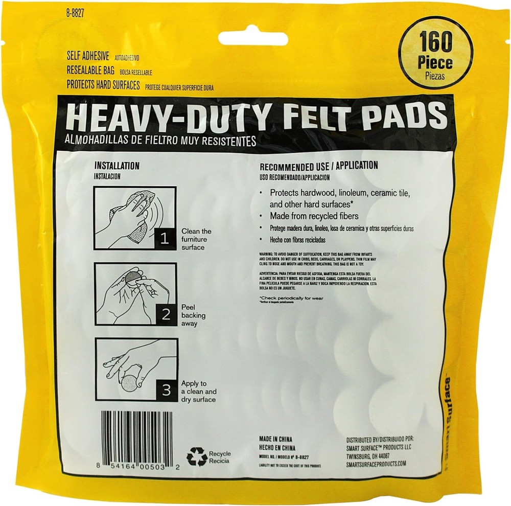 8827 Heavy Duty Self Adhesive Furniture Felt Pads 1-Inch Round, Brown Product Details Product Dimensions: 6.25"L x 1.5"W x 5.25"Th Number of Items: 160 Recommended Uses For Product: Sofa, Table, Chair, Desk Special Feature: Heavy Duty, Non-Slip, Anti-Scratch Number of Pieces: 160 Grip Material: Felt Unit Count: 160 Count Manufacturer: Smart Surface Part Number: HM-41KJ-ZYE8 Item Weight: 3.3 ounces Item model number: 8-8827 Is Discontinued By Manufacturer: No Size: 1-Inch Round Thickness: 0.19 Inches Installation Method: Self-Adhesive Item Package Quantity: 160 Cutting Diameter: 1 Inches Special Features: Heavy Duty, Non-Slip, Anti-Scratch Usage: Commercial/Residential Batteries Included?: No Batteries Required?: No Assembled Diameter: 1 Inches Brand: Smart Surface Material: Felt Color: Brown Surface Recommendation: Laminate, Tile, Hardwood Shape: Round 1-Inch Round Brown Self-Adhesive Furniture Felt Pads 160-Piece Value Pack in Resealable Bag. Simply peel and stick to a clean dry surface. Protects Hard Surfaces including Hardwood, Linoleum, Ceramic Tile & Laminate Also makes furniture slide and easier to move on hard surfaces 1-inch size is ideal for chair legs, and can be also used on a variety of other furniture items.