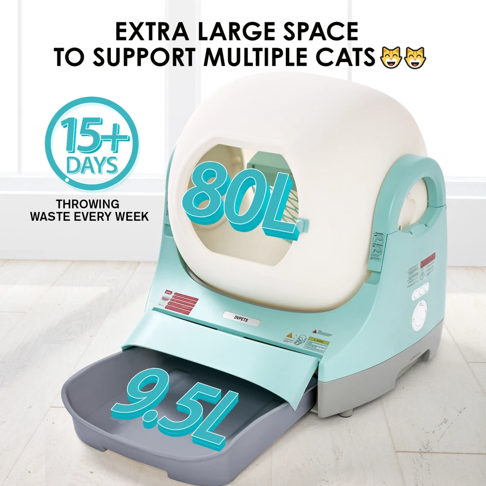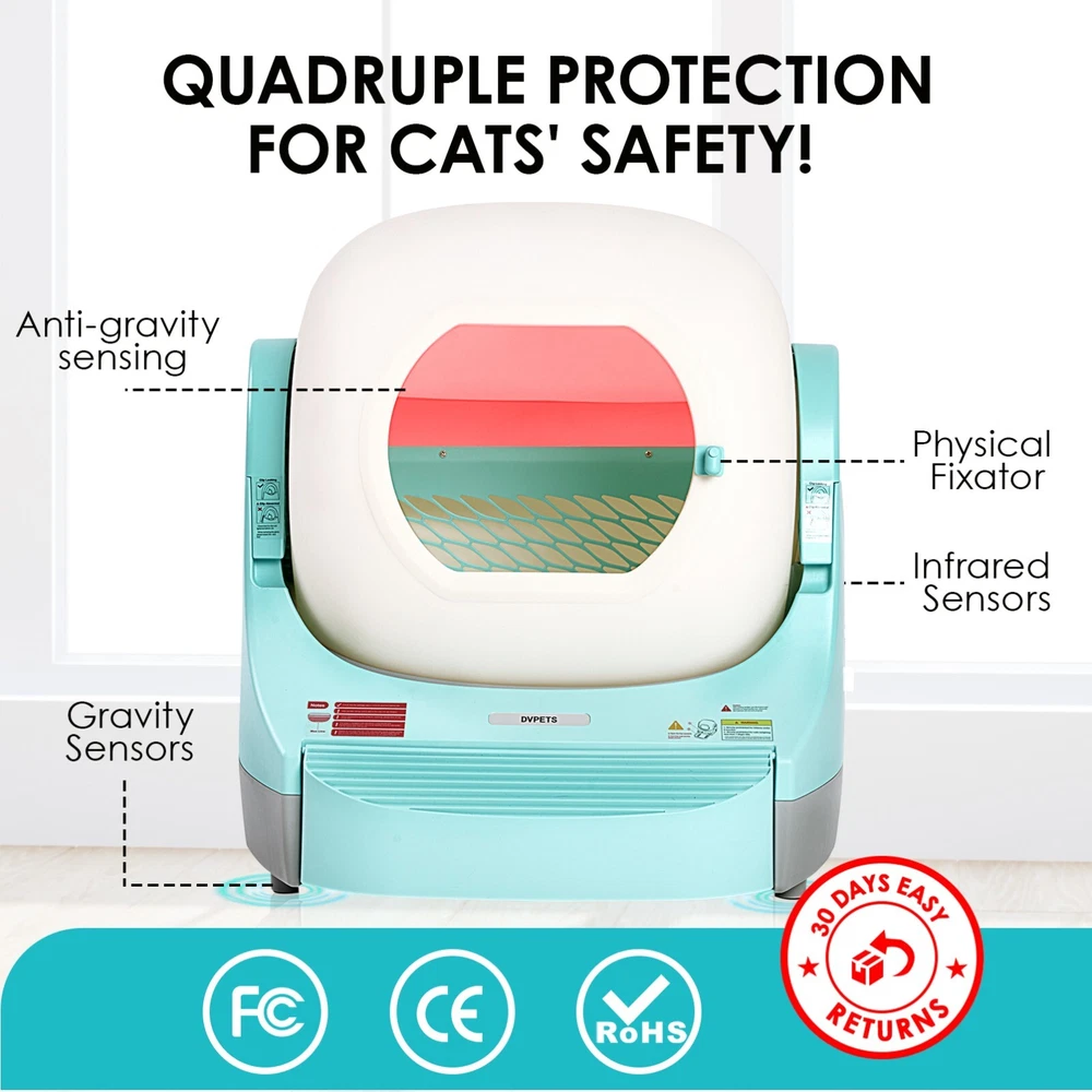 Highly Efficient Silo Expansion : We redesigned the internal structure of the silo, streamlining the internal components and reducing the footprint by 40%, thereby increasing the actual internal use capacity to 80 liters. This improvement not only enhances the appearance of the silo, but also significantly improves its ease of use. The design easily accommodates large cats up to 33 pounds, and Maine Coon mixes can easily walk in for a spin. Friendly for multi-cat households Safety Assurance : We prioritize animal safety with comprehensive 24-hour security and 360-degree coverage. Our system includes four layers of protection to prevent accidents. The entrance features an anti-gravity sensor and physical immobilizer for double protection. Infrared sensors at the rear stop the machine when touched by a cat, and weight sensors at the bottom detect the cat’s presence in real-time. These measures significantly enhance overall safety, providing peace of mind, especially when you're away. APP Remote Management : This self-developed cat litter robot app is designed entirely based on the actual experience of cat users, ensuring that all operations fit perfectly with the daily behavior of the pooper scooper. Whether you are a single-cat household or a multi-cat owner, it is easy to manage. The app notifies you instantly after each cleaning and also records each cat's weight for easy identification. On top of that, you can easily set up a daily cleaning program and adjust cleaning times. With just a few clicks, you can manage everything from your phone! Multiple Deodorizing Design : With innovative patented silicone seals and effective fecal compartments as well as changeable curtains to effectively curb unpleasant odors from the root cause, and the included air spray to keep your home always smelling fresh, this self-cleaning litter box not only makes your life easier, but also provides a more hygienic, odor-free environment for your cat. Structural Innovation :We are the only brand on the market that utilizes a unibody construction of the barrel silo. By using a design that costs twice as much as traditional silo construction, we have successfully prevented the problem of urine penetration to the bottom of the machine. This innovative design not only prevents damage and malfunction of the machine, but also completely solves the problem of urine penetration in high peeing cats. Reflects thoughtful consideration of the needs of pets and owners! Three Modes :Designed for practicality and efficiency, the Dvpets Smart Cat Litter Maker features intelligent cat usage sensing with three modes: manual, automatic, and do not disturb. Using advanced gear-driven motor technology, it quickly cleans clumped excreta by rotating and sifting. The spout design allows easy cleaning, while the silicone sealing ring and rubber edge control odors, providing a fresh, clean experience. With multiple cleaning modes, you only need to change the litter bag once a week, eliminating daily scooping and odor issues. Dvpets ensures a clean and healthy environment for you and your cat. Extre Capacity: The 9.5L large-capacity litter box is not only designed to be used as a regular litter box on its own, but is also equipped with a separate weigh-sensing technology, which is a disruptive innovation in the field of electronic litter boxes. This innovation has allowed the new generation of poop collection bins to show its strength in the litter robot market. The pooper scooper can track the details of each cat's every toilet visit in real time, accurate to each real-time excretion, providing a detailed data record for monitoring your cat's health. A+ Grade After-sales Guarantee : we provide professional after-sales service, including 30 days no-excuses return policy, overseas repair engineers covering the whole United States, and 7x24 hours phone and email customer service support. In addition, we offer a three-year warranty warranty. Regardless of any questions you may have, our customer service team is available online 24/7 to provide you with fast, friendly support, ensuring that your experience is always as exceptional as an A+ rated product. You can also give us suggestions about our products, and if we take them on board, we'll send you a freebie and a quick upgrade. On Oct 9, 2024 at 18:40:51 PDT, seller added the following information: