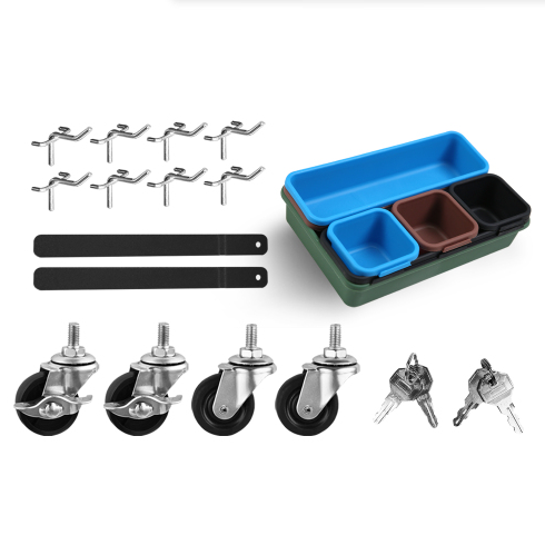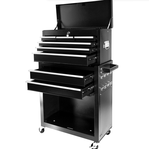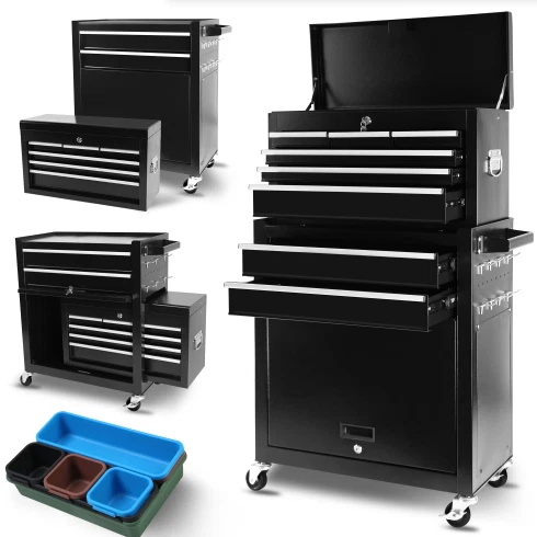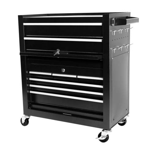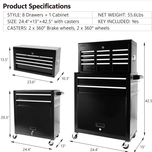 Specification Product Information Item Code:W1239137221 Product Type:General Item Product Name:8-Drawer Rolling Tool Chest with Wheels, Large Tool Cabinet with Drawers, Mobile Steel Tool Storage Organizer with Lock&Liner for Warehouse, Workshop, Black Main Color:Black Main Material:Steel Product Dimensions Assembled Length (in.):24.41 Assembled Width (in.):12.99 Assembled Height (in.):42.52 Weight (lbs.):55.56 Package Size Length (in.):27.56 Width (in.):16.34 Height (in.):29.33 Weight (lbs.):61.29 Product Features HIGH CAPACITY. Rolling tool box is equipped with 8 sliding drawers: 2 large, 3 medium & 3 small, 1 top layer, and 1 bottom cabinet, to store tools of different sizes and meet your needs. Each drawer is designed with a liner. Tool chests & cabinets has 8 hooks beside of cabinet, hanging tools. We also provide you with 7 storage boxes. EASY TO MOVE & STORE. Top box with 2 handles, easy to take and lift, and bottom tool cabinet with hand bars, which help you to move forward. Craftsman tool chest can be easily moved and stored because there are 4 universal casters, 2 of them is braked. ADVANCED DESIGN - Each drawer is equipped with smooth slide rail that is easy to open and close. The top and the bottom tool box can be locked by keys which makes the tools inside safe. EASY TO TIDY. Our heavy-duty tool chest is rustproof, scratch-resistant, and easy to clean. The padding inside drawers provides excellent cushioning and heat insulation, protecting your tools from damage. DURABLE. Tool chest is made of premium steel with powder coating, stable construction, avoids from scratching, denting, and chipping, more durable; classic color. The tool chest with drawers is detachable, can be divided into top tool box and bottom tool cart, with an independent locking system. Description