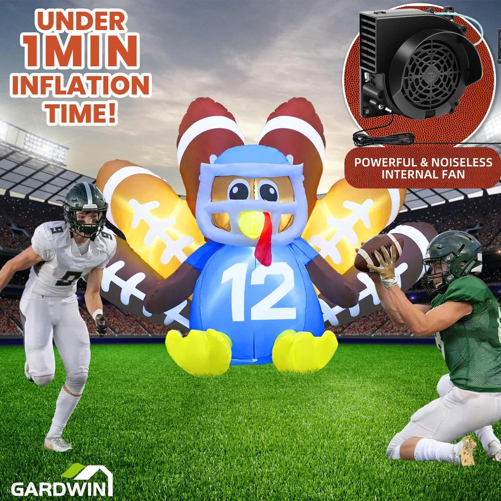 【Perfect Inflatable Turkey for Thanksgiving】 Our 6FT Football Turkey Inflatable with LED lights creates a warm, festive atmosphere at night. This Turkey No.12 decoration is sure to make your yard the highlight of Thanksgiving. 【Fast Inflation & Energy-Efficient】 Made from premium waterproof polyester, this inflatable turkey outdoor Thanksgiving decoration is built to last. The quiet, powerful fan keeps your blow-up turkey inflated with minimal energy use. 【Easy Setup & Storage】 Setting up is simple with the included UL adapter, stakes, tethers, and storage bag. The blow-up turkey comes with an extension cord for flexible placement. After the holiday, deflate, fold, and store it easily. 【Versatile Decor】 Perfect for your yard, garden, patio, lawn, or doorway, this football turkey inflatable adds festive charm to any space. It’s a great way to catch attention and bring holiday cheer. 【Exceptional Customer Support】 We’re committed to providing top-notch customer service. Our dedicated service team is here to ensure you have a smooth and enjoyable experience with your Thanksgiving inflatable outdoor decoration.
