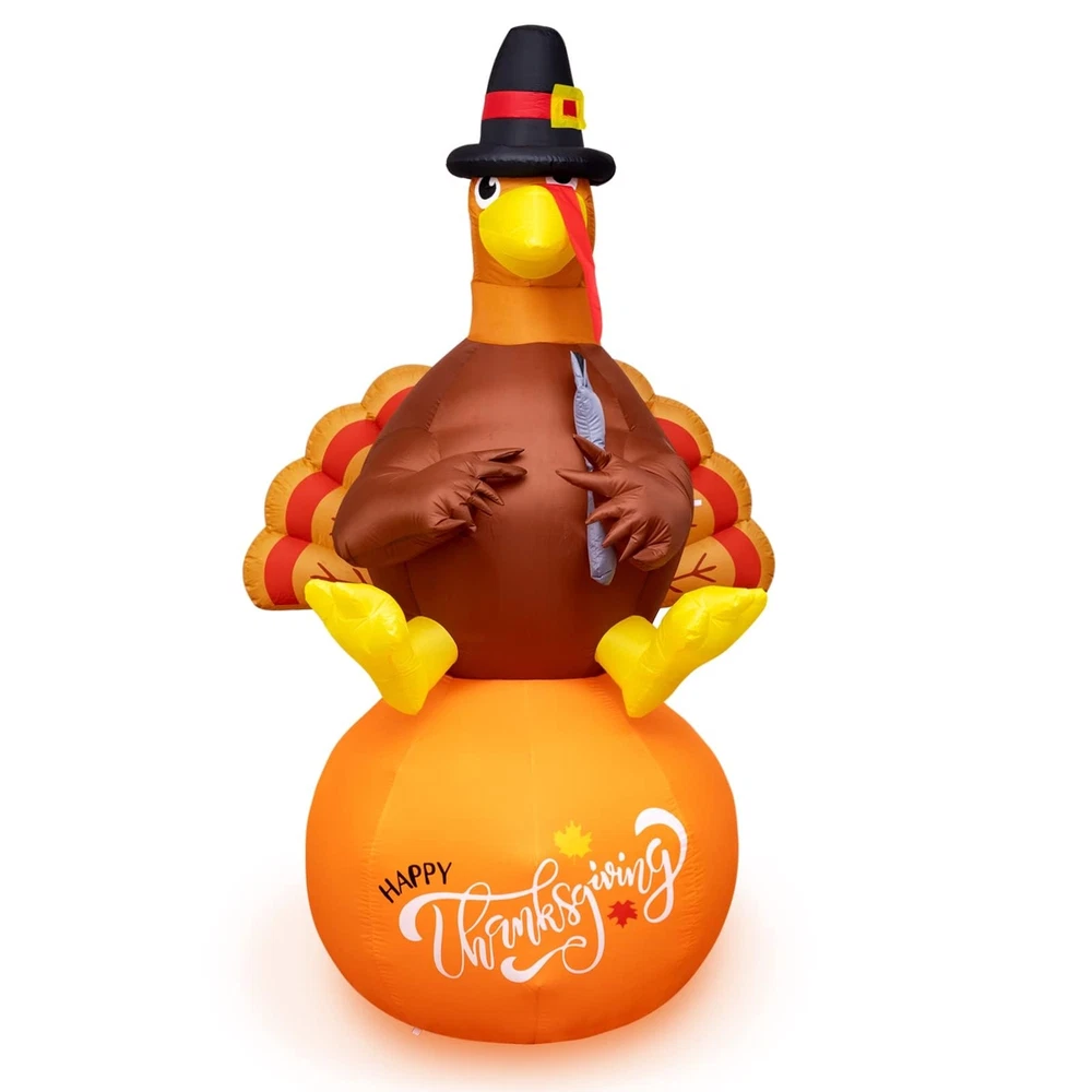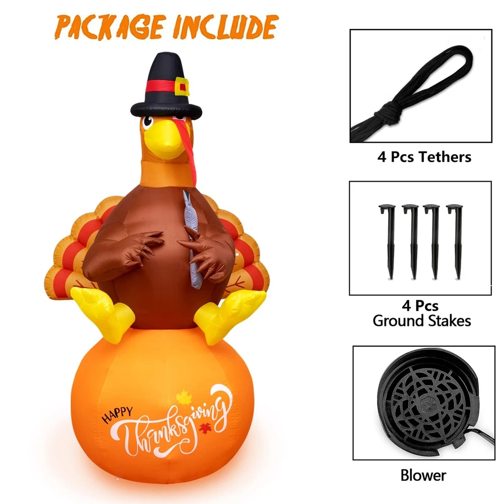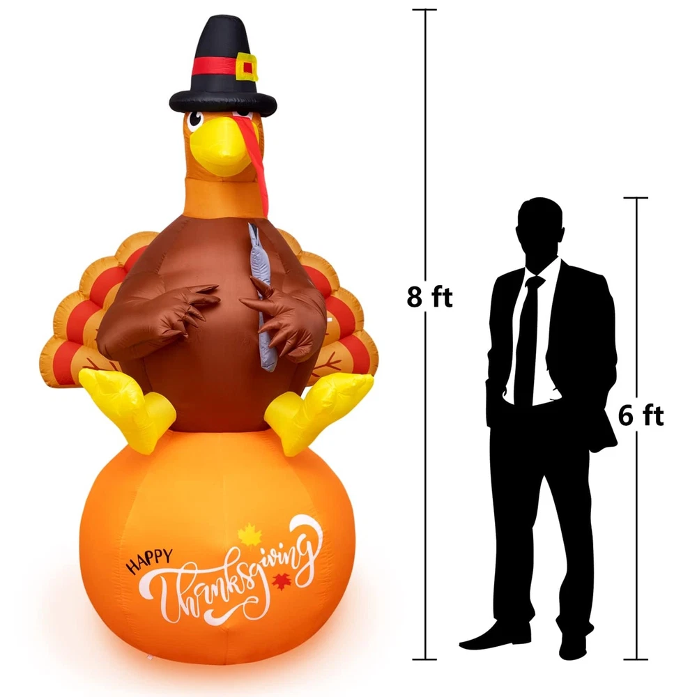 Thanksgiving Inflatable Decorations 8Ft Inflatable Turkey Blow Up Turkey Built-in LED Lights Wanna add some fun to your yard for the upcoming Thanksgiving? This inflatable turkey is an ideal choice. Your and neighbor would love it! When you place this fall Thanksgiving decoration outdoors and indoors, home, yard, garden, lawn, patio, porch, party, stage, restaurants, cafes, playgrounds, etc. the large full bodied turkey will be a big hit at your thanksgiving. Specification: Material: Polyester Inflated height: 8 feet Power: Plug in Package including: 1 x inflatable turkey, 1 x adapter,2 x Clips,4 x ground stakes and 4 tethers. Caution: 1. Protect the blower and power cord from water. 2. Do not inflate during storms or strong winds. 3. Please make sure the air blower is facing up when inflating. The air blower facing the ground will affect the effect of inflating. Supersized Decor: The Thanksgiving Decorations adorable inflatable turkey stands 8 Ft tall. It will be the cute centerpiece of your Thanksgiving decoration. Easy Setup and Storage: This Thanksgivings inflatable decoration comes with a powerful built-in blower. Just plug it in and the large turkey will be self-inflating and in 90 seconds standing up to its full height. For storage simply let the air out and fold it. Excellent quality: The Thanksgiving outdoor decoration is made of thickened waterproof polyester fabric. Soft, light and firm, wear-resistant. Please make sure the air blower is facing up when inflating. The air blower facing the ground will affect the effect of inflating,Features low noise, our product only makes a little noise when operating in the room; If put in the outdoor, the noise can be neglected. Reinforced Tie-Downs: 4 Ground stakes and 4 tethers are provided for tie-down. Built-in fixed sandbag, an opening at the bottom with a zipper provides space for adding some heavy objects to make it more secure and stable. No need to worry that our Thanksgiving yard inflatables will fly away with the wind. Wide Application: When you place this fall Thanksgiving decoration outdoors and indoors, home, yard, garden, lawn, patio, porch, party, stage, restaurants, cafes, playgrounds, etc. the large full bodied turkey will be a big hit at your thanksgiving.