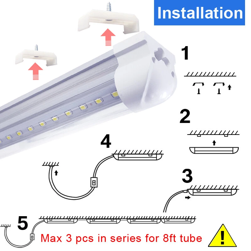 FAST DELIVERY - Ship from New Jersey or Los Angeles Warehouse via FedEx , 3-7 Days Delivered Your Door . SCIENTIFIC DESIGN - 8Ft LED Shop Lights Fixture is Made of 6500K Cold White SMD2835 LED Chip ,Plastic Clear Cover , Aluminum Bracket Housing ,and AC85-277V Constant Current Driver . It can work in -68F to 120F Temperature Conditions EASY INSTALLATION - The Integrated Tube Fixture Can be Install on Wall or Ceiling ,Easily Replace Traditional Fluorescent Tube Bulb . Plug and Play , Free Accessories (Power Cords, Connector , Extension Cords , Clip and Screw ) Come with Tube Lights Together WIDE APPLICATION - Linkable 8Ft Bulbs Widely Used in Garage Ceiling , Barbershop , Schools, Hospitals Basement , Factory Warehouses , Supermarkets Cooler Door , Offices, Shops,Hotels, etc 8Ft LED SHOP LIGHT V-SHAPE 144W 6500K LED Tube Light Linkable Ceiling 12Pc FAST DELIVERY - Ship from New Jersey or Los Angeles Warehouse via FedEx , 3-7 Days Delivered Your Door . SCIENTIFIC DESIGN - 8Ft LED Shop Lights Fixture is Made of 6500K Cold White SMD2835 LED Chip ,Plastic Clear Cover , Aluminum Bracket Housing ,and AC85-277V Constant Current Driver . It can work in -68F to 120F Temperature Conditions EASY INSTALLATION - The Integrated Tube Fixture Can be Install on Wall or Ceiling ,Easily Replace Traditional Fluorescent Tube Bulb . Plug and Play , Free Accessories (Power Cords, Connector , Extension Cords , Clip and Screw ) Come with Tube Lights Together WIDE APPLICATION - Linkable 8Ft Bulbs Widely Used in Garage Ceiling , Barbershop , Schools, Hospitals Basement , Factory Warehouses , Supermarkets Cooler Door , Offices, Shops,Hotels, etc