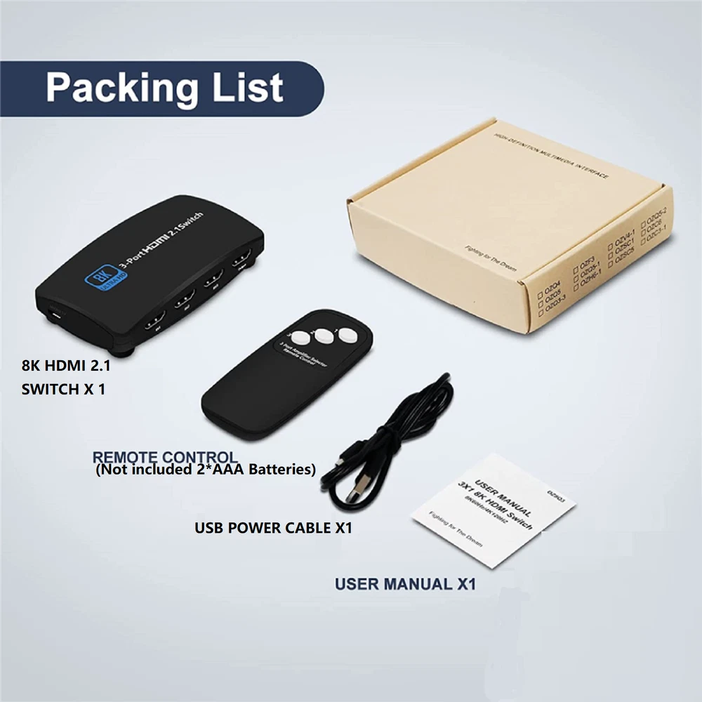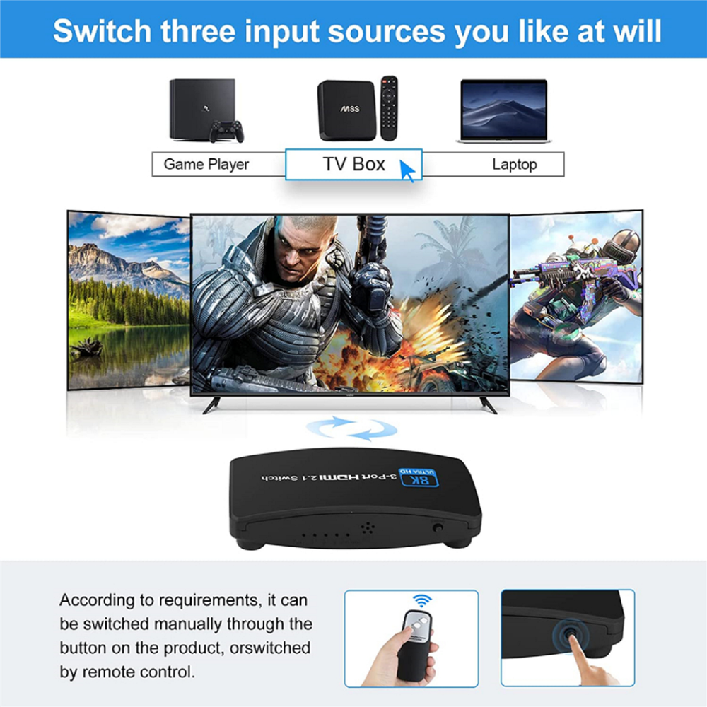 SAFE & SECURE SHOPPING 100% SATISFACTION GUARANTEED FAST SHIPPING Store Categories Store Categories You may also like You may also like Silicone DIY Resin Mold Desk Storage Organizer Making Epoxy Casting Mould Tool 8.99 USD 200pcs 0.5&0.6mm Waterproof Watch O-Ring Rubber Gasket Assortment For Watchmaker 12.99 USD 65W For Lenovo Square Charger To USB C Type C Power Adapter Converter 90 Degree 6.39 USD 3.49 USD Metal Steering Gear Micro Servo JR Plug For 1/24 Axial SCX-24 RC Crawler Car 13.69 USD New Washer Water Valve Replacement Part for Whirlpool Machine W11036928 14.89 USD New 2pcs WR55X26671 Refrigerator LED Light Board for GE Machine Bulb Replacement 13.38 USD 8K 3-Port HDMI 2.1 Switch Adapter Splitter 144Hz 3 in 1 out For Xbox PS5 Product Description 8K HDMI 2.1 Switch Splitter 3X1 8K@60Hz 4K@120Hz 2K@144Hz 3 in 1 out Switcher Specifications: HDMI Input/Output: The length of hdmi input / hdmi output is less than 1.5 meter for 8K@60Hz/4K@120Hz;The length of hdmi input / hdmi output is less than 5 meter for 4K@60Hz Quick Frame Transport (QFT) supported High refresh rate: 8K@60Hz, 4K@120/60HZ, 2K@144HZ, 1080P@60HZ HDMI 2.1 specification: HDCP 2.3, Dynamic HDR, Depth Color Transmission rate: 48GBPS Video color format: 24/30/36 bit Video & audio: Supported Power Supply: DC5v 1A Features: 1. New 8K Switcher HDMI-Compatible 2.1 Switch Splitter 3 in1 Out Ultra HD 8K@60Hz 4K@120Hz High Speed 48Gbps Switch Adapter with Switch Button for Computer Laptop 2 Sources to 1 Display. 2. HDMI 2.1 HDMI SWITCH 3 IN 1 OUT : 3 HDMI ports in and 1 HDMI out for various HDMI devices, HDMI switcher 3 ports can work with most devices with standard HDMI interface. 3. Input: PC, Laptops, FOR Xbox 360, FOR PS3/PS4/PS5, Roku Express, FOR Amazon Fire TV Stick, Blu-ray DVD, etc; Output: Full HD TVs, projectors, monitors and more. 4. 8K ULTRA HD RESOLUTION: 3 Ports HDMI Hub support HDMI Output video Up to 8K@60Hz, 4K@120Hz, 1080P@240Hz, 4K/60/24Hz, 2K/60/30/24Hz, 3D, 1080P, 1080i, 720P, 720i, 576P, 576i, 480P; Transmission rate of up to 48Gbps and is backward compatible with all previous HDMI standards. 5. EASY TO HOOK UP: This Powered HDMI Switch supports key-press-switching and remote control function, use the remote control to liberate your hands. LED indicators tell you which port is active. It can be powered to make your signal transmission more stable. Plug & Play. It is ideal for trade show, conference room, bedding room, living room, kitchen room and backyard. 6. STABLE TRANSMISSION: 8K@60Hz HDMI 2.1 switch uses the latest chips, made of Aluminum alloy material, anti-corrosion construction can also resist overheat or break, more durable & useful. HDMI Switch supports most devices with a standard HDMI interface. 7. HDMI-compatible Switch: HDMI 2.1 and HDCP 2.3,48Gbps transmission speed,This HDMI-compatible switcher allow you to connect three HDMI-compatible source to one HDMI-compatible display 8. All modes Support up to 8K 60 Hz YCbCr 4:2:0 10bit, 8K 30 Hz RGB/YCbCr 4:4:4 10bit, or 4K 120 Hz RGB/YCbCr 4:4:4 10bit Warm Tips: 1. While connecting to Source or Display, highly recommend using a power supply with a Micro USB cable from a 5V USB power adapter for best performance. 2. For 8K resolution, the length of the HDMI cables connected to both ends of the switch should not exceed 3 meters respectively. 3. If you need to output 8K@60Hz and 4K@120Hz, we recommend to use a High-quality HDMI 2.1 standard cable, share the most luxurious video & audio! Package Includes: 1X 3-Port HDMI 2.1 Switch 1X IR Remote Control(Not included 2* AAA battery) 1X USB Power Cable(Not included a DC5V power adapter) 1X User Manual Note: If you need to use Navceker switcher to output 4K@120Hz and 8K@60Hz, please make sure that your HDMI-compatible cable, HDMI-compatible signal source and HDMI-compatible display all support the above resolution. Shipping Returns Contact Us Payment Shipping 1. Items sent from US warehouse. 2.Receiving time = Processing time + Shipping time 3. Processing Time: Around 1-2 business Days 4. Shipping Time: 3-5 business day it may have a little delay during some holiday (such as Christmas),any problem ,please feel free to contact Returns 1. 30 days warranty from the purchased date. Please contact us via email before returning the defective item. 2.Our warranty does not extended to any product that are physically damaged or that are not under normal operating conditions as result of misuse or improper installation on the buyer/user's part. 3.Return items should include the original packaging and all accessories. buyers MUST contact us for the returning address. 4.In all cases, buyers pay shipping fees at their own cost to return products for exchange or refund. We will be responsible for the postage of replacements. Refund will be made upon receipt of the returned item. Contact Us Pls contact us if you have any problems,we will try our best to solve for you Payment We accept all verified payment from eBay. Copyright © 2022 Tongtool