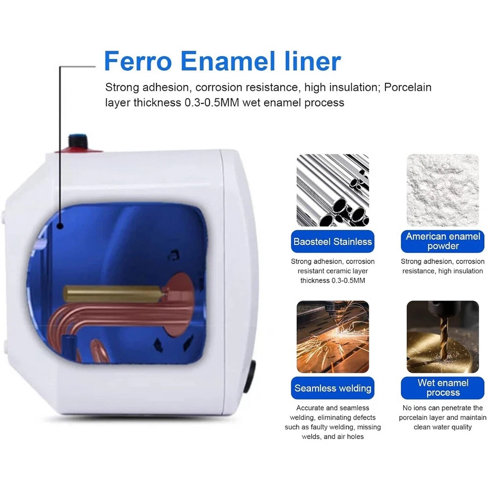 Feature 1:Easy installation,Convenient Use,Easy OperationGross Weight:4.1kg/9lbsTank Lining Material:/Power:1500WApplicable Water Pressure:0.05-0.6MPANet Weight:3.35kg/7.38lbsAssembly Required:YesCapacity:8L/2.11galVoltage:110VMaterial:Plastic, Stainless Steel, 316L Stainless SteelCountry/Region of Manufacture:ChinaPower Source:Corded ElectricWaterproof Grade:IPX4Brand:UnbrandedBTU/h Heating Rating:Does Not AppyAmperage:Does Not ApplyMounting Location:Under SinkFeatures:1500W power and fast thermal conductivity heating pipeHeating Time:8-15 minutesEnergy Star:AShape:RectangleJacket Diameter:Does Not ApplyColor:WhiteHeating System:Storage TankPackage Size:38*34.5*34cm/14.9*13.58*13.38inWater Onlet Mode:Upper Water OnletPlug:US StandardManufacturer Warranty:4 YearsMPN:Does not applyFirst Hour Recovery:Does Not ApplyType:Condensing Tankless Water HeaterWater Temperature Range:/Item Width:Does Not ApplyWater Connection:Does Not ApplyExhaust Pipe Length:59cm/23.22inProduct Size:30*28*28cm/11.81*11*11inItem Height:Does Not ApplyPower Cord Length:81cm/31.88inTemperature Adjustment Range:30-65 ℃/86-149 ° F