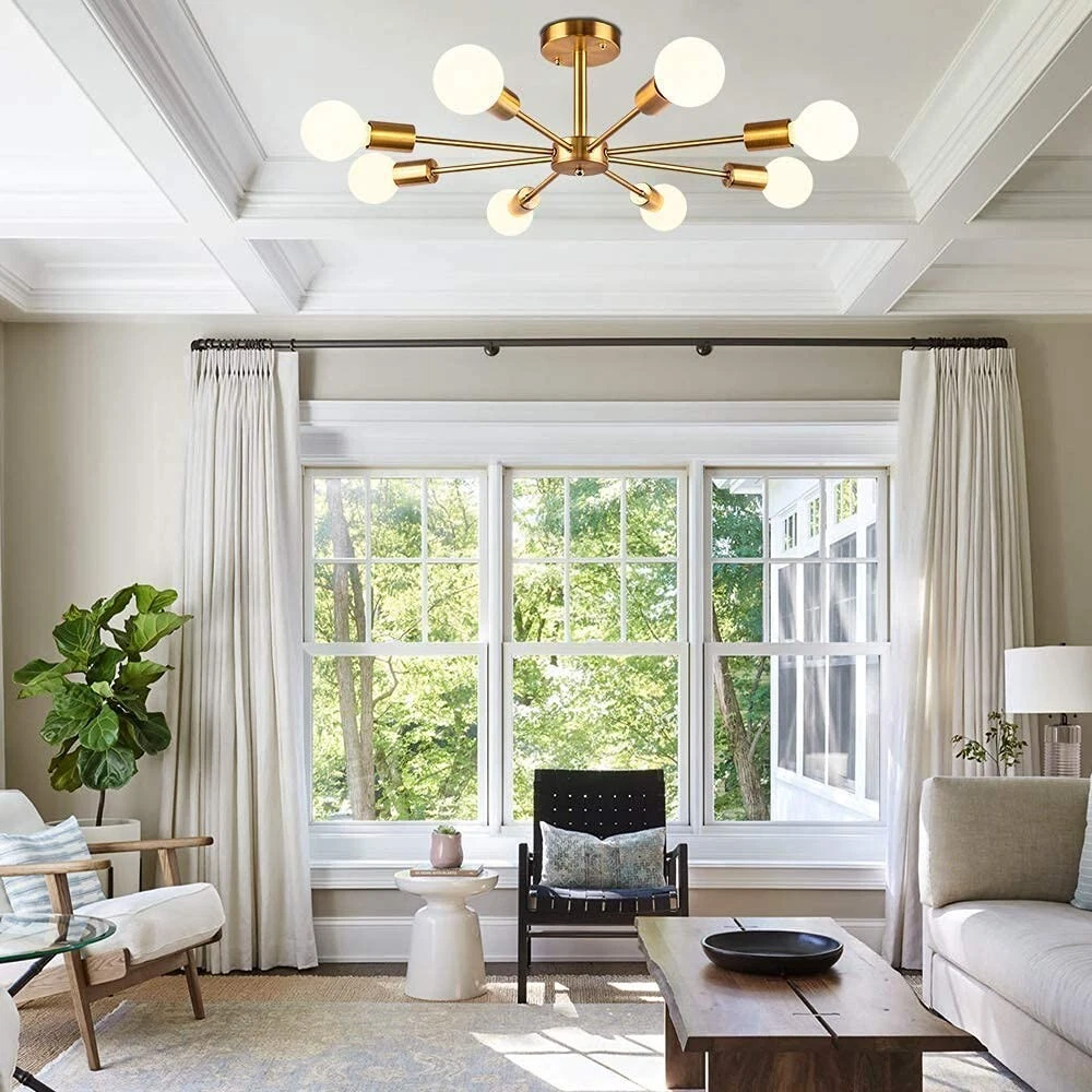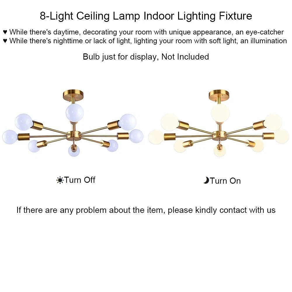 Elevate your home with the stunning 8-Light Brass Sputnik Chandelier. This modern ceiling light fixture features a bold brass finish and a unique Sputnik design, creating a striking focal point in any room. Ideal for contemporary living rooms, dining areas, kitchens, or hallways, this chandelier offers a perfect combination of style and functionality. The 8 lights provide ample illumination, making it ideal for brightening up your space while adding a touch of sophistication and mid-century charm to your decor. Key Features: 8-light brass Sputnik chandelier with modern, mid-century design Elegant brass finish for a sleek, contemporary look Perfect for living rooms, dining rooms, kitchens, or hallways Ample lighting with 8 bulbs (bulbs not included) Durable and high-quality metal construction TERMS OF SALE 100% Customer satisfaction is our principal and prime goal. If you are not satisfied with your purchase then simply return it within 30 days of receipt, we will refund the purchase amount upon receiving the item within 30 days, any defective item not due to misused will entitled to 1 to 1 exchange. Buyers should be responsible for the shipping cost from their locations to India. We will be responsible for the shipping cost from India to buyers' locations FEEDBACK Your feedback is important for us. Please contact us if you have any problem with this product, we will solve that problem because we will always be happy to help you.