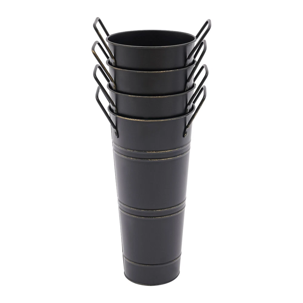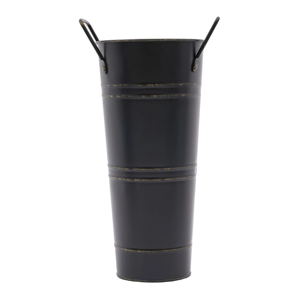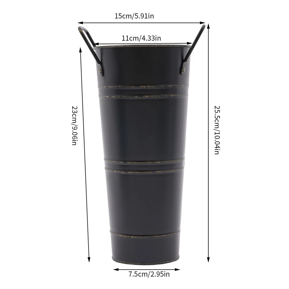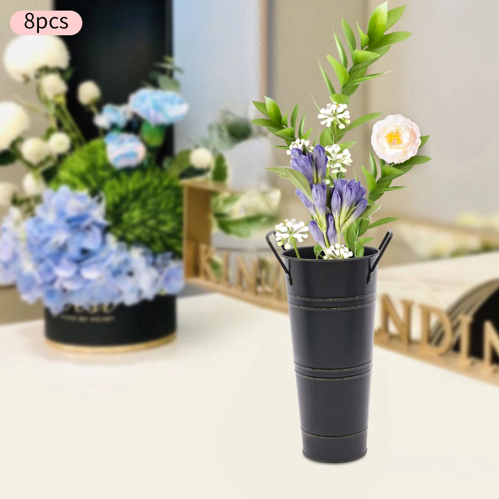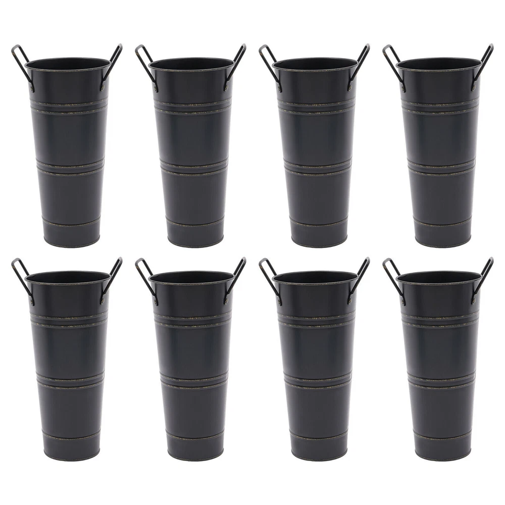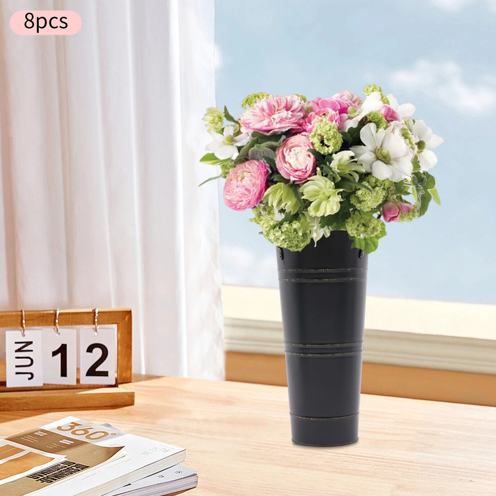 8PCS Galvanized Metal Vases Flower Bucket Vases, Black Flower Vases for Bouquet Description Our metal bucket vase, with its simple cylindrical shape, can harmoniously match various flowers, from fresh wildflowers to noble and elegant roses to display different decorative styles; It can also create a picturesque scene even without flowers, showcasing a unique attitude towards life. Whether as the finishing touch of home decoration or as a gift for family and friends, it is an ideal choice, making every aspect of life full of harmonious coexistence between art and nature. Key Features Strong and Durable : The product is made of thickened iron(0.23mm) with a galvanized finish to prevent rust, deform, and break, together with the waterproof coated interior, providing excellent durability and long service life. Practical Function : The 9.06-inch depth and 4.33-inch opening diameter are not picky about the flower material, whether it is a single large branch bouquet or a complex combination of small flowers, this vase can show their beauty and flexibility to adapt to a variety of decorative needs. Elegant Decoration : The classic retro appearance of the galvanized flower vase can match any home decoration and add an elegantly pristine ambiance to your home. Paired with real, artificial flowers, or plants, it greatly elevates the look of your living space. A pack of 8 : 8 vases can meet your different space placement needs, thus making the whole space layout more reasonable. DIY Fun : With these vases, you can invite your friends and family to join the DIY project and exercise your hand ability, stimulate your imagination and creativity, and have fun in it. Installation-Free : You can use this product directly after receiving it without additional installation, which saves you time and energy. Effortless Clean : A simple structure and smooth surface make this product easy to clean. You only have to wipe it with a damp cloth. Excellent Gift : You can give this practical product to your family, friends, and flower and plant lovers on various occasions such as anniversaries, holidays, Christmas, Thanksgiving, New Year's, and weddings, and share the beauty of nature with your loved ones. Good Customer Service : We stand behind all our guests and look forward to assisting you with your purchase. It is our pleasure to answer your confusion and questions. The end of the story between us is not "we sell and you buy". Details Practical Handles : The ergonomic handles are designed to make it convenient for you to move the product. Smooth Edges : They not only enhance the aesthetics and textures of the product but also improve safety during cleaning and use. Application These vases are ideal for flower arrangements, fresh/dried flowers, or plants. They are suitable for the bedroom, dining table, living room, kitchen, balcony, garden, party, ceremony, wedding, anniversary, hotel, flower shop, and other spaces. Specifications Color: Black Style: Modern Shape: Cylindrical Material: Iron Surface Treatment: Galvanized Assembly Required: No Mount Type: Floor Standing Number of Items: 8 Thickness: 0.23mm/0.009in Top Width(Handle Included): About 15cm/5.9in Top Opening Diameter: About 11cm/4.33in Product Overall Height: About 25.5cm/10.04in Vase Height(Handle Excluded): About 23cm/9.06in Bottom Diameter: About 7.5cm/2.95in Gross Weight: 1.63kg/3.59lbs Net Weight: 1.55kg/3.42lbs Package Size: 43.5*14*11.5cm/17.13*5.51*4.53in Package Included 8*Flower Bucket Vases Notes Please note that flowers are not included in this product. Due to manual aging surface treatment, there may be slight differences in color depth, which is a normal phenomenon. Rust spots are also specially designed. Please make sure you can accept this aging style before purchasing! Iron products may sometimes show signs of collision, paint peeling, etc. during transportation, but it does not affect the overall appearance. The iron sheet series flower vases cannot guarantee absolute waterproofing, and soaking in water for a long time will gradually rust. If you need hydroponic plants, you can put them in your own plastic bag or add a plastic inner pot! Please allow the slight color difference caused by the shooting light and the 1-3 cm error due to manual measurement, and make sure you do not mind before ordering. Payment Delivery details Terms of sales About us Contact us Payment We accept ebay payment 。 Fees such as import duties, taxes are not included in the item price or shipping costs. These charges are the buyer's responsibility. Delivery details Shipping: 2-9 working days to: USA Terms of sales We maintain high standards of excellence and strive for hundred percent customer satisfaction. Feedback is very important to us. We hope that you contact us immediately before you give neutral or negative feedback, so that we can address your concerns. It is impossible to address issues if we do not know about them! About us Your satis faction is our ultimate goal. We work hard to earn your trust and future business. Our certified technicians have tested each item before shipping. The unit comes with 1 year limited warranty on all manufacturing defects. a) If you receive a defective item, you may return it or ask for a discount. Please contact us within 14 days after you receive the package. b) What you returned must be intact and in its original packaging as re? u. Customer is responsible for shipping costs of the returned item. c) We will cover the cost of shipping back t with the shipping rate indicated in the registration page. We will send you a new unit or refund the full payment you paid. Thank you. Contact us Business Hour Business Hour: Monday To Friday: 8:30 AM to 5:00 PM (Beijing China time) Due to time zones, our reply to your questions may not be immediately. But within above working time, we will reply your email within 24 hours. If it's non-workdays, please kindly be patient and wait till Monday. Please contact us with ebay message. P