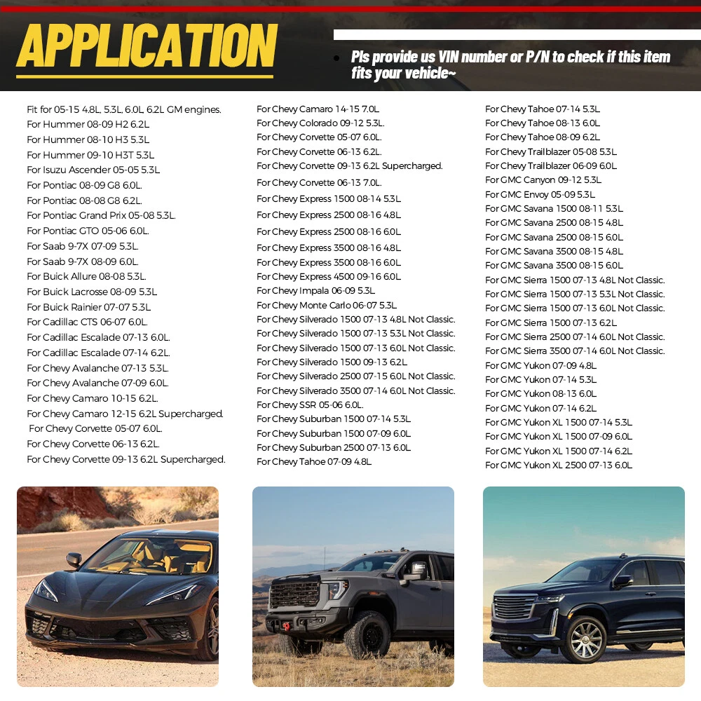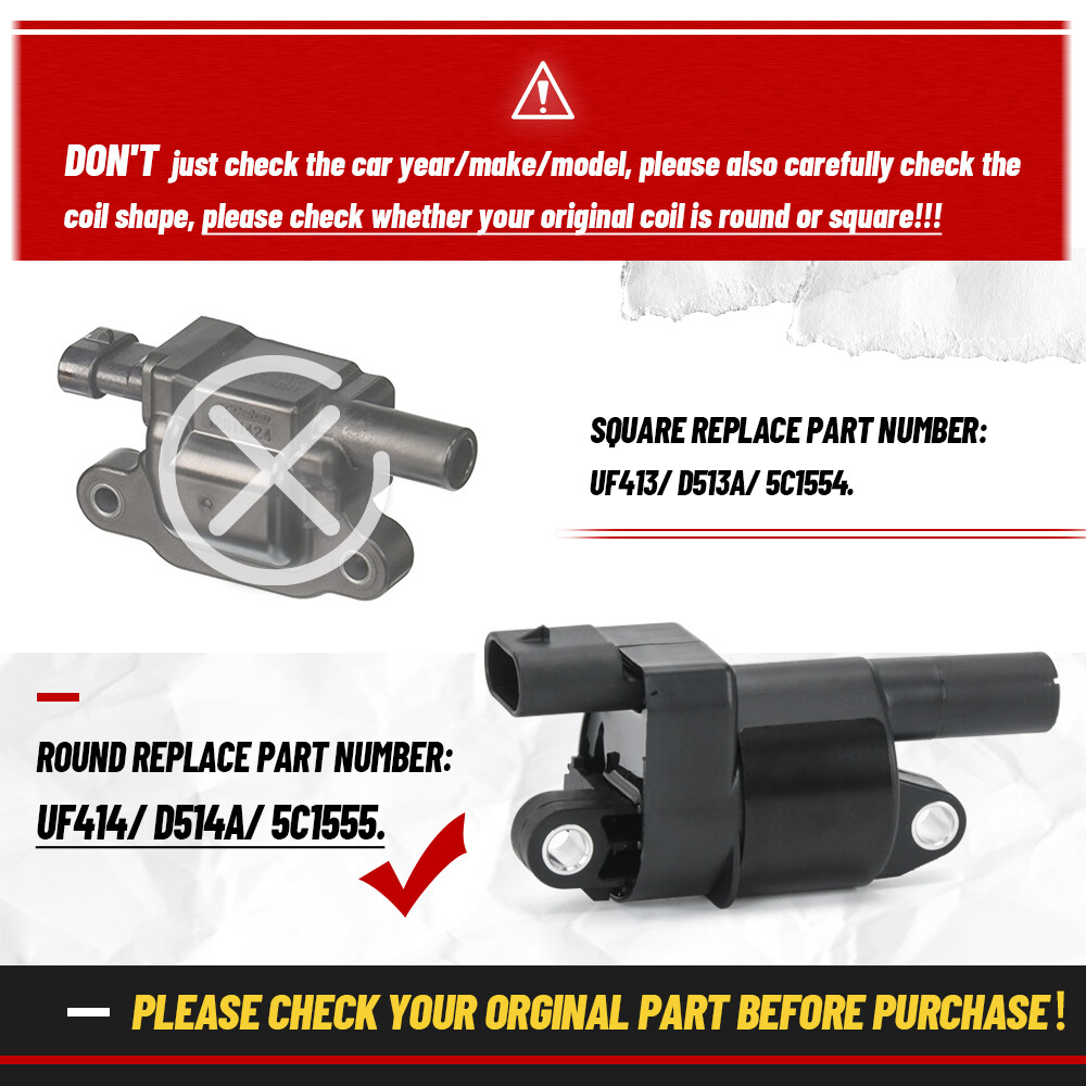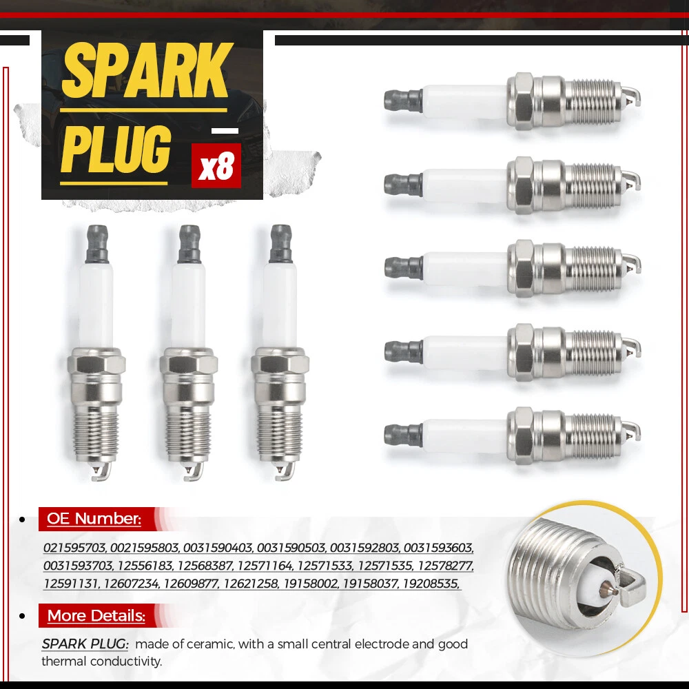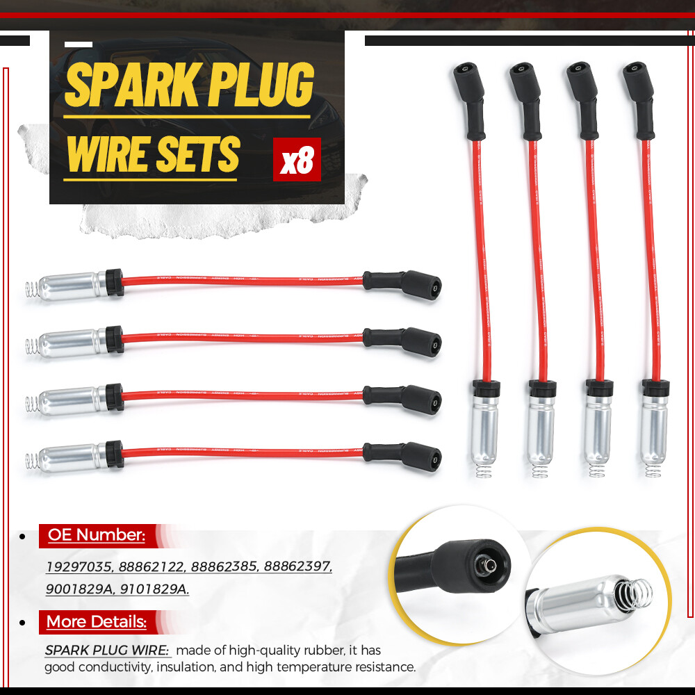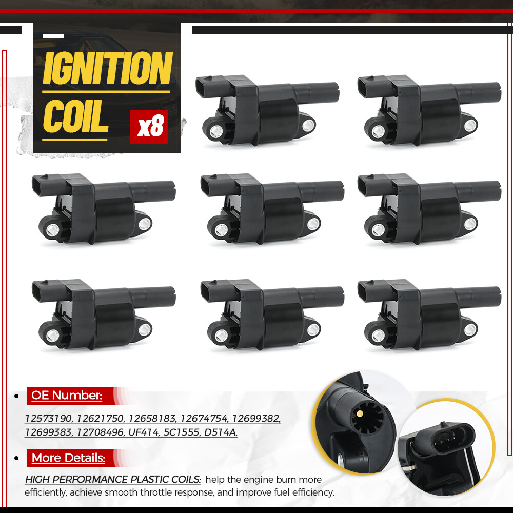 8Pack Ignition Coil+Spark Plug+Wire Set For Chevy Silverado 1500 GMC Cadillac Overview Condition: 100% Brand New Color: As the picture Material: Made of high-quality Ceramics, Plastic and Metal. Features: 1 00% quality assurance tested, more responsive, less expensive, easier to install. Designed to replace damaged or worn-out original equipment, it can perfectly replace OE products. The expected replacement time is 30 minutes. High performance coils help the engine burn more efficiently, achieve smooth throttle response, and maximize fuel efficiency. Spark plugs have a small central electrode that has good thermal conductivity, which helps to reduce the voltage required to generate sparks and increase engine power. Spark plug wires have excellent conductivity, better insulation and high temperature resistance, promoting ignition smoothly. Fitments Fit for 05-15 4.8L, 5.3L, 6.0L, 6.2L GM engines. Fit for various GM engines and Hummer, Isuzu, Pontiac, Saab, Buick, Cadillac, Chevy, GMC vehicles. Ignition Coil OE Number: 12573190, 12621750, 12658183, 12674754, 12699382, 12699383, 12708496, UF414, 5C1555, D514A. Spark Plug OE Number: 021595703, 0021595803, 0031590403, 0031590503, 0031592803, 0031593603, 0031593703, 12556183, 12568387, 12571164, 12571533, 12571535, 12578277, 12591131, 12607234, 12609877, 12621258, 19158002, 19158037, 19208535, 19238463, 19244473, 19256067, 19299585, 19300384, 19300749, 19300875, 19301320, 19301655, 19301807, 19301808, 19301810, 19301812, 19301813, 19302723, 19302725, 19302728, 19302729, 19308033, 1F2218110, 1F2218110A, 25161442, 25161444, 25161677, 25161678, 25162555, 25162556, 25163148, 25164048, 25165715, 25166821, 25173406, 25178637, 25312442, 25315018, 25320206, 25332827, 25332828, 25333938, 3L1Z12405AA, 5613611, 5613906, 5614155, 5614158, 5614212, 5614224, 5614227, 5614230, 5614235, 5614236, 5614238, 5614244, 5614253, 5614281, 5614283, 5614284, 5614289, 5614303, 5614355, 8125711640, 8126212580, 8191580380, 8191795710, 8192560670, 8251616770, 8251625560, 8251657150, 88892834, AGSF22F1, AGSF22F1M Spark Plug Wire Number: 19297035, 88862122, 88862385, 88862397, 9001829A, 9101829A Note : Don't just check the car year/make/model, please also carefully check the coil shape, please check whether your original coil is round or square!!! There are 2 different types of coils the Square coil(UF413)or the Round coil (UF414). Square Replace Part Number: UF413/ D513A/ 5C1554. Round Replace Part Number: UF414/ D514A/ 5C1555. Items Included 8x Ignition coil. 8x Spark Plug. 8x Spark Plug Wire. As pictures shown Installation Instructions: Pull out the connector on the ignition coil. Disconnect the ignition coil and spark plug wires. Use a ratchet to loosen the fixing bolt on the coil and remove the old ignition coil. Install a new ignition coil and reconnect the hardware that was just removed. How to replace spark plug and wire? Remove the old spark plug wire from the spark plug. Use a ratchet to rotate counterclockwise and remove the old spark plug. Reinstall the new spark plug and connect the new spark plug wire. When to change ignition coils/spark plugs/wires? The check engine light turns on. poor fuel economy. Car runs rough when idle Engine misfires (You may feel that your car is chugging when going up a hill or accelerating). Note Provide a tracking number with every order, please buy with confidence! Please allow differences due to manual measurement. No installation guides are included, we highly recommend seeking professional installation. The color of the actual items may be slightly different from the listing images due to different computer screens. For any inquiries, please write to us. 💯After-Sales Shipping🚚 💰Payment Q & A💬 Contact Us📧 💯After-Sales For any installation or usage issues, please send us photos or videos for assistance. If you are unsatisfied, please contact us before leaving feedback. We are committed to resolving any issues and ensuring customer satisfaction. We offer free returns and exchanges within 30 days of purchase. If you need to return an item, please select "didn't like them" as the reason to ensure prompt processing. Thank you! Shipping🚚 We ship your order within 2 business days of receiving full payment. Delivery typically takes 3-7 business days to most cities. Domestic orders are shipped via USPS, UPS, or FedEx from our US warehouse and usually arrive within 3-5 business days. We ship to the address on your eBay account, not your PayPal account. Please update your eBay shipping address during checkout if it's different. We provide a tracking number for online shipment status updates. 💰Payment PayPal is the preferred payment method. Orders will be shipped after payment clears. Payment is expected within 7 days; otherwise, an Unpaid Item Dispute will be filed with eBay. Q & A💬 Q: When will the item be shipped out? A: This item will be shipped within 2 business days once payment is completed. Q: Where is my tracking number? A: Please log in to your account, click "my eBay"-->"my summary", or open your email box and find the shipping notification email. Q: How do I return an item? A: Our store accepts returns. Items must be returned within 60 days. Refunds will be given as money back. Please contact our customer service before you return an item. Contact Us📧 If you have any questions, please contact our Customer Service Team by clicking "Contact seller" in "Seller information". Emails will reply within 1 business day during business hours.