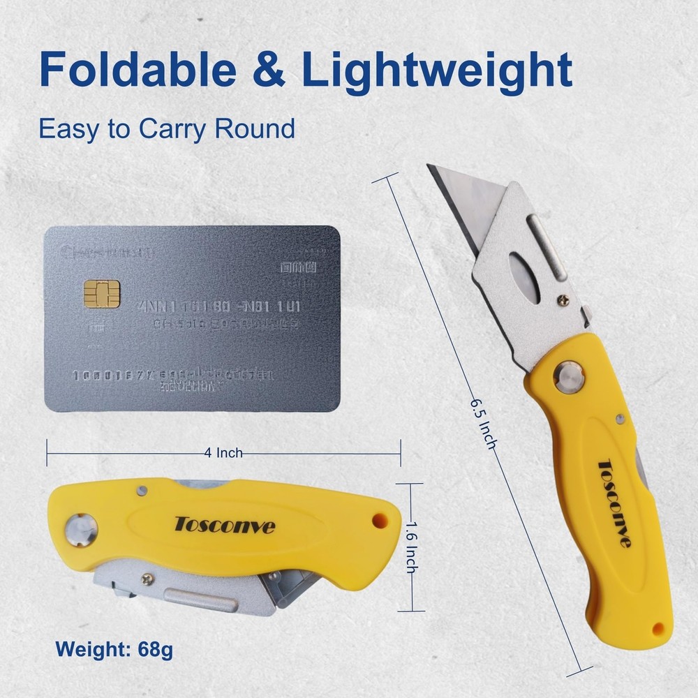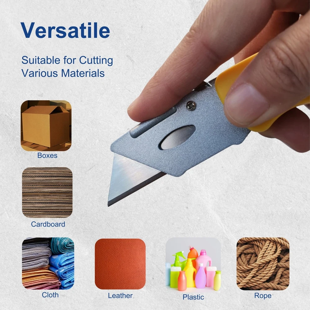 The mini box cutter is compact and foldable, measuring only 4.0 inches * 1.6 inches when folded, making it easy to carry around.When you need to go out, the small box cutter is definitely a good choice, you can put it in your pocket.This is also a good razor knife utility. It comes with 8 pack of box cutters retractable heavy duty (red/yellow/black/blue) and extra 30 replaceable blades, which are enough for a long time. Blades are made of steel for high hardness and sharpness.The blades are very sharp and ensure smooth cutting of different materials. Press the silver button on the Aluminum alloy shell to replace blades for the retractable box cutter knife. When replacing the blades, you need to handle it carefully to avoid cuts. The blade has a plastic protective cover. The ergonomic plastic handle provides a firm, comfortable grip and reduces hand fatigue during prolonged use. Pull the knife sheath away from the handle to open the folding utility knife folding. The folding knife locks automatically when unfolded. The self-locking mechanism ensures that you never have to worry about the box cutter folding or slipping while cutting.Press the folding button on the back of the handle to close the box opener cutter.This is a good razor knife utility and box knife. Our box cutters knives for heavy duty is widely used in homes, offices, warehouse and yards for cutting plastic sheets, boxes, cartons, rope, carpet, cloth, bags, leather, wallpaper and more. With our razor utility knife, cutting will be easy and efficient. Economical & Practical Folding Utility Knife - Comes with 8 folding box cutters (red, yellow, black, blue) and extra 30 blades.The back-lock mechanism ensures that you never have to worry about the utility knife folding or slipping while cutting with the box cutter knife Extra 30 Blades & Tough Tools - Our razor blade utility knife comes with extra 30 replaceable blades for longer use. Easy blade change design allows you to safely and quickly change the razor knife blades for our folding razor knife, no screwdriver required.The handle made of tough plastic makes it a sturdy and lightweight blade cutter. Besides, the blade has a plastic protective cover for safety 4 Color Box Cutter Pack - 4 bright colors (red, yellow, black, blue) for different purposes and easy to find. You can even leave one folding razor knife in every room or place you need it for easy access. Great gifts for the one you loved with frequent cutting needs Foldable & Portable Design – The compact size (4 inches when folded) makes it a great choice when carrying a utility knife on the go, and more convenient than normal retractable box cutter. The lightweight plastic handle provides a firm, comfortable grip and reduces hand fatigue during prolonged use Ready for Multi Purpose -Our utility knife for heavy duty is widely used in homes, offices, warehouse and yards for cutting plastic sheets, boxes, cartons, rope, carpet, cloth, bags, leather, wallpaper and more. With our razor utility knife, cutting will be easy and efficient
