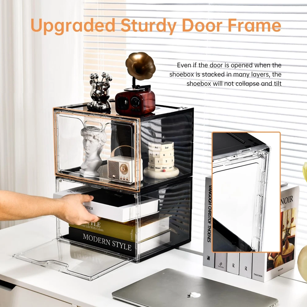 [Transparent New Style Display Design] The clear shoe boxes designed with transparent characteristic,you can quickly choose the shoes which you want at a glance.The Black shoe organizer is also equipped with clear door. Therefore,our shoe display case can be extensively used in entryway,bedroom and closet. [Extra Large Capacity]13.4’’L*10.6”W*8.3”H-The upgraded large shoe display boxes are suitable for US shoe size up to 14,which designed with a larger storage capacity.So don’t worry about the shoe boxes space. The shoe display case can keep your messy shoes well organized.which is suitable for many types of shoes such as boots, leisure, sneakers and high heels. [New Stackable Design & Space Saving]Our shoe storage boxes are equipped with new stackable design,Which you can stack them by placing them directly.In addition,the stackable function can keep the shoe boxes whole very firmly and can be Multi-layered Stacked.And each stackable shoe bins can stay sturdy and easy to carry when integrated. [Magnetic Door and Easy to Open with Single Hand]The shoe storage boxes have built-in magnetic function.The door can be easily opened and closed by the upgraded magnetic suction.In addition,we set vents in the door.Our stackable shoe box has excellent breathability to prevent the accumulation of odor. [Sturdy Material] The shoe organizer is made of sturdy plastic. The stackable shoe boxes can effectively prevent dust from entering in.Easy daily care – clean with mild soap and water.