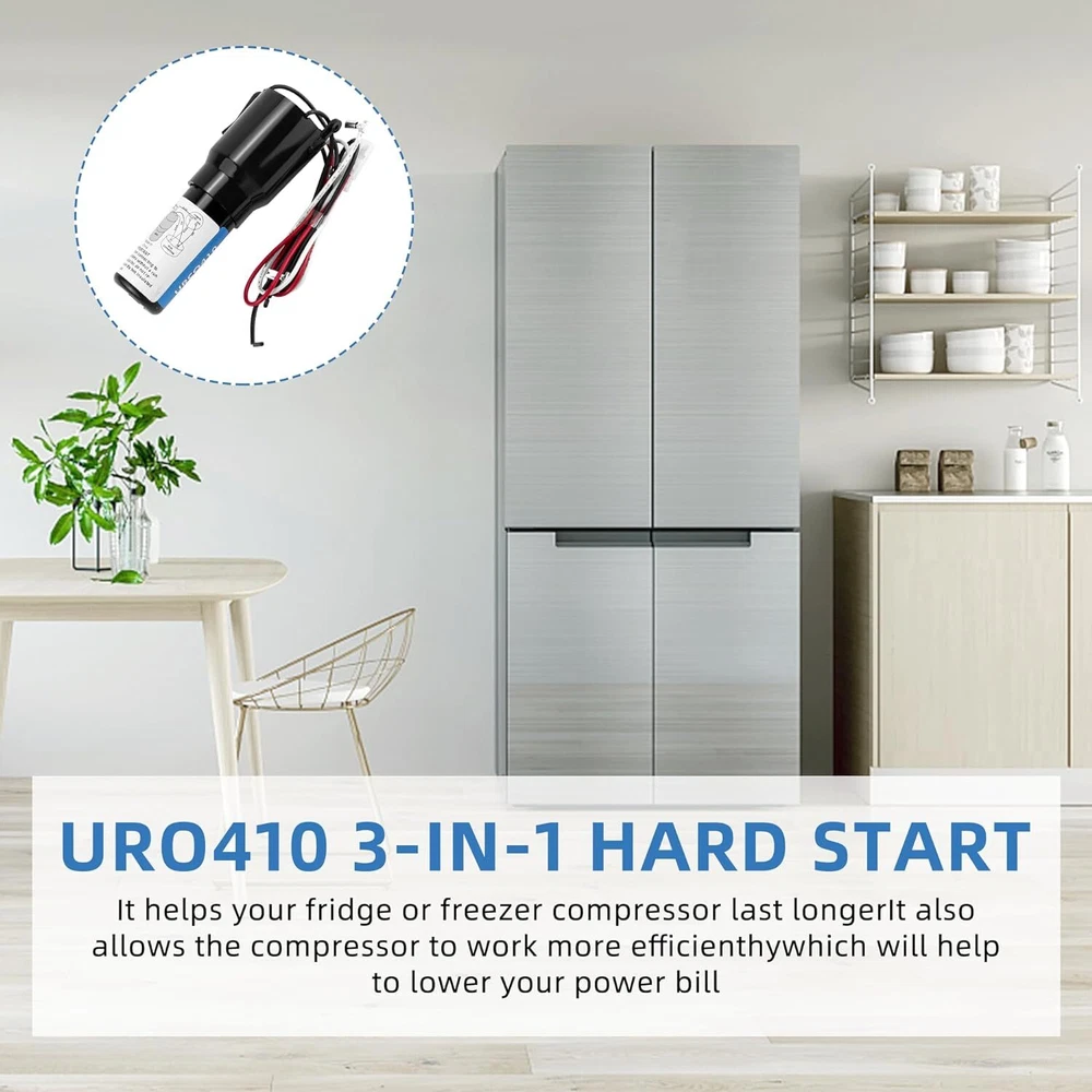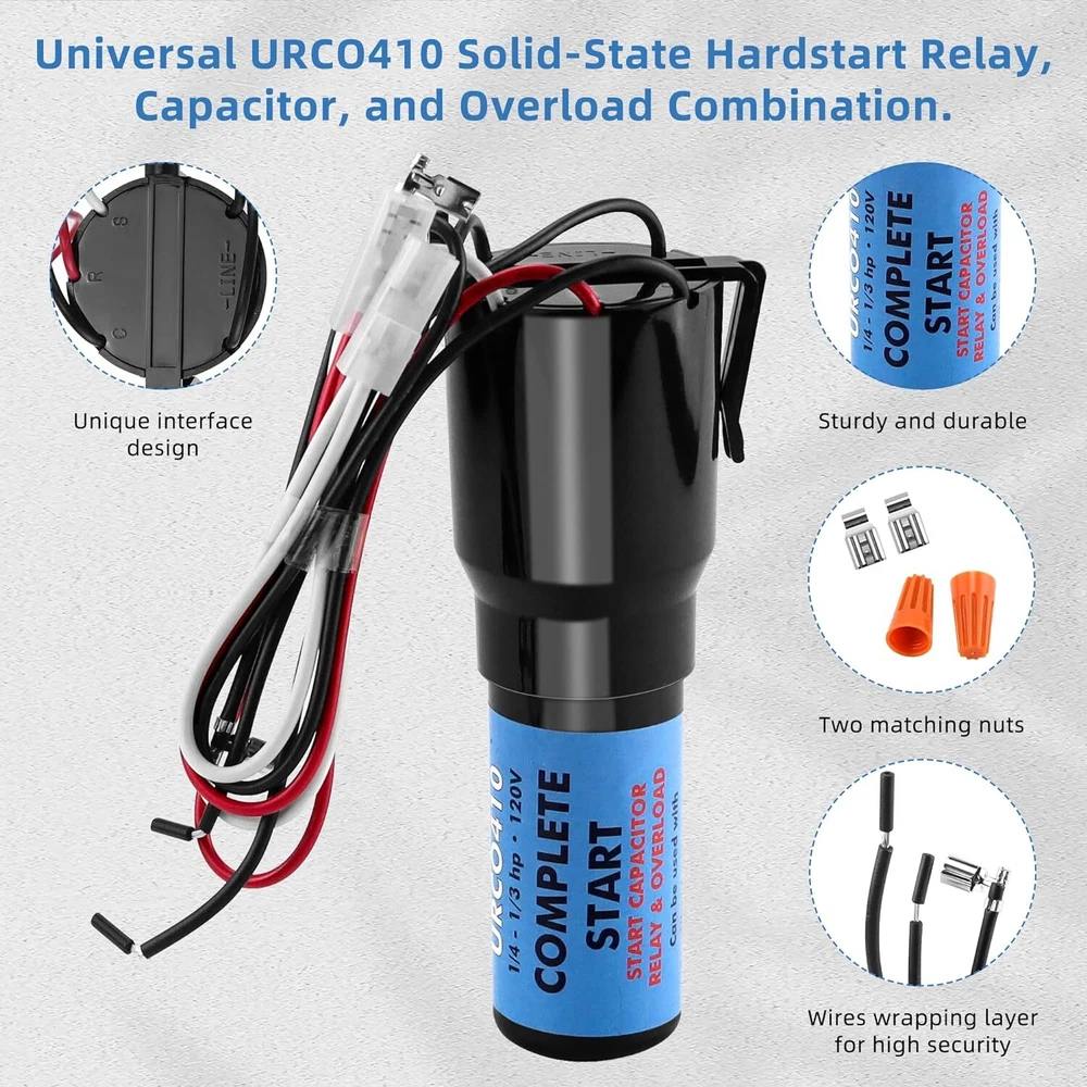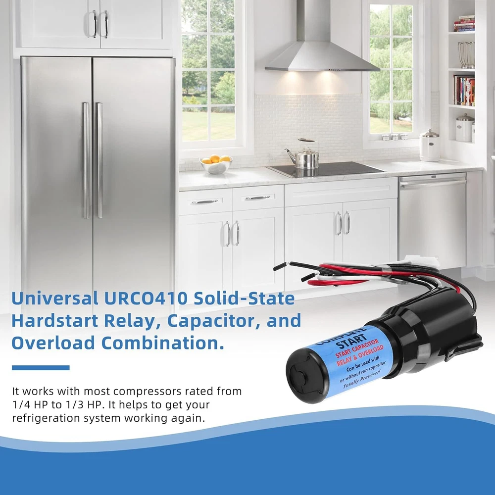 Part number RC0410. This is a Solid State R elay / Overload / Start Capacitor Combination. Good for 1/4 - 1/3 H.P. Compressor Units. 115 Volts. Completely Pre-Wired. Wiring Diagram & Installation Instructions Printed on Package. Replaces all 3 electrical components on all capillary systems. Domestic and Commercial Refrigerators and Freezers.