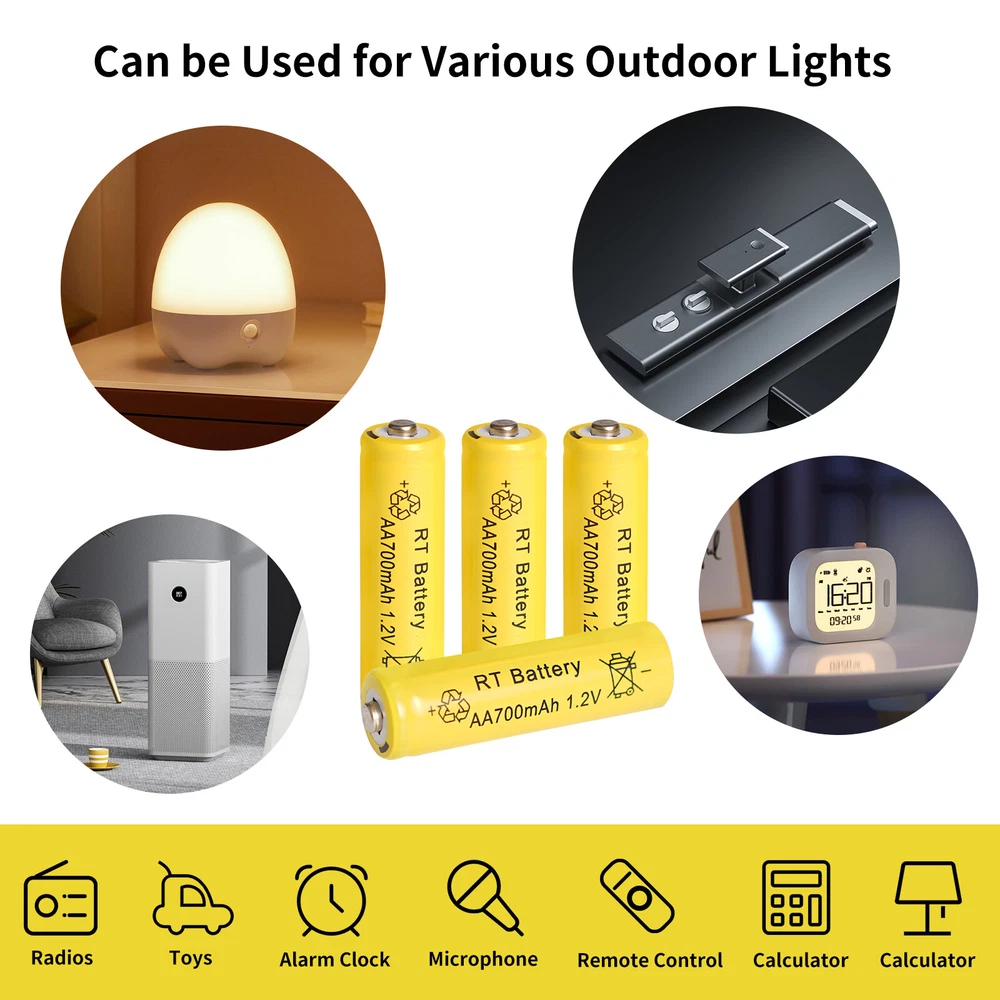 8Pcs 1.2v AA Rechargeable Battery 700mAh Ni-MH Batteries for Solar Lights + Box NiMH AA Rechargeable Battery 1.2v Features: 1.【Widely used】 The AA batteries rechargeable 1.2v is perfect for solar garden lights, landscape lights, lawn lights, etc.It can replace all disposable alkaline batteries for low power electronic products. 2.【Easy to Charge】 The AA rechargeable batteries Ni-MH can be charged by solar lights or standard charging devices. Better high-temperature performance than other types of batteries, can be used from -4℉ to 140℉, and can be charged from the sun even in the snow. 3.【Safe and Reliable】 The Ni-MH AA 1.2v rechargeable battery is very safe and reliable. For transportation safety, these Ni-MH AA batteries are only pre-charged to 30%, so please charge them before use for longer working time. 4.【Durable】 Our Ni-MH AA batteries rechargeable have a capacity of 700mAh and can be recharged at least 500 times continuously. Save you the cost of buying disposable alkaline batteries and reduce the harm to the environment. 5.【Suggestion】 Please charge the battery after each power exhaustion, otherwise it will affect the capacity and life. In addition, charge every 3 months to extend the life of the battery. NiMH AA Rechargeable Battery 1.2v Specification: Capacity: 700mAh Voltage: 1.2V Size: diameter 14mm*50 mm Terminal Type: Button Top Chemistry: Ni-MH (Nickel Metal Hydride) Rechargeable Times: Up to 1000 times No Memory Effect Note: Do not disassemble or modify the rechargeable battery Package Included 8 x Ni-MH AA 700mAh Rechargeable Battery 1.2v 1x AA AAA Battery Box Warm Tips: 1. Before use, please remove the plastic packaging film of the battery. 2. Please check the "+" and "—" directions of the battery before you charge the battery. 3. Do not put the product into fire, short circuit, dissassemble and extrude. 4. Do not mix charging with different type of batteries, which may explode or leak, causing personal injury. 5. Please use up the power each time, then recharge it otherwise it will affect its capacity and lifetime. 6. Please take out the battery if you won't use for a long time to avoid battery leakage. 7. Note:Please find us in first time when you find the parcel Broken/Scratch/Function Error/Miss Parts/Unwork/has not arrived etc, we always have more details and solutions, even duty for your order. On Dec 27, 2024 at 23:01:09 PST, seller added the following information: