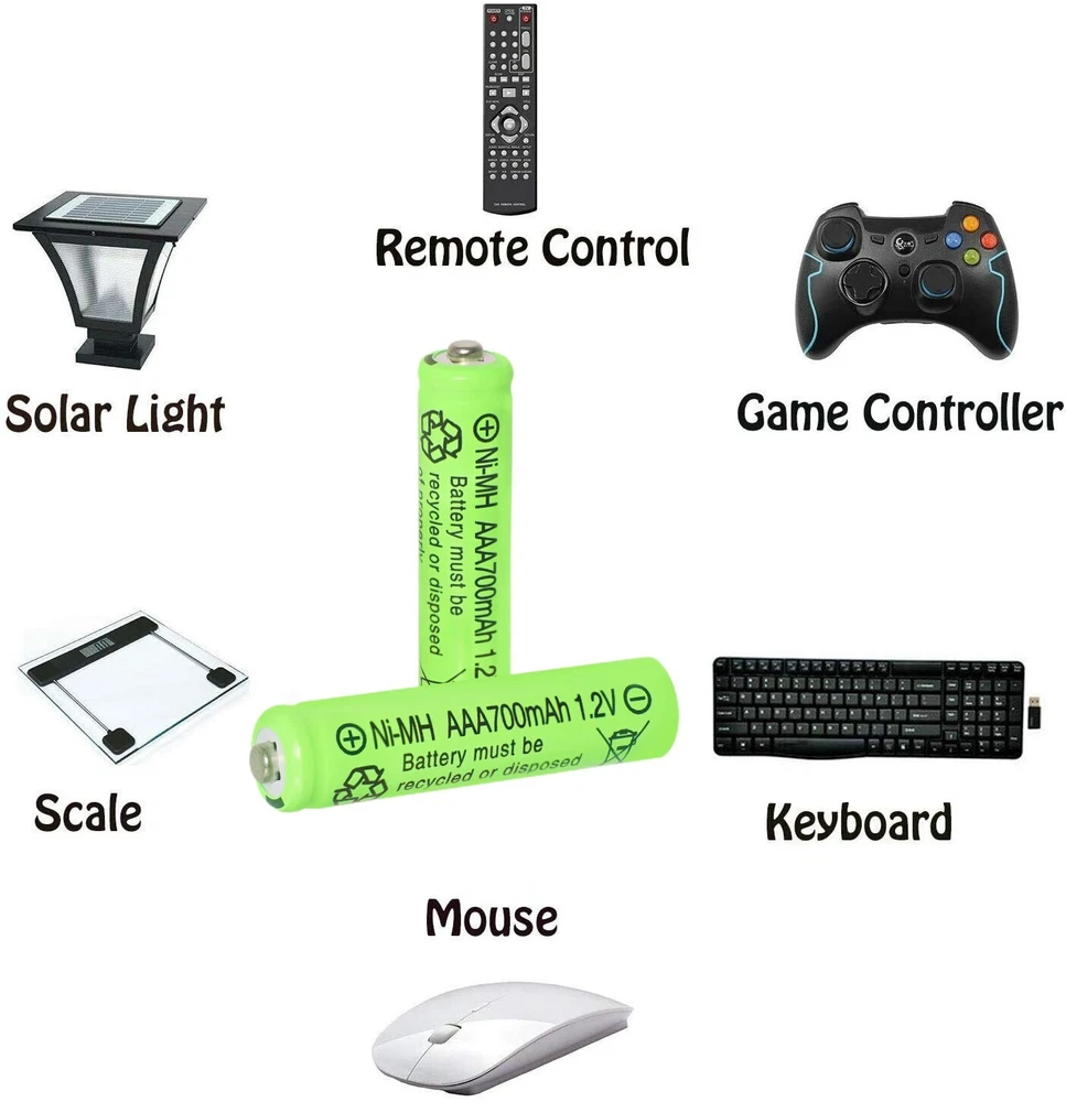 8Pcs AA & 8Pcs AAA Ni-MH Rechargeable Batteries 1.2v with Plastic Storage Case Warm Tips: Before use, please remove the plastic packaging film of the battery. AA / AAA NiMH Battery 1.2v Features: 1.【Widely used】 The AA batteries rechargeable 1.2v is perfect for solar garden lights, landscape lights, lawn lights, etc.It can replace all disposable alkaline batteries for low power electronic products. 2.【Easy to Charge】 The AA rechargeable batteries Ni-MH can be charged by solar lights or standard charging devices. Better high-temperature performance than other types of batteries, can be used from -4℉ to 140℉, and can be charged from the sun even in the snow. 3.【Safe and Reliable】 The Ni-MH AA 1.2v rechargeable battery is very safe and reliable. For transportation safety, these Ni-MH AA batteries are only pre-charged to 30%, so please charge them before use for longer working time. 4.【Durable】 Our Ni-MH AA batteries rechargeable have a capacity of 700mAh and can be recharged at least 500 times continuously. Save you the cost of buying disposable alkaline batteries and reduce the harm to the environment. 5.【Suggestion】 Please charge the battery after each power exhaustion, otherwise it will affect the capacity and life. In addition, charge every 3 months to extend the life of the battery. NiMH AA Battery 1.2v Specification: Capacity: 700mAh Voltage: 1.2V Size: diameter 14mm*50 mm Terminal Type: Button Top Chemistry: Ni-MH (Nickel Metal Hydride) Rechargeable Times: Up to 1000 times No Memory Effect Note: Do not disassemble or modify the rechargeable battery NiMH AAA Battery 1.2v Specification: Capacity: 700mAh Voltage: 1.2V Size: diameter 10mm*44 mm Terminal Type: Button Top Chemistry: Ni-MH (Nickel Metal Hydride) Rechargeable Times: Up to 1000 times No Memory Effect Note: Do not disassemble or modify the rechargeable battery Package Included: 8X Ni-MH AA 1.2v Rechargeable Battery 700mAh 8X Ni-MH AAA 1.2v Rechargeable Battery 700mAh 4X Plastic Battery Storage Cases Warm Tips: 1. Before use, please remove the plastic packaging film of the battery. 2. Please check the "+" and "—" directions of the battery before you charge the battery. 3. Do not put the product into fire, short circuit, dissassemble and extrude. 4. Do not mix charging with different type of batteries, which may explode or leak, causing personal injury. 5. Please use up the power each time, then recharge it otherwise it will affect its capacity and lifetime. 6. Please take out the battery if you won't use for a long time to avoid battery leakage. 7. Note:Please find us in first time when you find the parcel Broken/Scratch/Function Error/Miss Parts/Unwork/has not arrived etc, we always have more details and solutions, even duty for your order. On Dec 27, 2024 at 23:01:12 PST, seller added the following information: