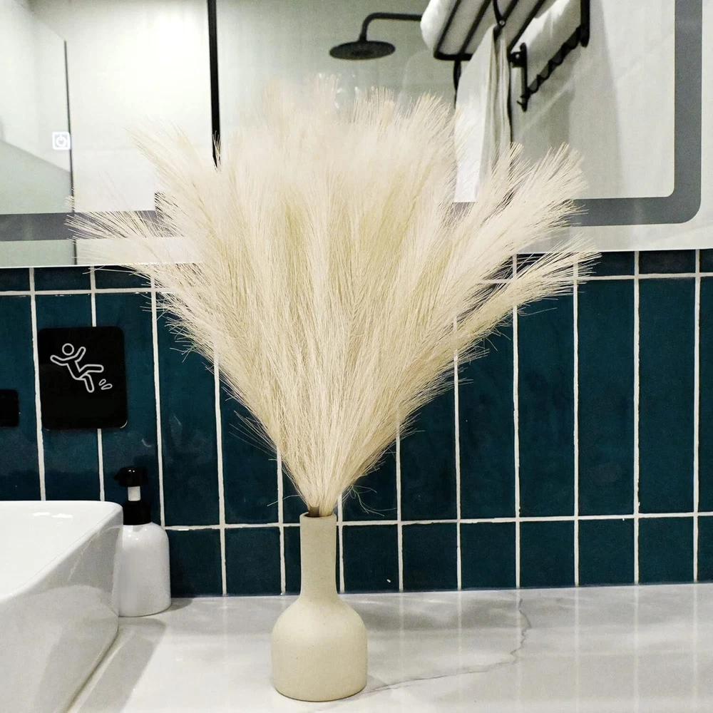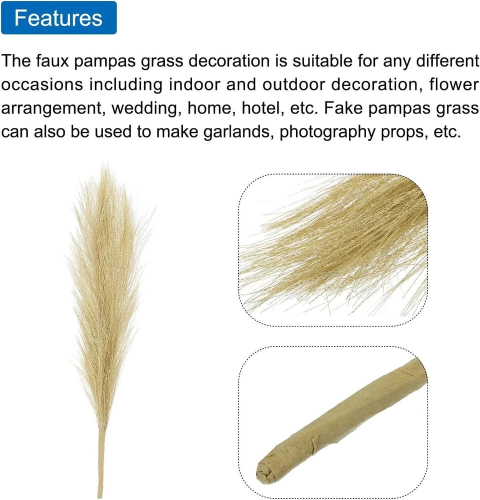 About this item Artificial pampas grass with stylish and natural look is perfect for vase filler. The faux pampas grass decoration is suitable for any different occasions including indoor and outdoor decoration, flower arrangement, wedding, home, hotel and anywhere you want to decorate. Fake pampas grass can also be used to make garlands, photography props, etc. Fake Pampas Grass,Color: Golden;Material: Fabric;Pampas grass size: 17.7 inches / 45cm;In the package of: 8Pcs x faux pampas grass; Faux pampas grass, soft and fluffy can be matched with any decorations, adding romantic atmosphere. Artificial pampas grass will not fall off, no smell, will not make people feel uncomfortable, no effect on people's body. The stems are durable and do not require maintenance and can be used for a long time. You can pair faux reed decor with a variety of other real plants and flowers to create a variety of exquisite looking DIY floral arrangements. Carefully shake each stem before use to remove excess fur and help the feathers open. Note: Please understand that there may be slight color differences due to different lighting and monitor differences.