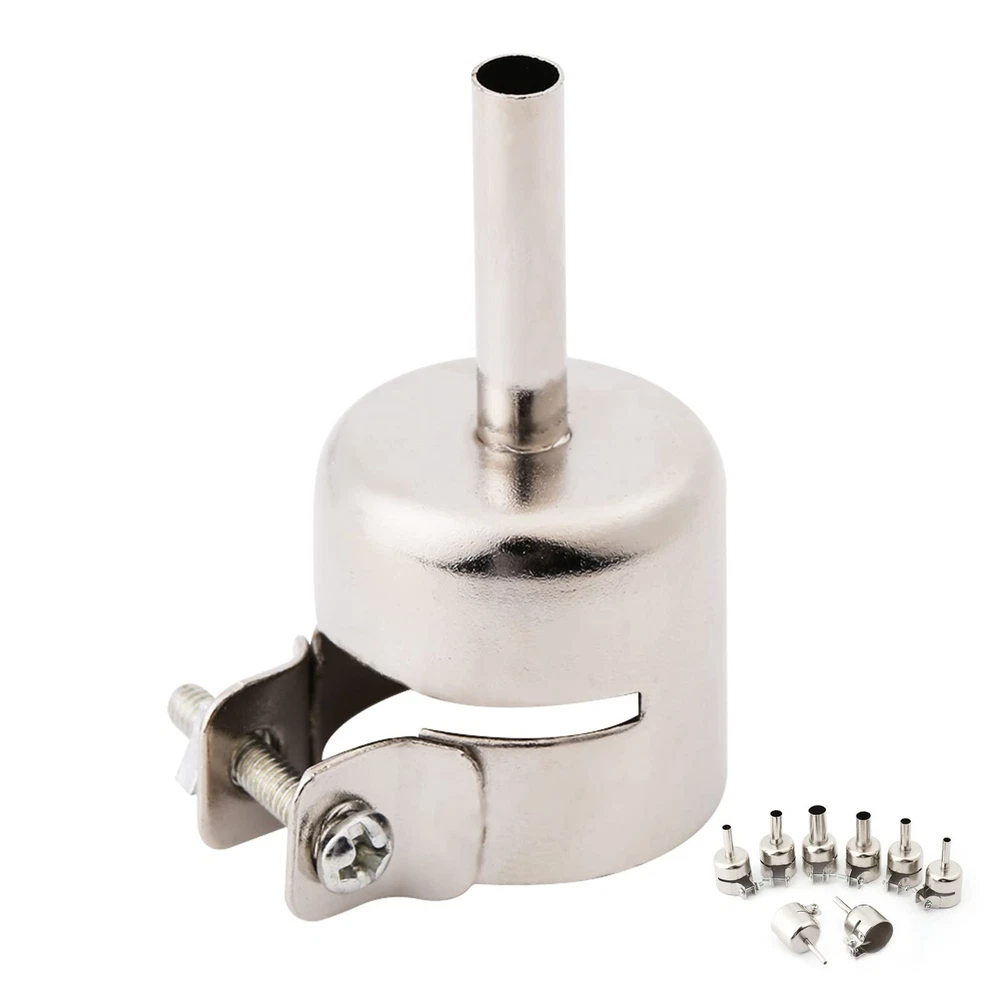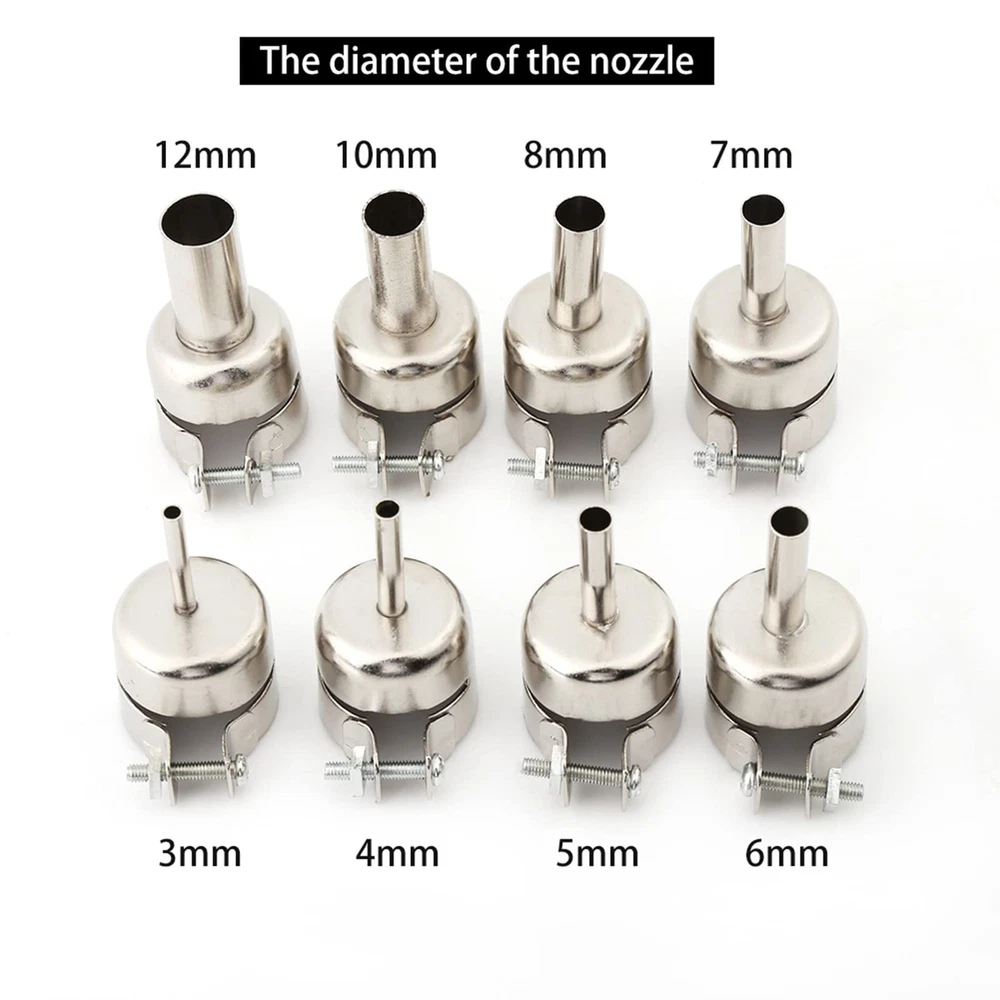Features: Compatible for 850 850A 852 852D 852D+ and air pump type hot air soldering station. These nozzles are adopted of good quality steel, not easy to rust. With the lock screw which can lock the nozzle firmly, so effectively avoid hot air from escaping between nozzle and the heat gun air outlet steel pipe. 8pcs/set, include size: 3mm, 4mm, 5mm, 6mm, 7mm, 8mm, 10mm, 12mm. It is suitable for many kinds of hot air soldering station, exquisite workmanship, with long service life. Specifications: Material: stainless steel Shape: round Diameter: round 3/4/5/6/7/8/10/12mm Weight:105g Package Included: 8 x nozzles Hot Air Soldering Kit: 8/set, including 3mm, 4mm, 5mm, 6mm, 7mm, 8mm, 10mm and 12mm Wide Range of Applications: Heat gun nozzles are suitable for 850 850A 852D 852D+ and air pump hot air soldering stations Specialized Manufacturing: The heat gun nozzle is made of stainless steel, which is rust-resistant, and the body is rugged, stable and reliable Safe and Reliable: Hot air soldering kit has a locking screw that securely locks the nozzle to prevent hot air from escaping between the nozzle and the air tube of the heat gun Customer Experience: If you receive the hot air soldering kit and have any questions, please contact us, we will answer for you